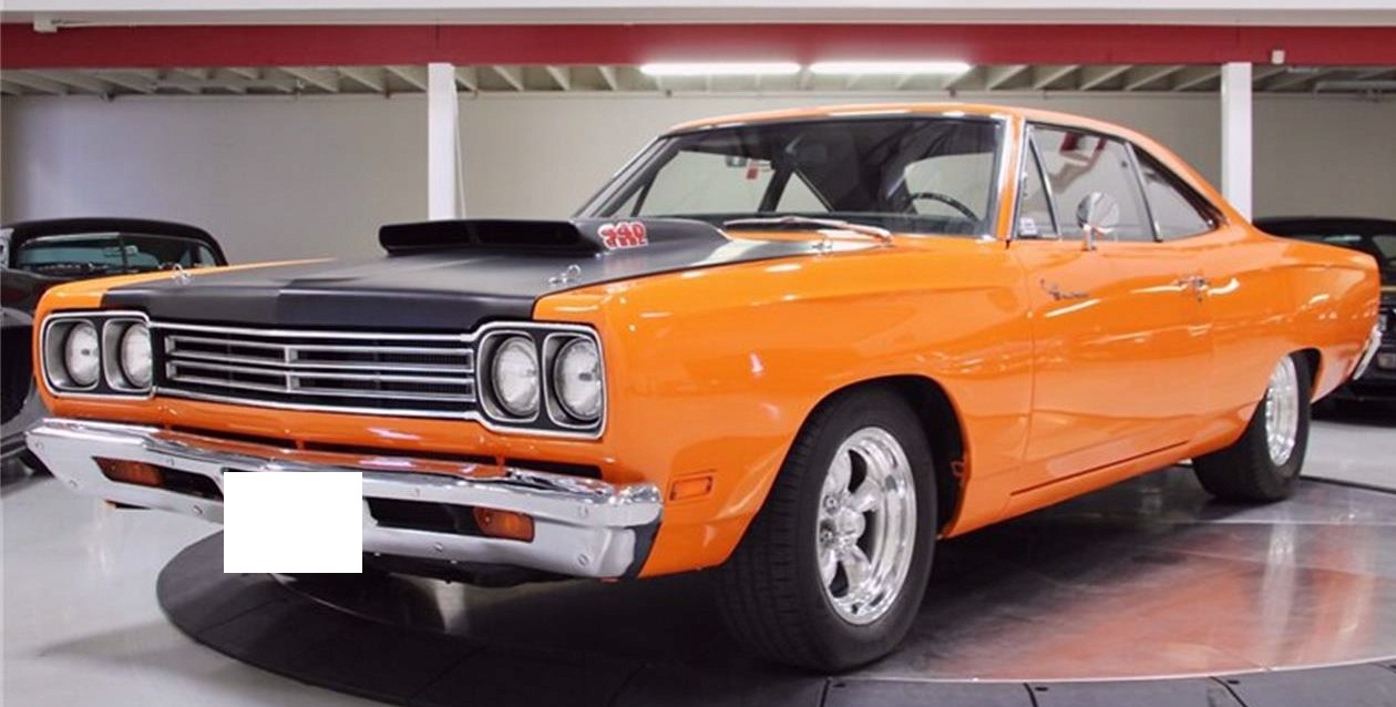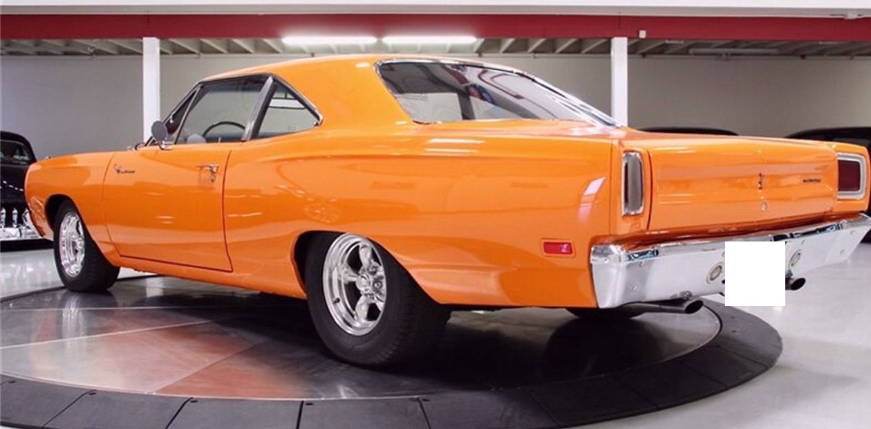 1969 Plymouth Road Runner in Vitamin C Orange over Black Interior. Equipped with a 440ci V8 Engine mated to a 4-Speed Manual Transmission. Steel crank. Ported heads. Edelbrock hi-rise TM7 intake manifold. Holley 750 double pumper carb. 8-3/4 Rear end with 3.55 gears. Lift-off fiberglass hood. American Racing 15"" wheels