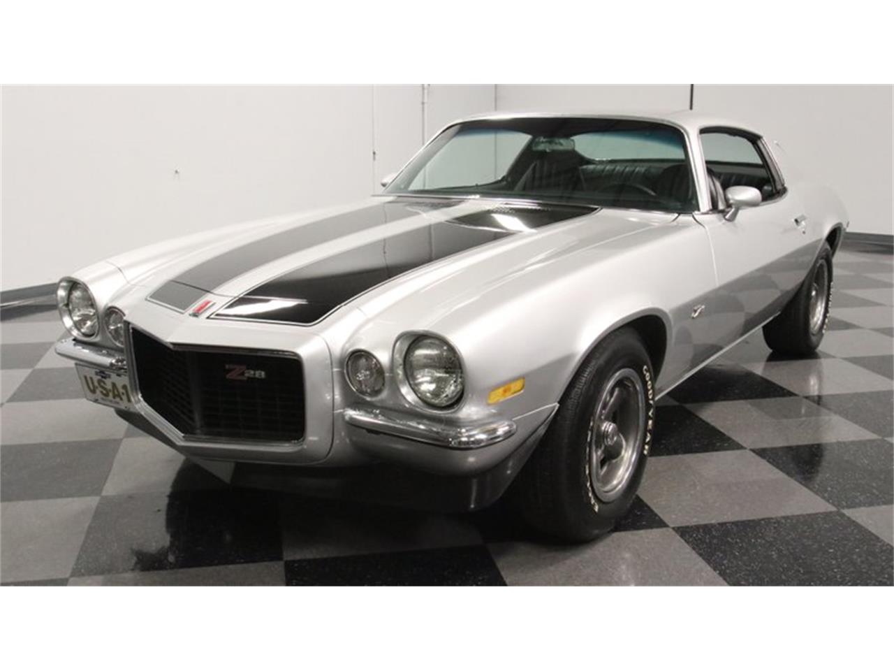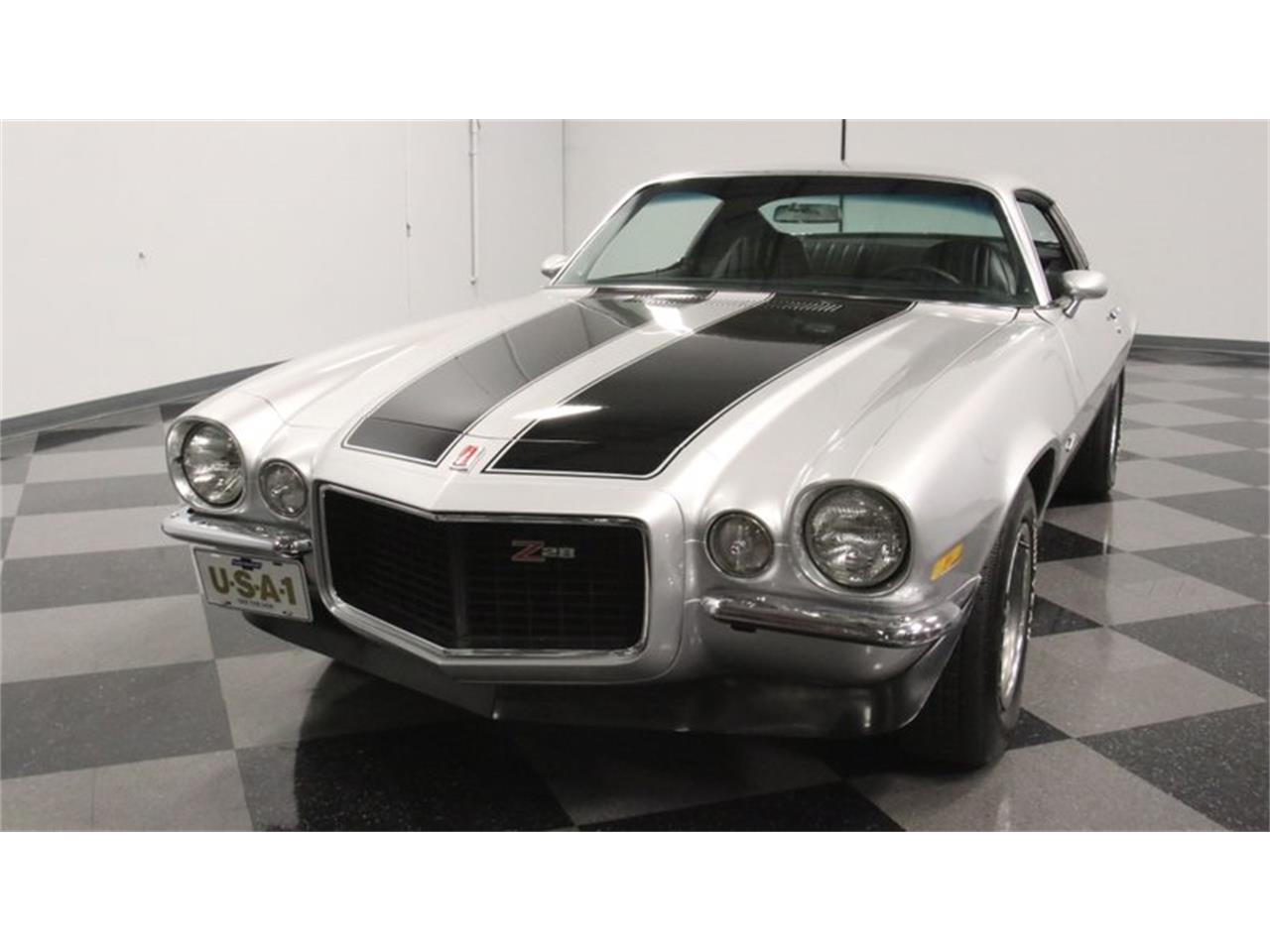 1971 Chevrolet Camaro Z/28 RS real-deal Z-car finished in its factory-correct colors is already alluring. The 350 cubic-inch motor has the tidy look of power as the bold block, bright air topper, and ribbed valve covers all radiate within the engine bay. This V8 inhales deeply with a Holley four-barrel carburetor and Pro Comp intake. And long tube headers add power while contributing to the rumble of the dual exhaust. The TH400 three-speed transmission is a stout unit that also provides automatic shifting comfort. And the same well-balanced sport and comfort experience is seen in features like power brakes w/discs up front, power steering, and sway bars front & rear. All the black on the exterior also gets you ready for the full black interior. This has a great vintage style that mixes with a true driver's machine. For example, the high back bucket seats have the correct-presentation, right down to the button-top finish. Deep color on the seats, door panels, carpeting, and headliner reinforce the feeling of a well-respected classic. The grippy NK4 sports steering wheel, horseshoe shifter in the center console, and large speedo and tach in the wraparound dash are all part of a package built around you. So while there's an upgraded AM/FM/cassette stereo nicely integrated into the dash, we really know your favorite soundtrack begins under the hood.