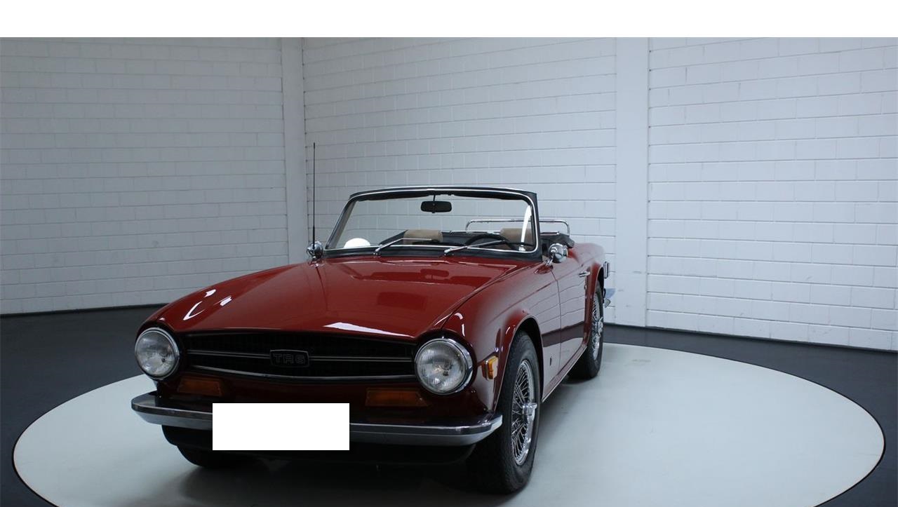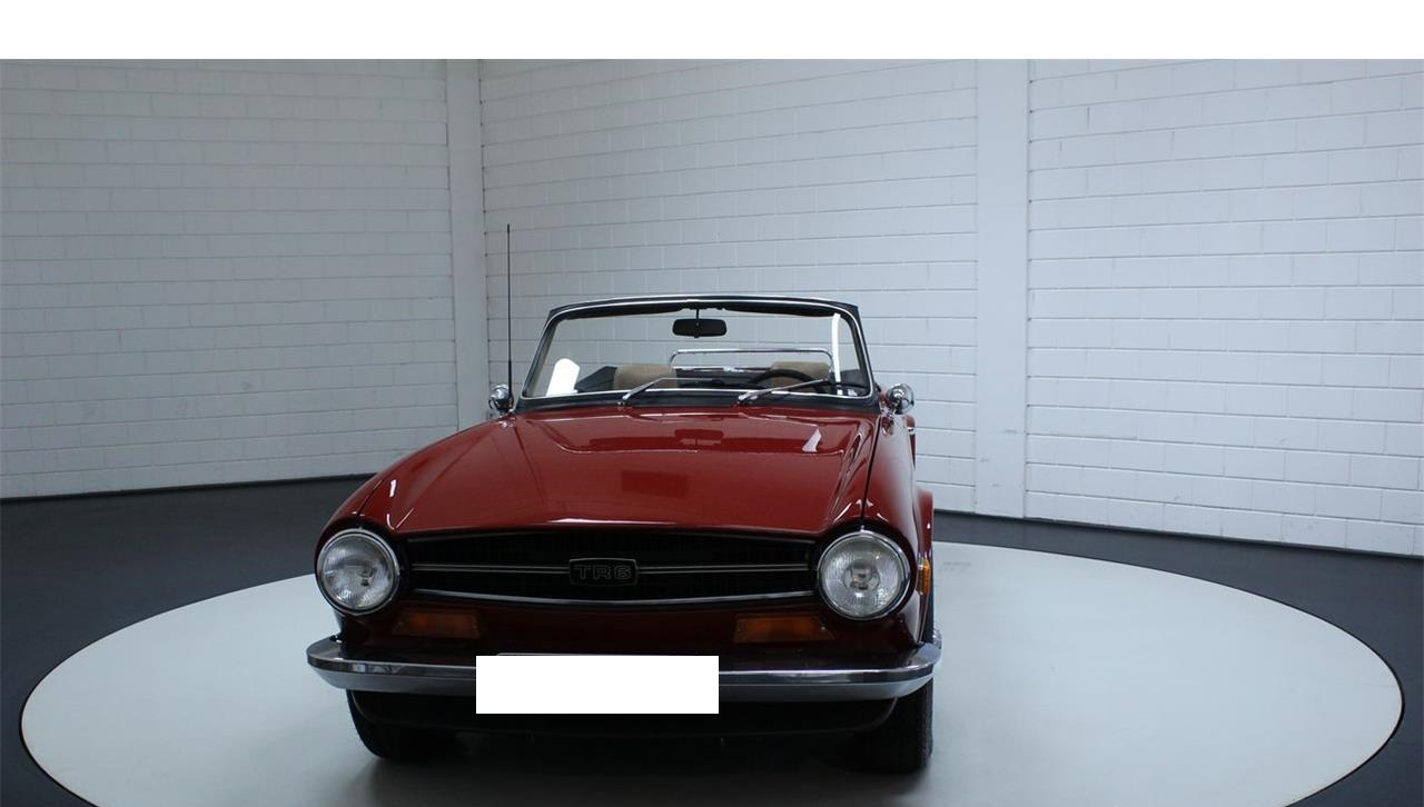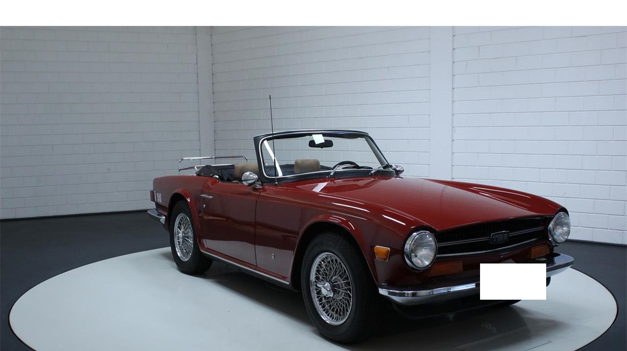 Triumph TR6 1973 chrome wire wheels. This Triumph is equipped with its correct type 2.5 liter 6-cylinder engine and a manual gearbox. The beloved beautiful burgundy red colour combines well with the beautiful brown interior. This TR6 has chrome details, such as chrome wire wheels and a chrome luggage rack.