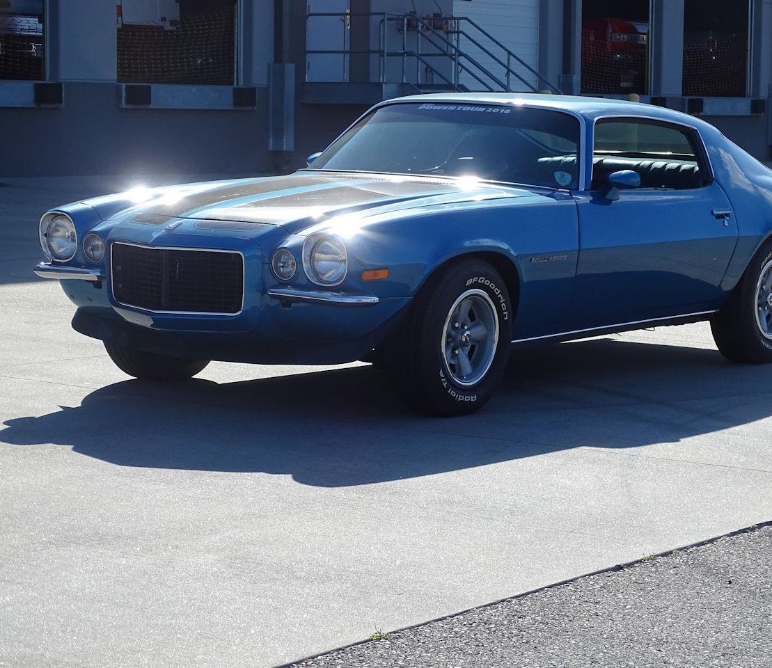 Backing the V8 is a TH350 automatic transmission that shifts smoothly through all the gears, making for a sporty drive. This modern muscle combo suits this Camaro nicely and is equally matched by its exterior. The exterior is the original Blue with black stripes, and the interior is also blue which is shown as 26 26 on the trim tag.