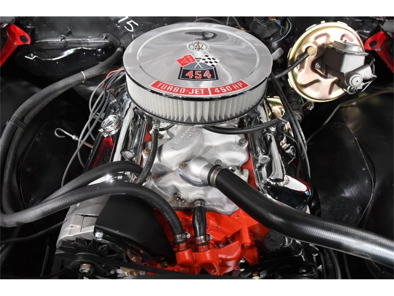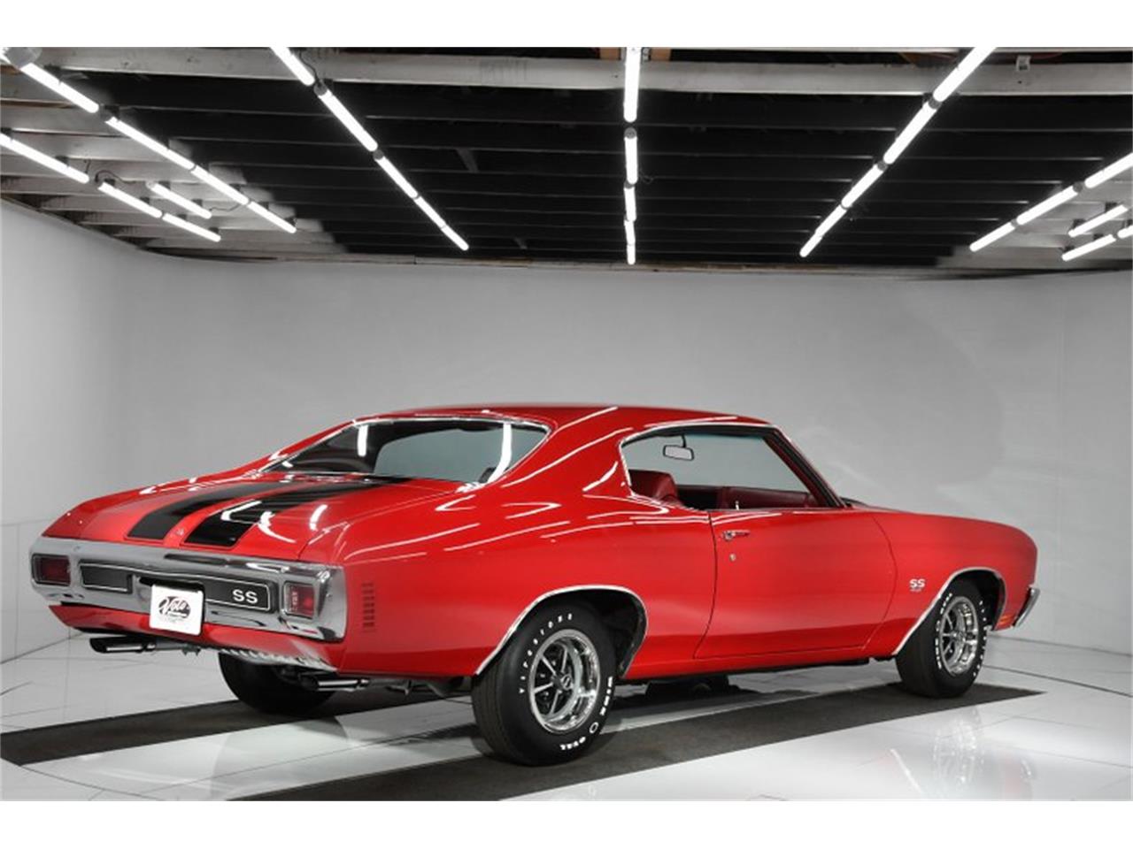 The poster child of the muscle car era- a red 1970 Chevelle SS 454 with black stripes.
