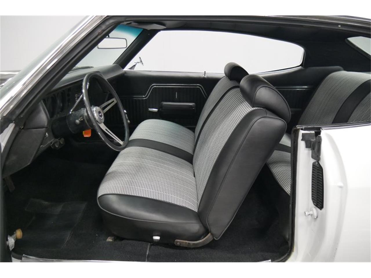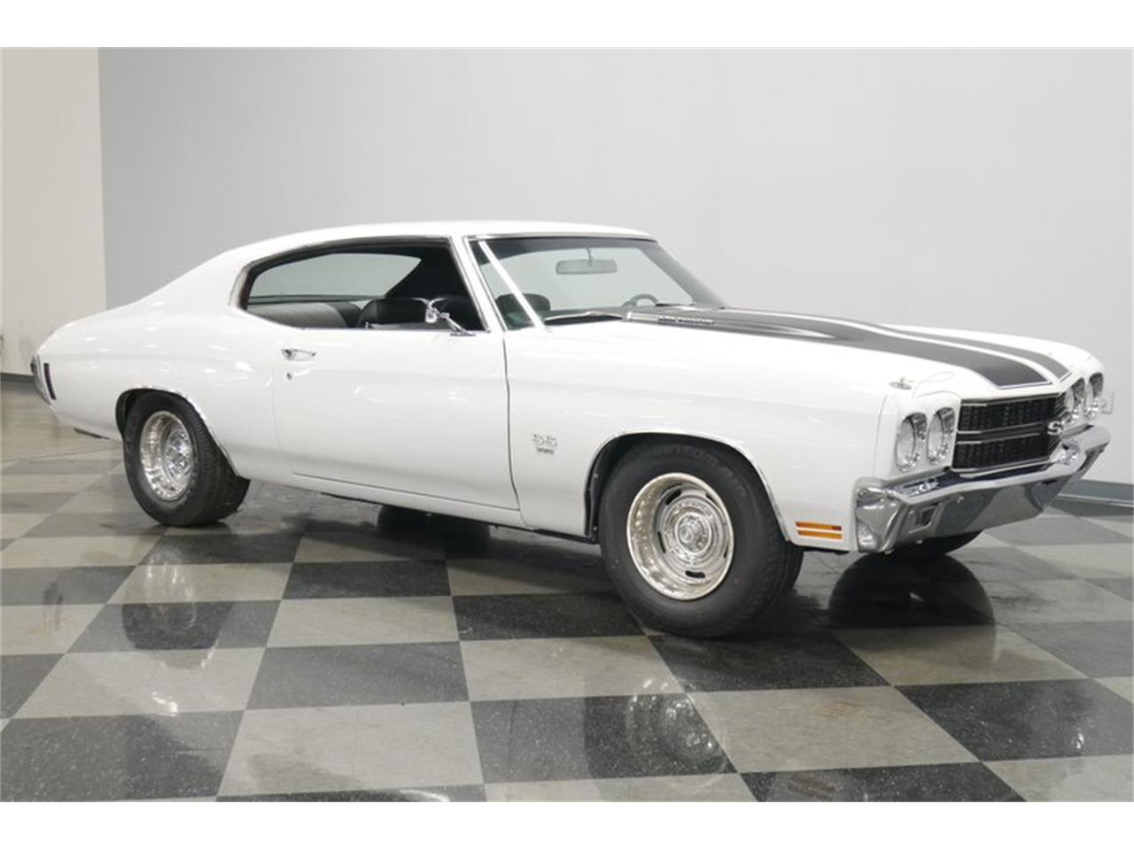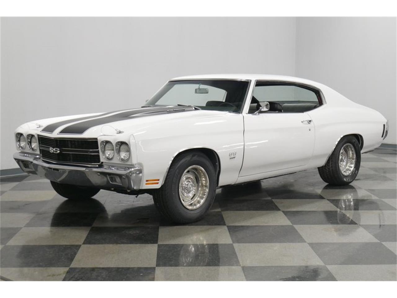 1970 Chevrolet Chevelle SS for sale. The clean white look of the exterior extends to the engine bay with the smooth inner fenders funneling all your attention to the big block in the middle. This 454 cubic-inch V8 has a nice look with a bright block and plenty of shine on the valve covers, air topper, alternator, and more. Plus, there's plenty of substance behind the style with upgrades like a Holley four-barrel carburetor, Edelbrock Victor intake, an aluminum radiator, and long tube headers feeding the Flowmaster dual exhaust. The TH400 three-speed automatic is the numbers-matching unit for the car. Plus, this has the right SS suspension features like an L34-code 12-bolt rear, boxed rear control arms, and a rear sway bar. Add in power steering and power brakes w/discs up front, and this is the Chevelle SS that was made for easy cruising. Inside, they upgraded the upholstery from a standard black to a tasteful black and white houndstooth.