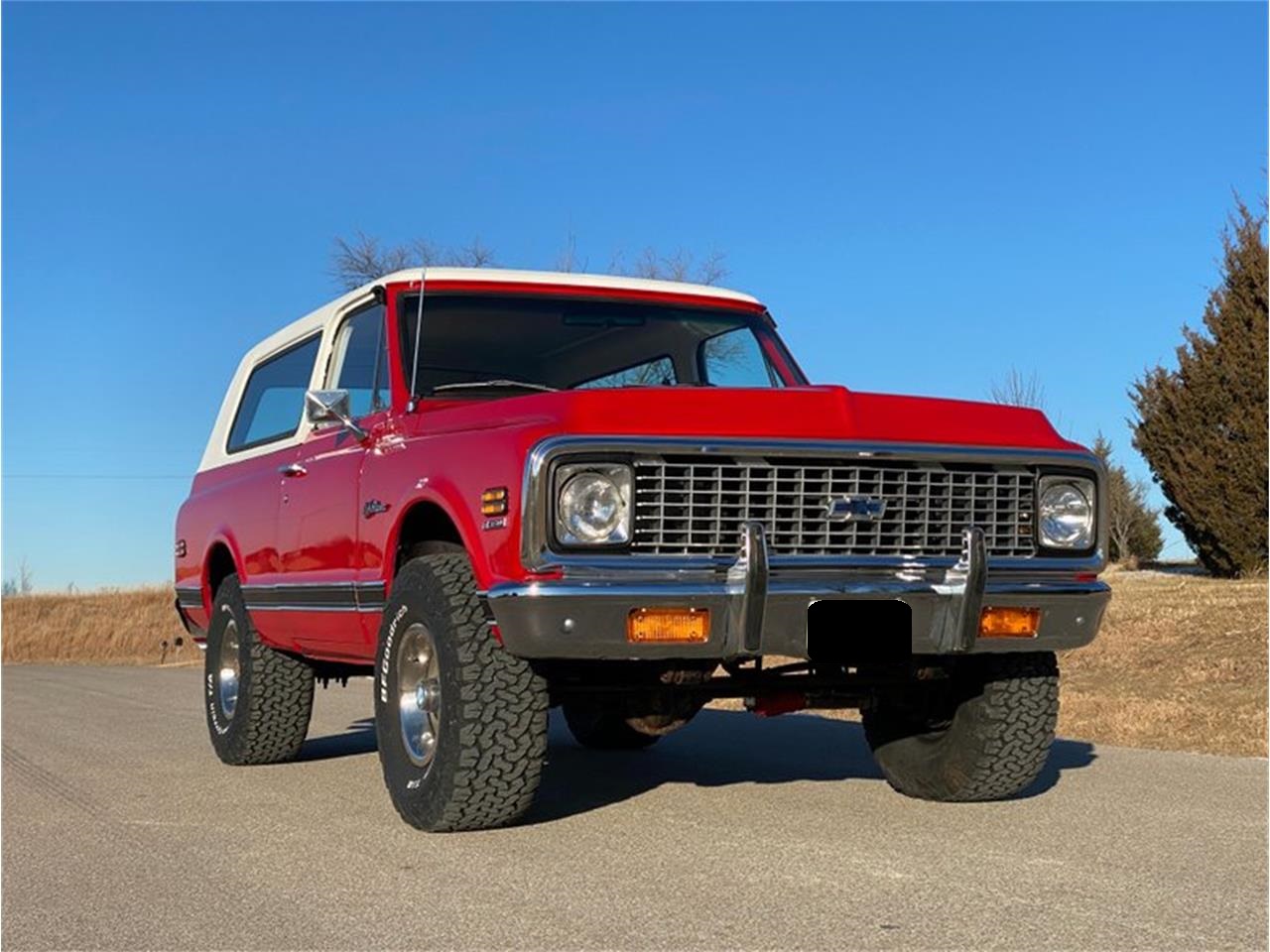 1972 Chevrolet Blazer. It is finished in Bright Red that looks good enough to eat. The bumpers have been rechromed and look beautiful. The interior is upholstered in a very unique plaid interior. It is powered by a strong running 350ci \ 5.7L V8 and this is mated to a smooth shifting Automatic Transmission. The engine compartment is fully detailed. It rides on New factory 15x8 Truck Rally Wheels and New BFG 33x12.50R15LT tires. It is equipped with Power Steering, Power Brakes, Tinted Glass, Locking Hubs and much more.