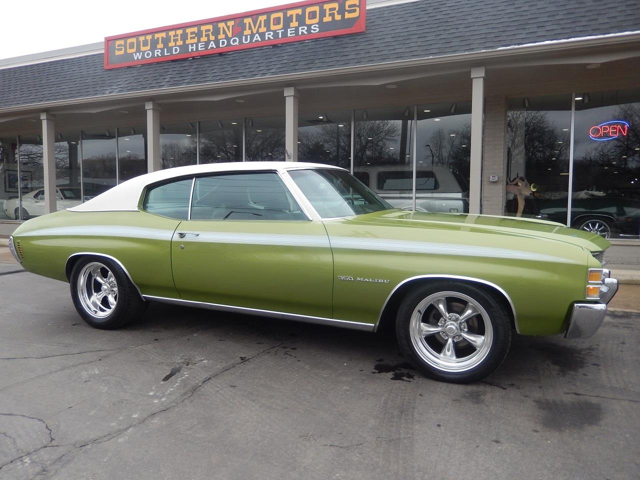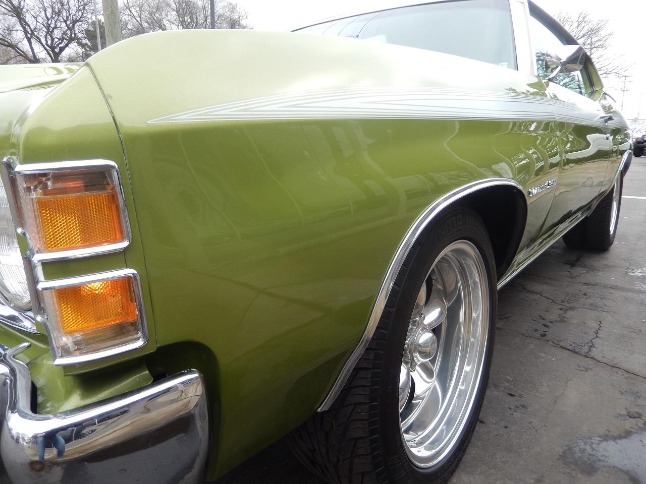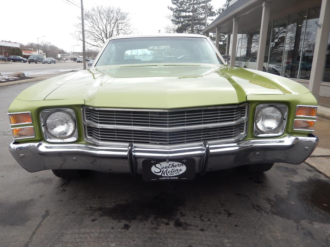 Clean Original Van Nuys California built car, factory (43) Lime green metallic, factory (730) Dark Jade vinyl interior, white vinyl top, Heavy Chevy stripe, matching numbers 350 ci engine, Edelbrock 4 bbl, Edelbrock aluminum intake, mild camshaft, factory exhaust manifolds, chrome air cleaner, finned aluminum valve covers, HEI distributor, power steering, power front disc brakes, 350 turbohydramatic transmission, factory bench seat, factory dash, am-fm radio, Flowmaster dual exhaust with chrome tips, factory 10 bolt 3.