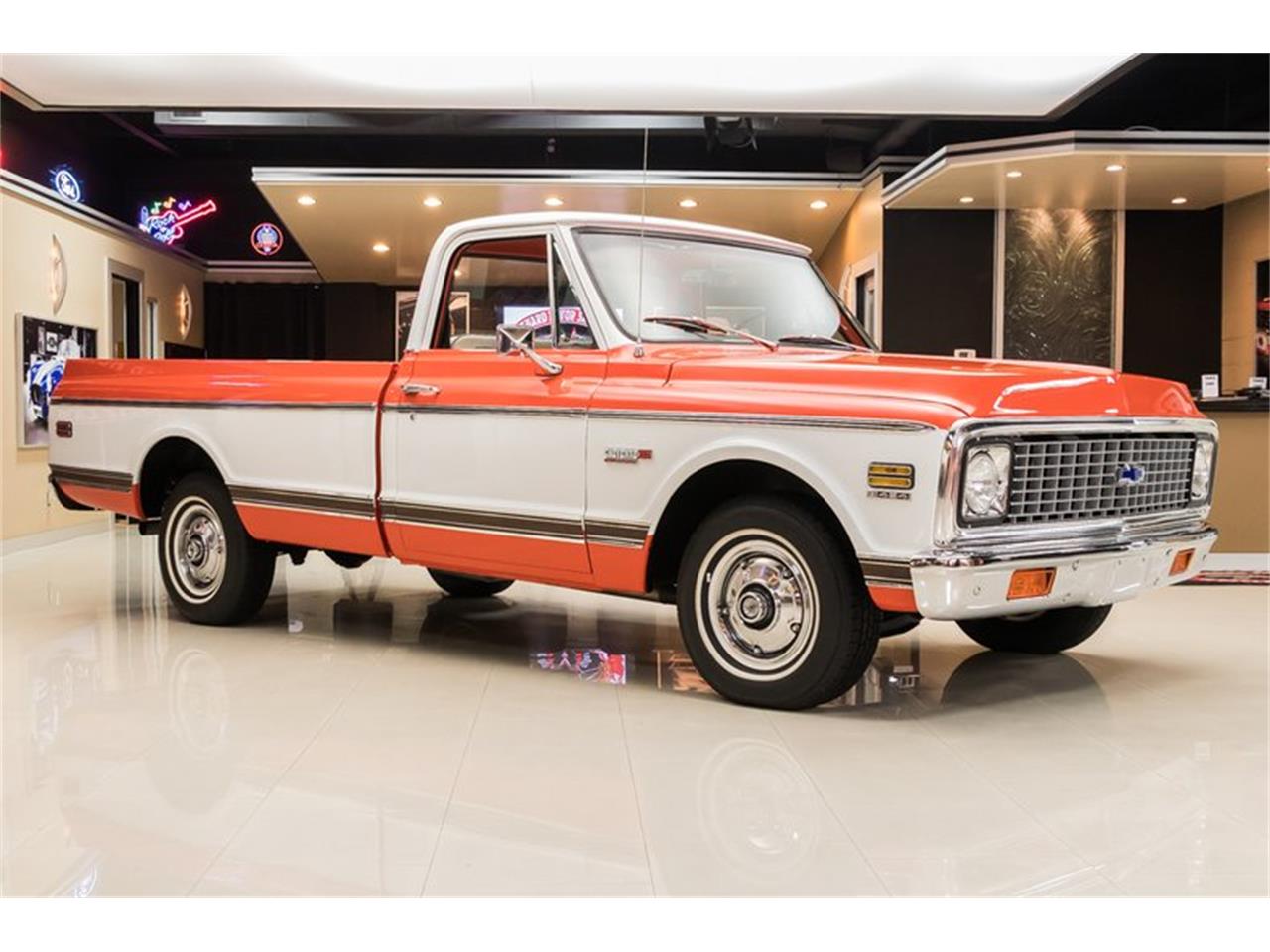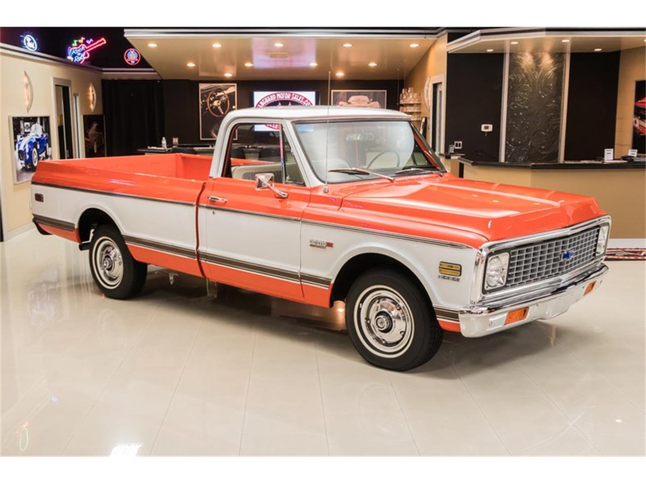 Check out this awesome 1971 Chevrolet C-10 Cheyenne Pickup! This Cheyenne has a beautifully straight body, glossy Orange and White Paint finish, White Houndstooth Interior, Wood Bed, Whitewall Tires, Dual Exhaust, and Polished Components all over that's sure to grab attention wherever you go.