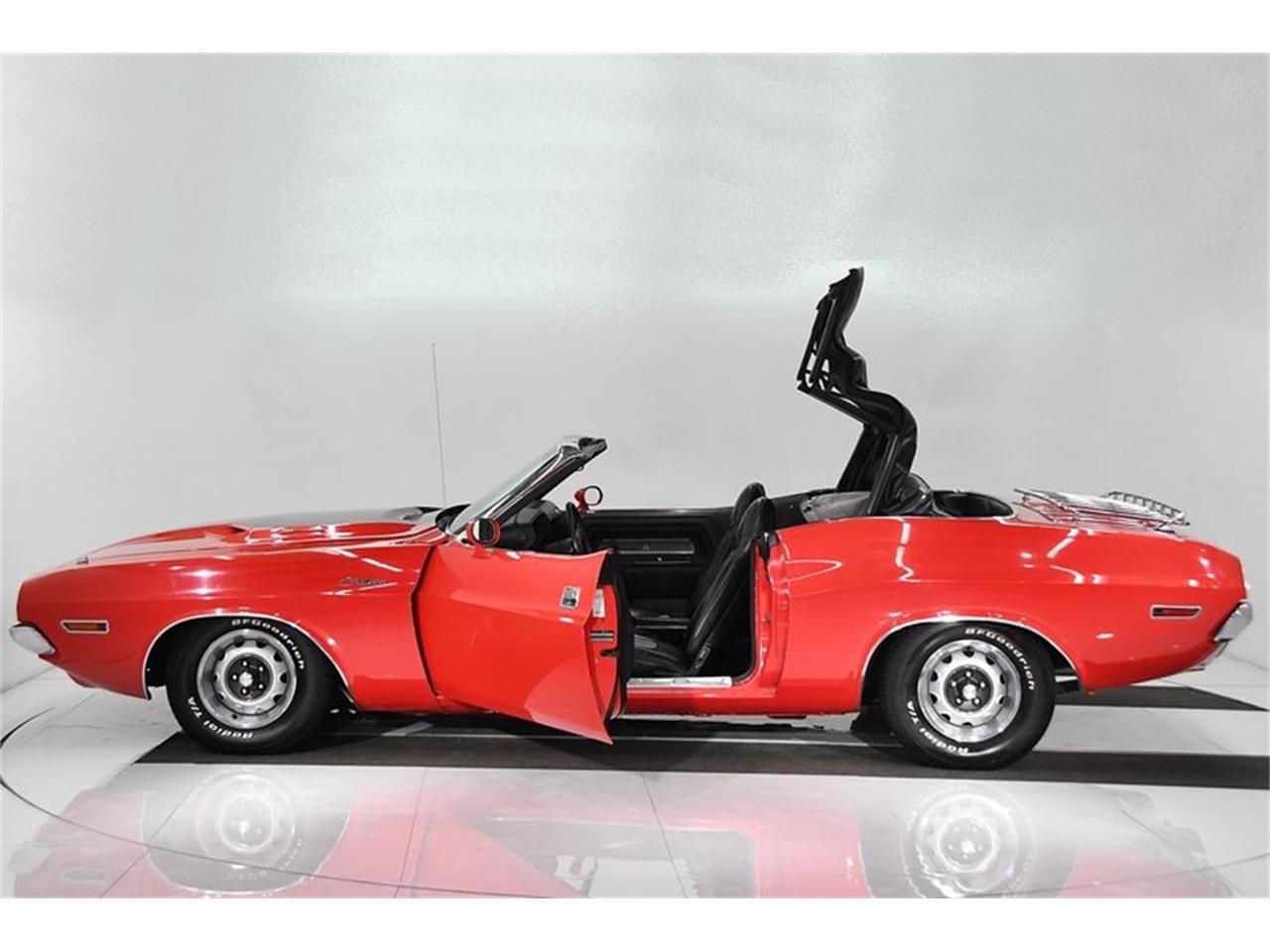 Very rare. Genuine red, 340 HP car full of options. Very solid car. Body is straight and fits really well. The paint is very glossy. Features include Sport hood with black stripe, hood mounted turn signals, racing mirrors, luggage rack, pop up chrome gas cap and Rallye wheels. Front bumper is very bright. The windshield looks new, door handles are excellent. The luggage rack is mint. Door jambs are nice, bottom of the doors are clean, has the original VIN number sticker and the weather strips are soft. Black convertible top is very good. Has correct grained material and glass window. Original plastic grained side panels are in excellent shape. Has Legendary upholstery. Console and instrument area are very nice, not broken or damaged. Has original slap stick shifter. Modern stereo, h.d. 6x9 speakers behind the seat. Has tachometer mounted below the dash. Visors, mirror, seat belts vents are very nice. 340 high performance motor. Upgraded aluminum intake, Holley Street Avenger carb and headers. Everything is neat and orderly. All the components on the firewall are nice, wiper motor looks new, has cowl seal and vents. The factory air conditioning system is entirely complete. Alternator looks new. Has proper radiator shroud, fan and big radiator. Options also include power steering and power brakes. The metal looks really nice and clean, painted a gloss red. Solid metal trunk compartment. Includes a matching rally wheel and BFGoodrich tire for a spare. Has the complete jack assembly and rubber mat. Weatherstrip is excellent. Very solid, clean frame rails. Has disc brakes in front. Custom 2 1/2 inch exhaust system. Has crossover pipe and correct exhaust tips. Has 727 Torqueflite auto trans and 8 3/4 sure grip rear with 3.55 gears. This is a rare Challenger convertible that is full of factory options!
