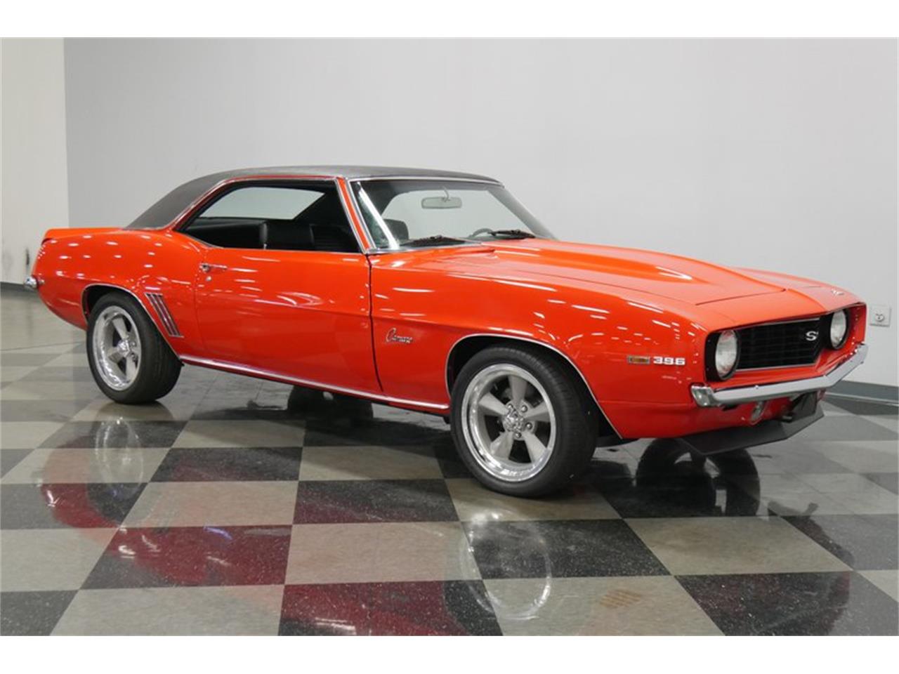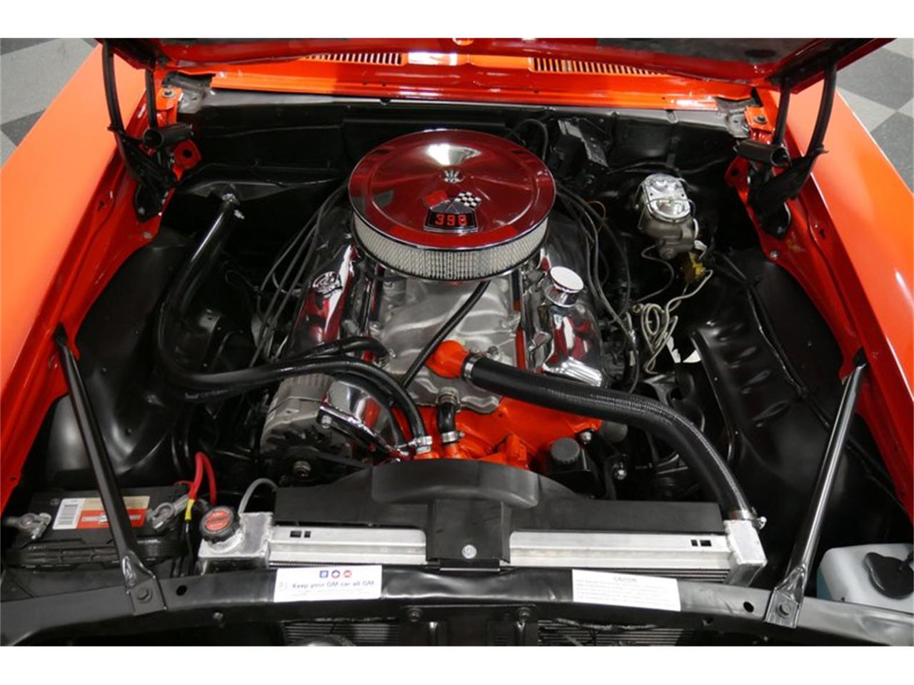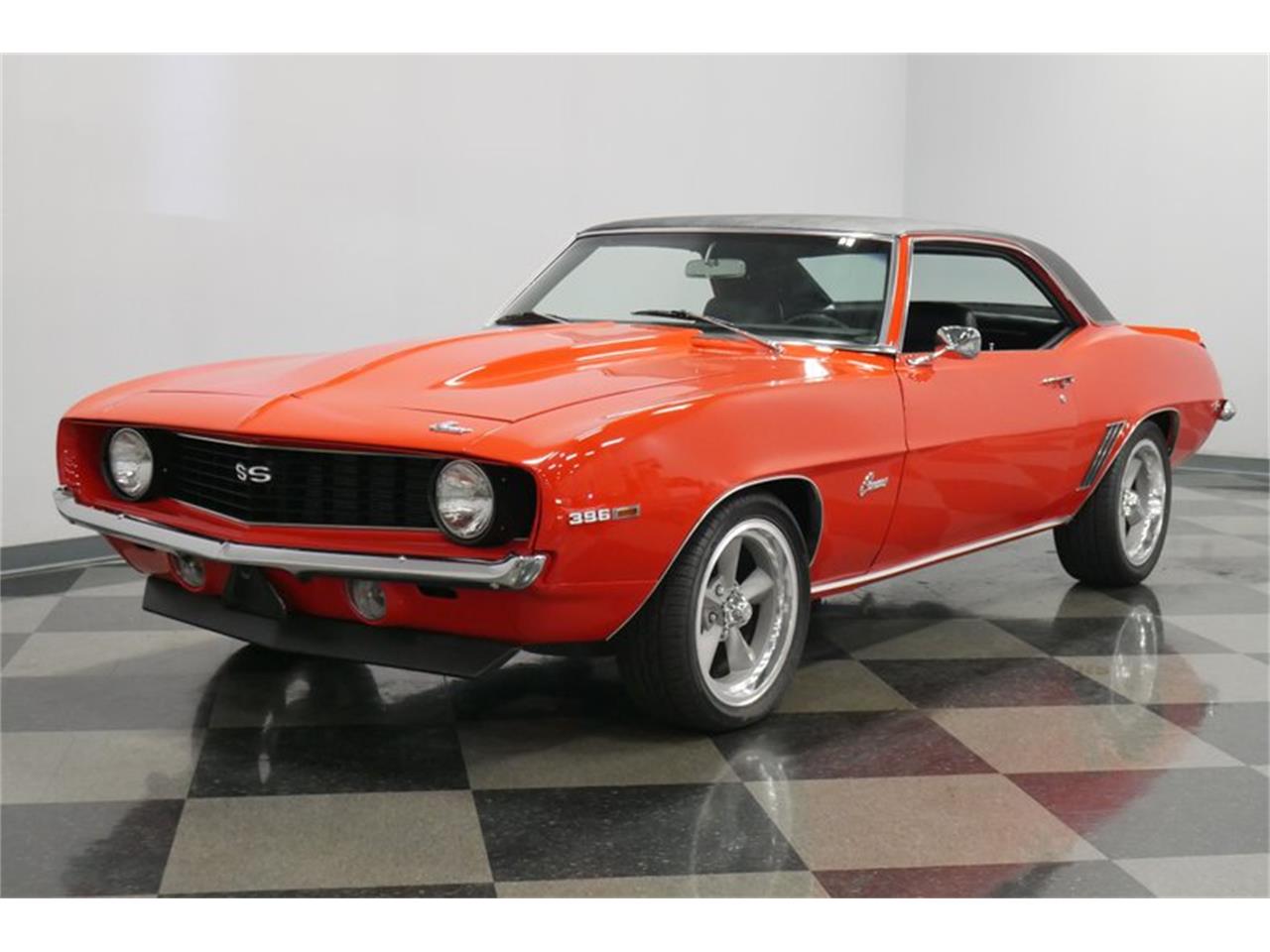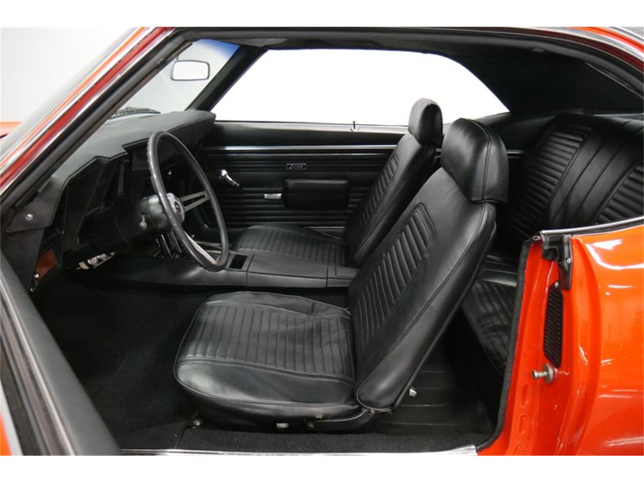 1969 Camaro SS with 454 cubic inches of Chevy V8 under the hood. It was rebuilt to resemble the legendary L78 396/350 horsepower version, but it's likely even more potent than that. Upgrades include an aluminum intake manifold, Holley double-pumper carburetor, a giant aluminum radiator, and a set of long-tube headers and Flowmaster mufflers that give it a cackling idle. Chrome dress-up parts make it sparkle against the black engine bay and Chevy Orange paint looks good no matter where it lives. The transmission is a TH400 3-speed automatic driving a 10-bolt rear end. Factory gauges in the dash are joined by a trio of Auto Meter Ultra Light auxiliary gauges under the dash.