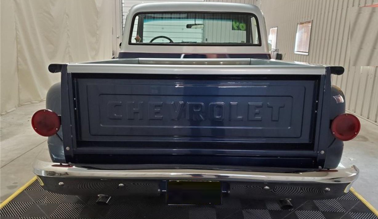 1969 Chevrolet C10 Stepside dressed in navy and steel blue two tone with red striping accents.