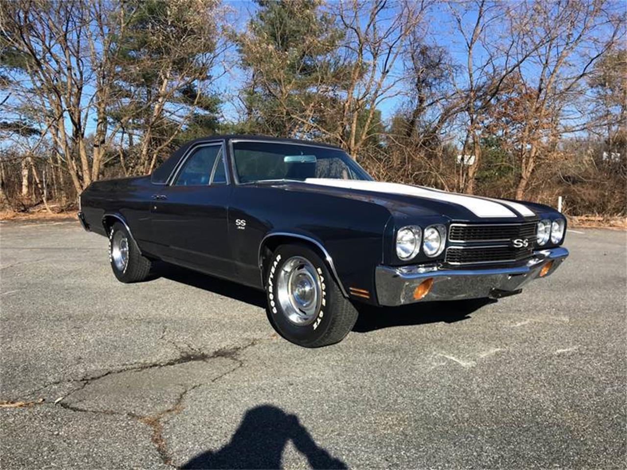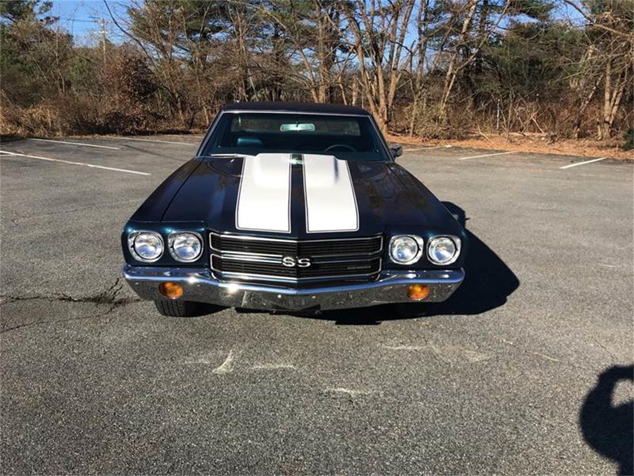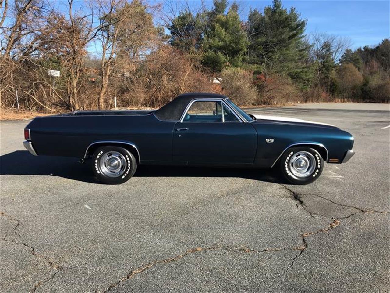 1970 Chevy El Camino SS. 396 v-8, mated to a 4-speed manual transmission. The exterior paint is fathom blue, with white stripes, and black vinyl roof. The paint, and body are real nice !! The exterior is blue vinyl, and has the correct tach dash. This El Camino runs and drives GREAT.