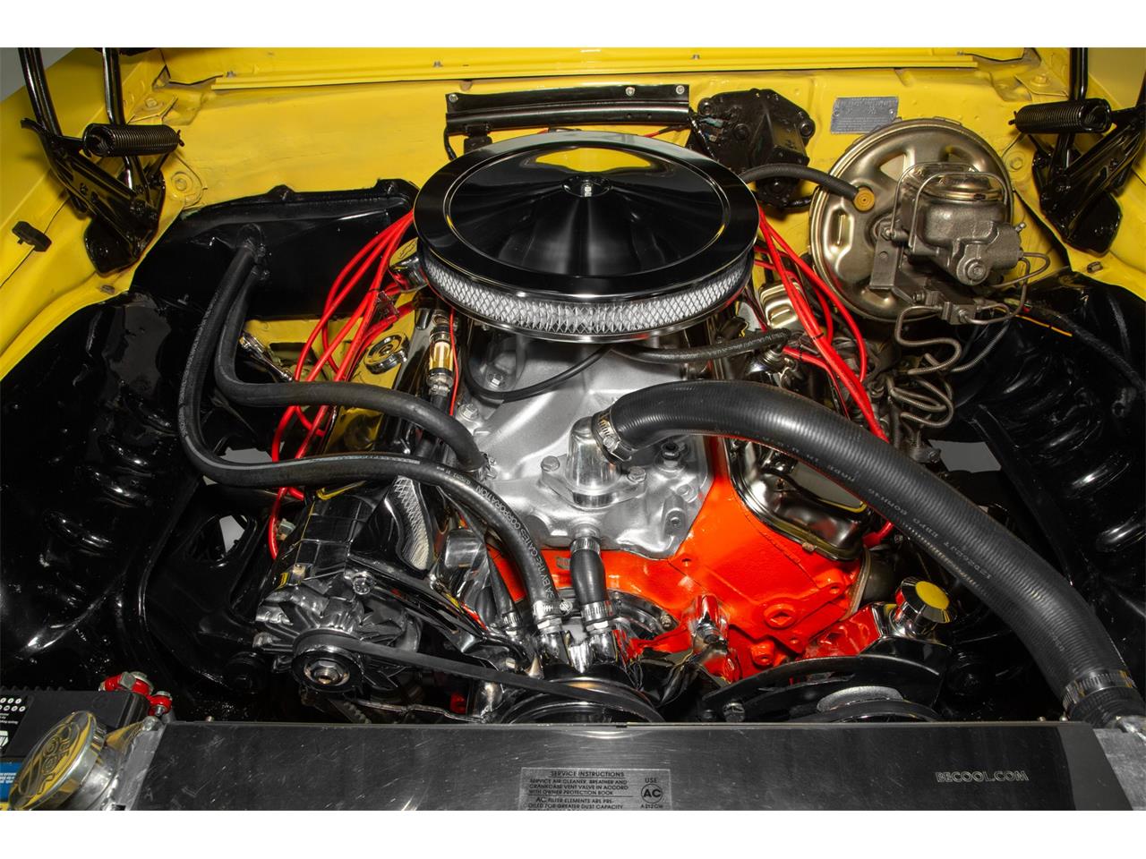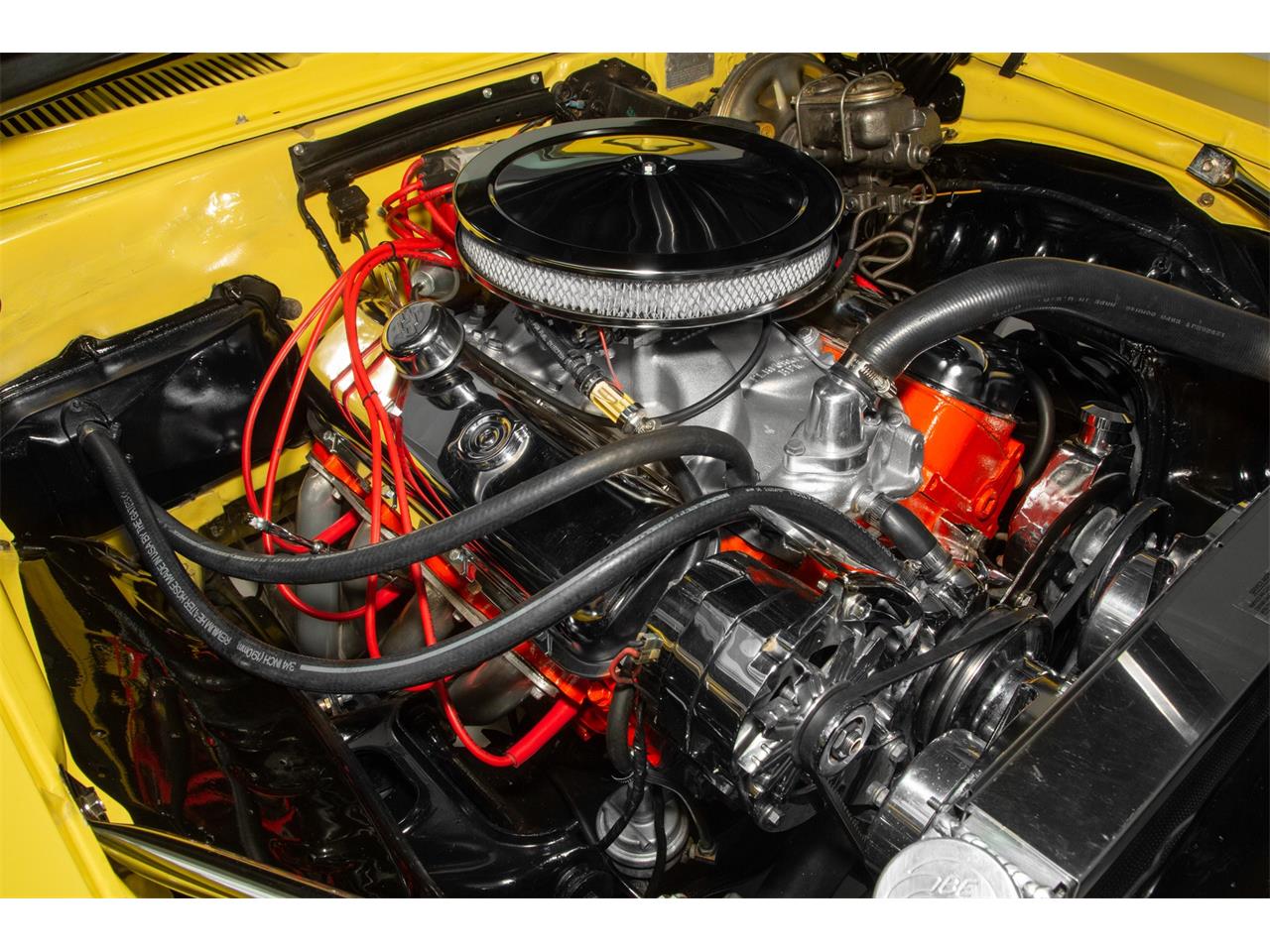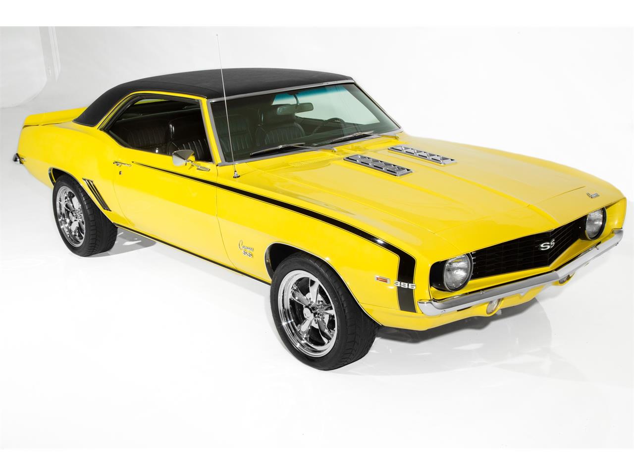 Daytona Yellow 1969 Chevrolet Camaro Super Sport with 396 c.i. big block power, Muncie 4 speed transmission, power steering, power front disc brakes and a 12 bolt rear end. Surrounding the slick paint is a SS hood with chrome stacks, front and rear spoilers, black hockey stick side stripes, black vinyl top. The big block under the hood is dressed up with chrome valve covers, air cleaner, alternator, water pump and power steering pump for a show quality appearance. High capacity Be Cool aluminum radiator keeps things cool. Exceptionally nice interior with factory bucket seats, center console with Hurst shifter and gauges, factory tach, tilt steering column, cushion grip steering wheel and Retro sound with rear mounted speakers. The trim tag on this American Dream Machine is stamped as an X11 code. Rolling on 17 inch Legend Series Vision chrome wheels and BF Goodrich performance tires that really shine.