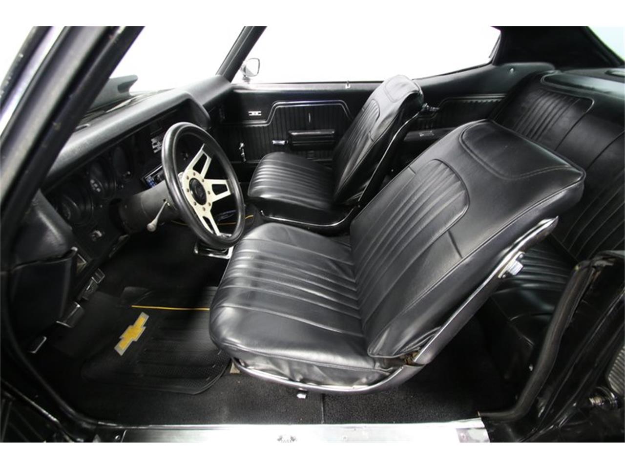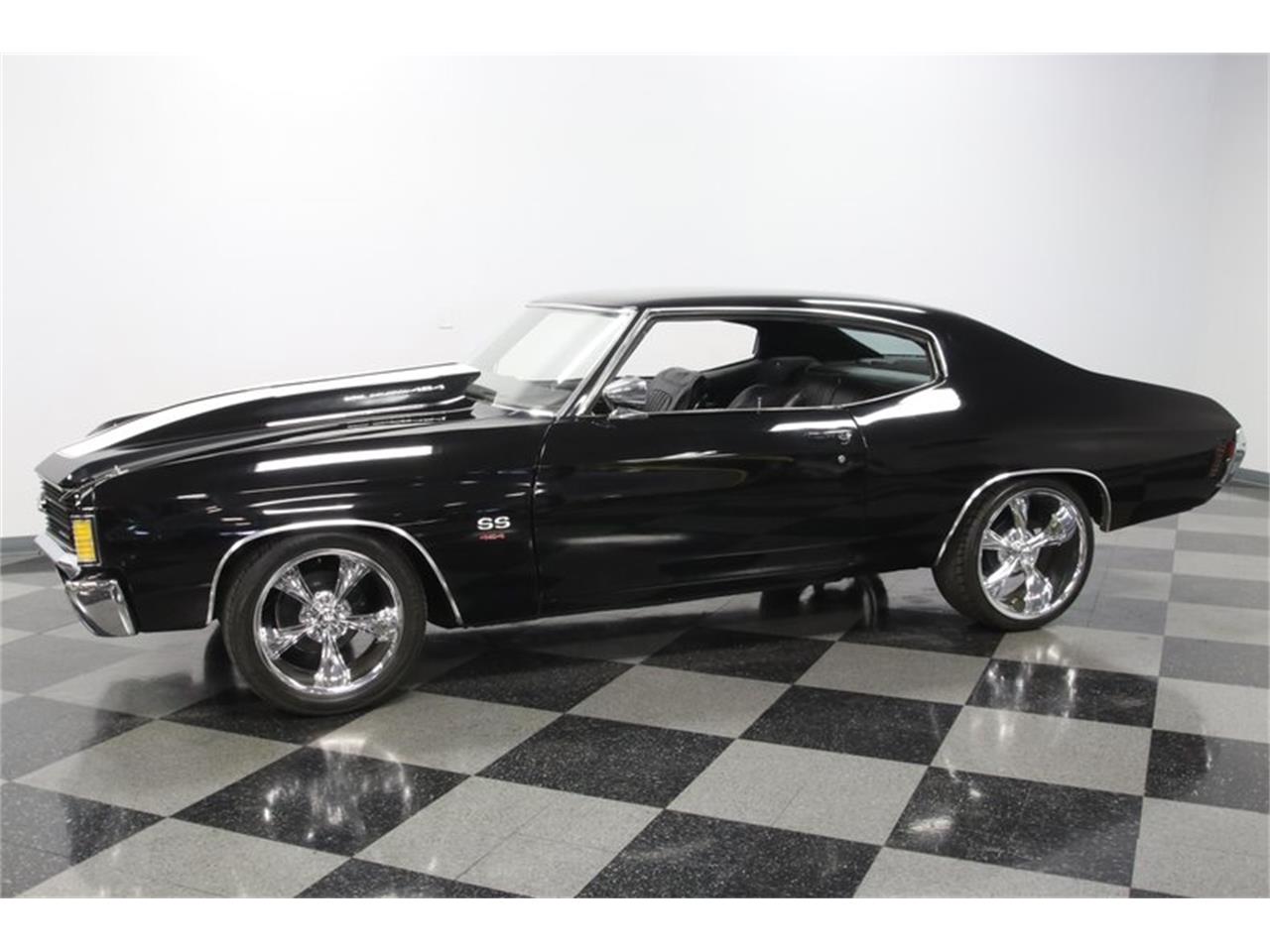 A mean black attitude, the growl of the big block V8, and the control of a four speed makes this 1972 Chevrolet Chevelle SS 454 Tribute pure intimidation on wheels. You know you love the look of this Chevelle. The slick black paint portrays the exact attitude you want on a muscle car like this. The deep shine highlights the straightness of the body. Plus, this really plays the part of a powerful and classic icon correctly. You see it in the features, like the fastback profile, hardtop roof, hood pins, and white painted racing stripes. And the extra large bulge in the cowl hood hints at upgraded power within.