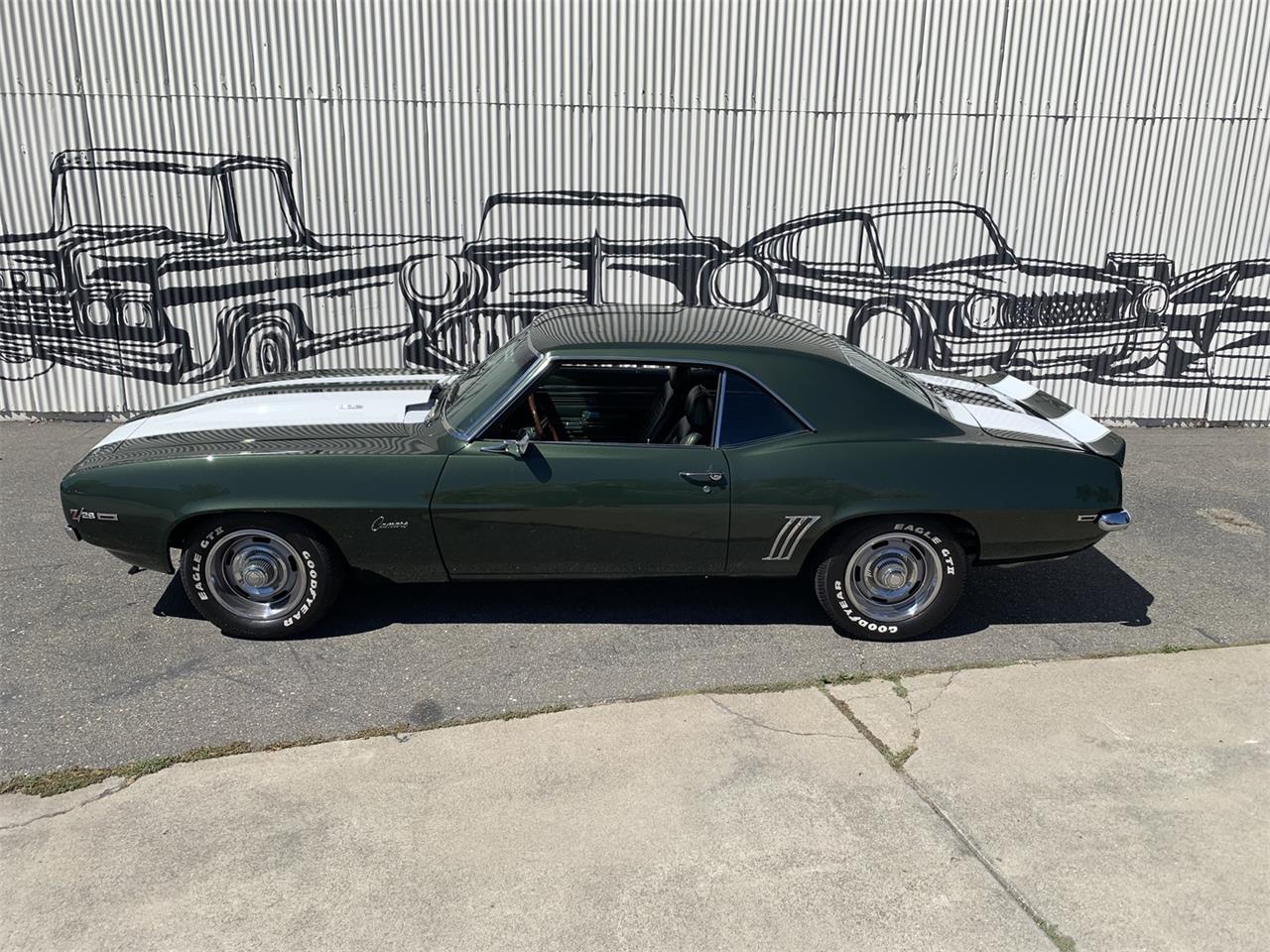 This highly impressive 1969 Chevrolet Camaro Z 28 2 Door Coupe with Fathom Green exterior paint, Rallye White racing stripes and a matching green vinyl interior. You ll find a 302 cid V 8 engine under the hood paired to a 4 speed manual transmission and this desirable muscle car is very nicely equipped with power steering, power front disc brakes,