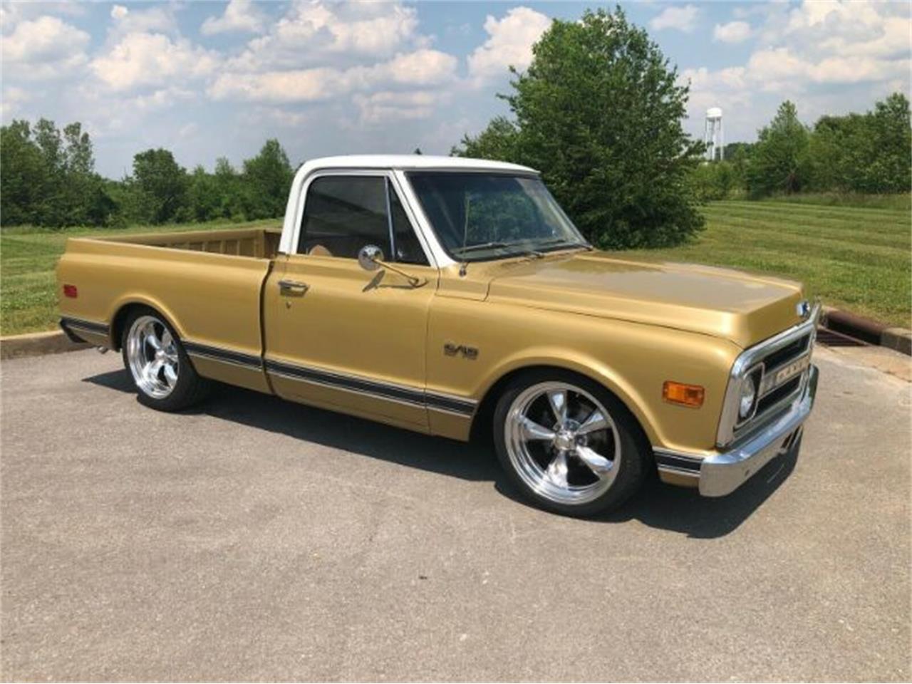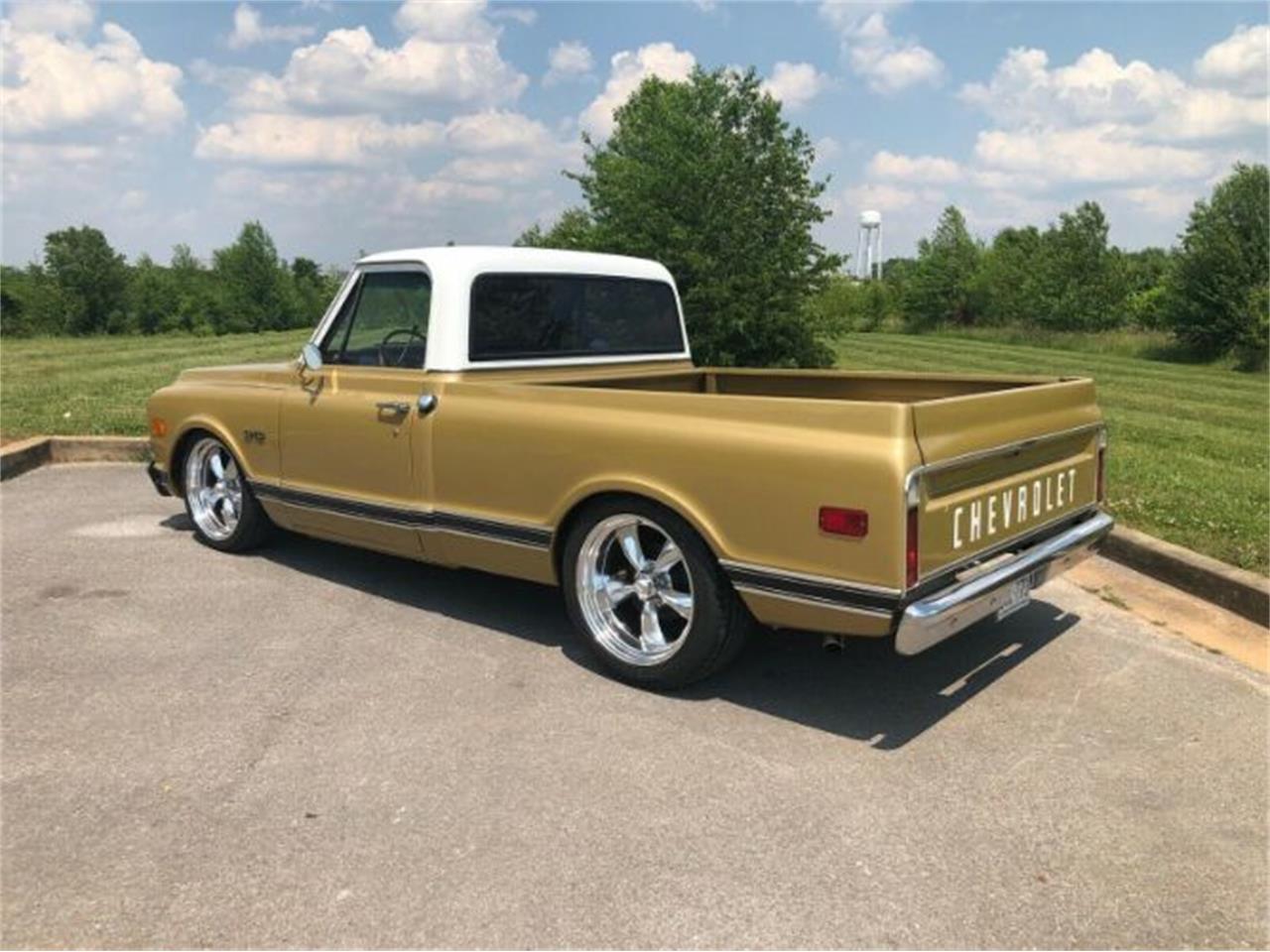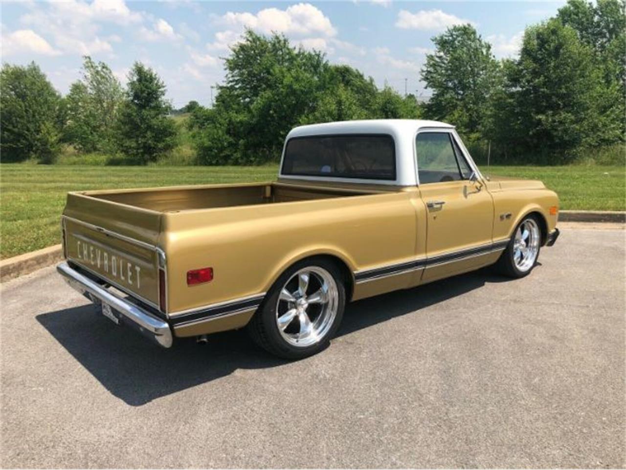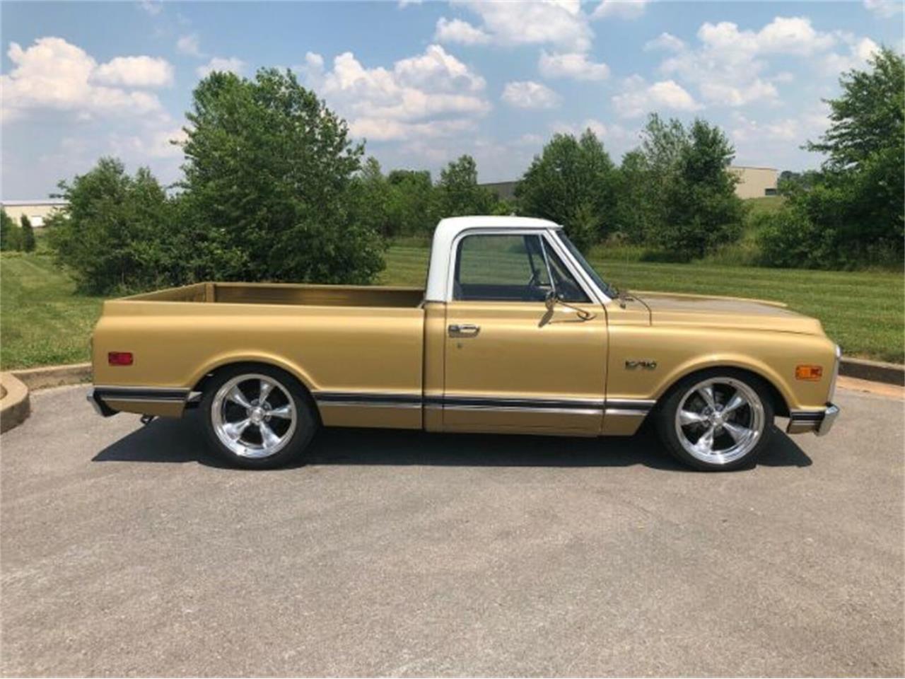 1970 Chevrolet C10 Pickup (Factory Short Bed) Gold Exterior Tan Interior (New Seat/Headliner/Carpet/Door Panels/Trim) 350 Motor V8 700R4 Automatic Overdrive Transmission Power Steering Power Disc Brakes 5/7 drop - Mcgaughys C-Notched Drop Spindles/Shocks/Flip Kit NEW 20x8 & 20x10 American Racing Torq Thrust Wheels (polished) NEW 255/35/20 & 275/40/20 Ironman Tires Dual Exhaust New Vintage Air Conditioning and OEM correct carpet kit.