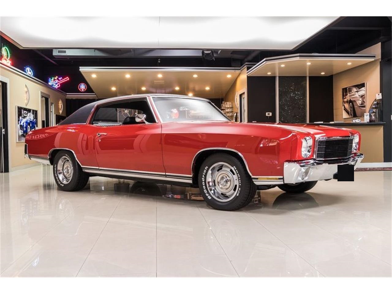 Check out this gorgeous 1970 Chevrolet Monte Carlo. This Monte Carlo is sporting a laser straight body with a glossy Red Paint finish, a Black Vinyl Top, and a beautiful Black Interior. Under the hood sits a Numbers Matching GM 350ci V8 Engine mated to a Numbers Matching TH350 3 Speed Automatic Transmission. Power is sent to the BFGoodrich Radial T/A Tires through a GM 12 Bolt Rear End.