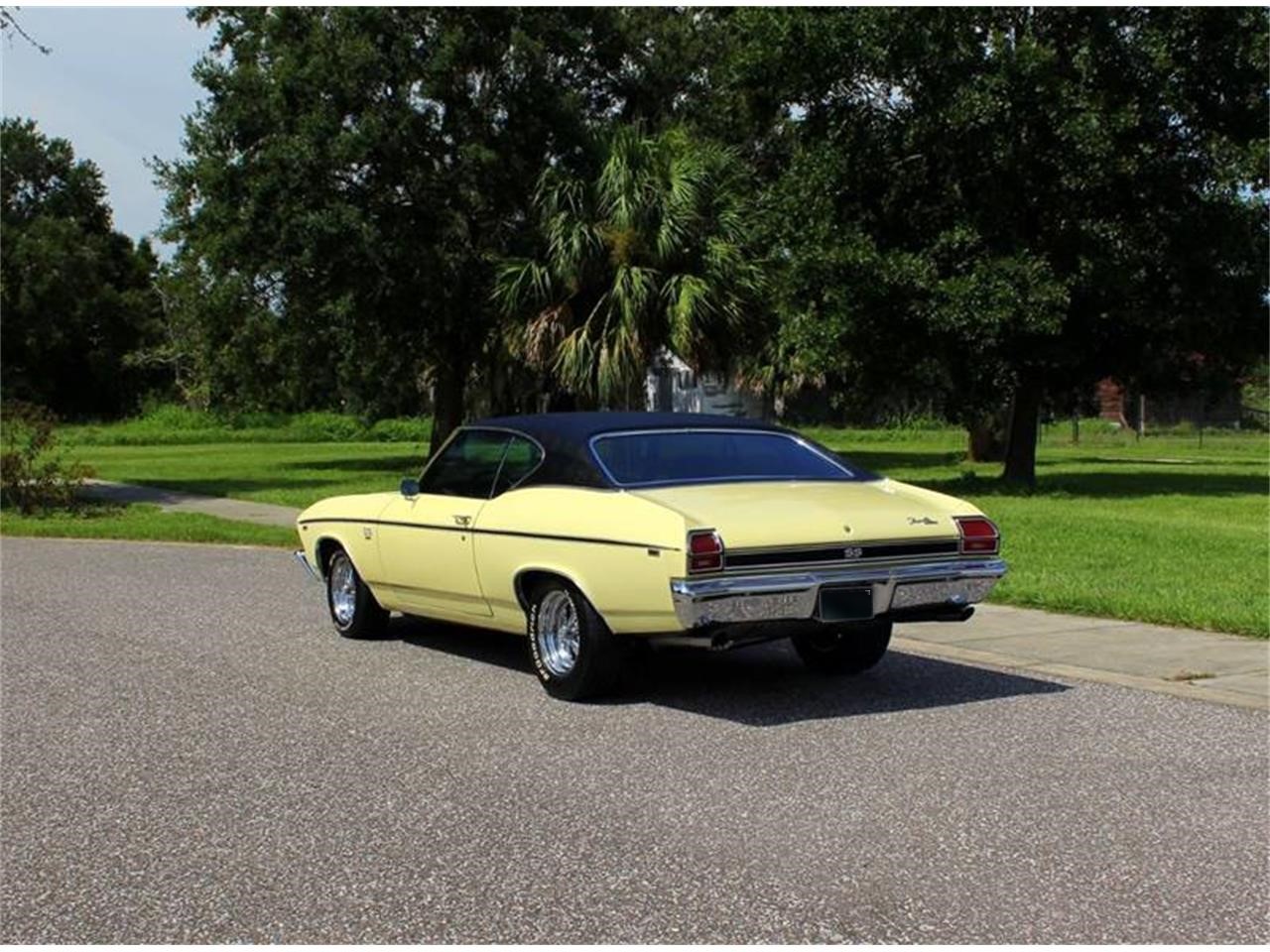 1969 Chevrolet Chevelle SS Restomod for Sale. Date Coded 396 engine, upgraded Edelbrock Intake, Holley Carburetor, stainless steel headers, dual exhaust, 700R4 overdrive transmission, Vintage A C, March serpentine belt system, dual electric fans, smoothed firewall, power steering, power disc brakes, 15 chrome Cragar SS wheels with BF Goodrich Radial T A tires, 12 bolt rear end, upgraded rear control arms, Code 40 Butternut Yellow exterior, black vinyl top, black stripe package, dual chrome sport mirrors.