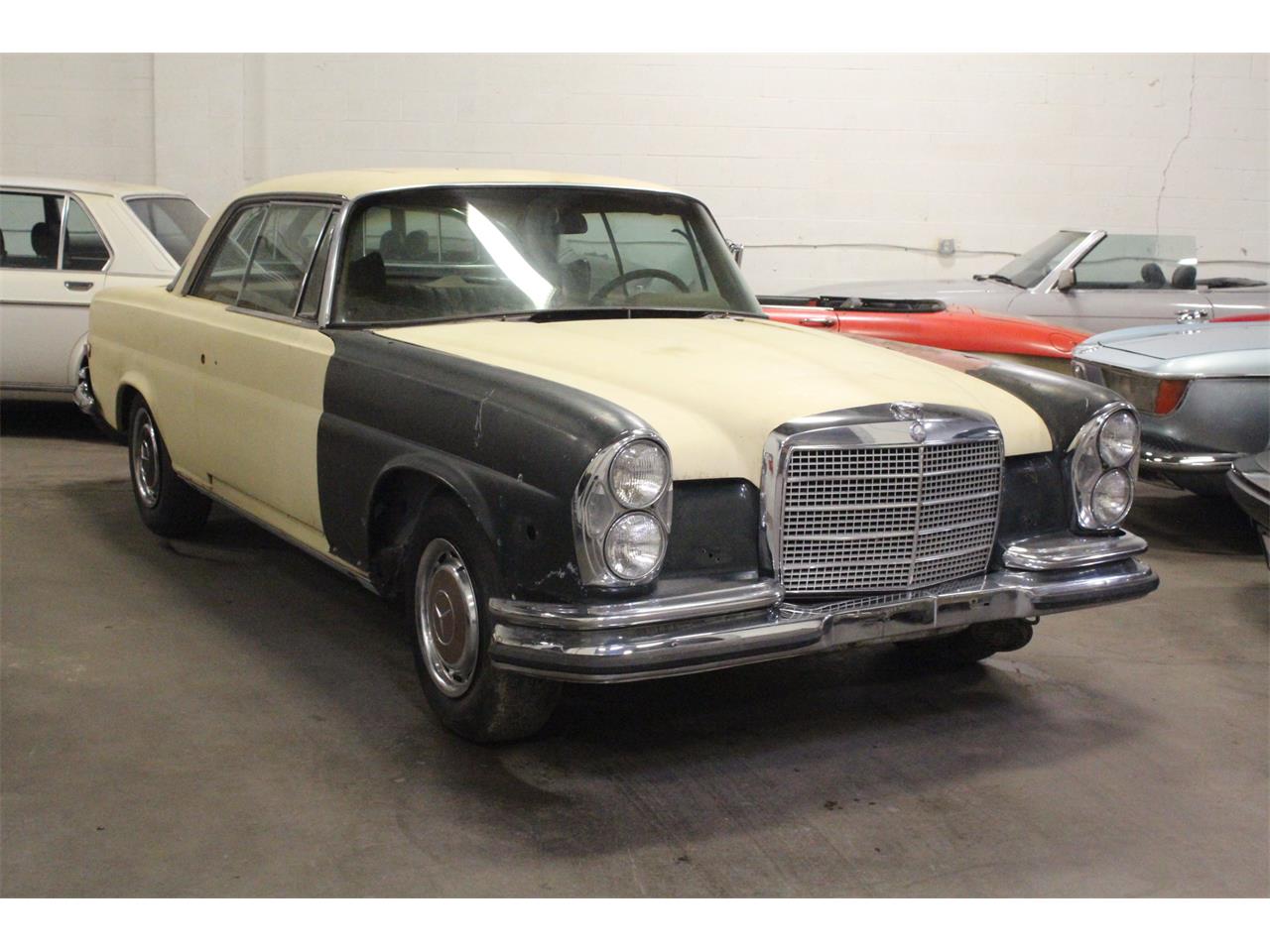 1970 Mercedes Benz 280SE W111 Chassis Low Grill Sunroof Coupe, Originally Burgundy exterior and Tan leather interior. Equipped with very desirable factory options like sunroof, Behr AC, Becker radio, Power windows, floor shift car. The car is all there, body is in primer, all the chrome is off the car but it comes with it. Mechanically does not run due to sitting long time, the engine turns over manually by hand.