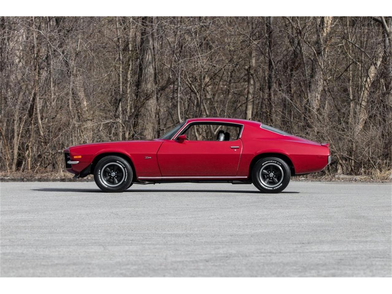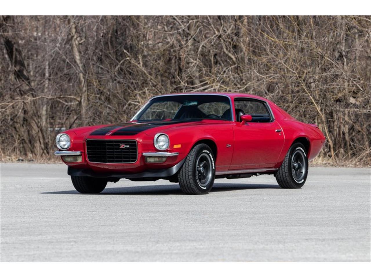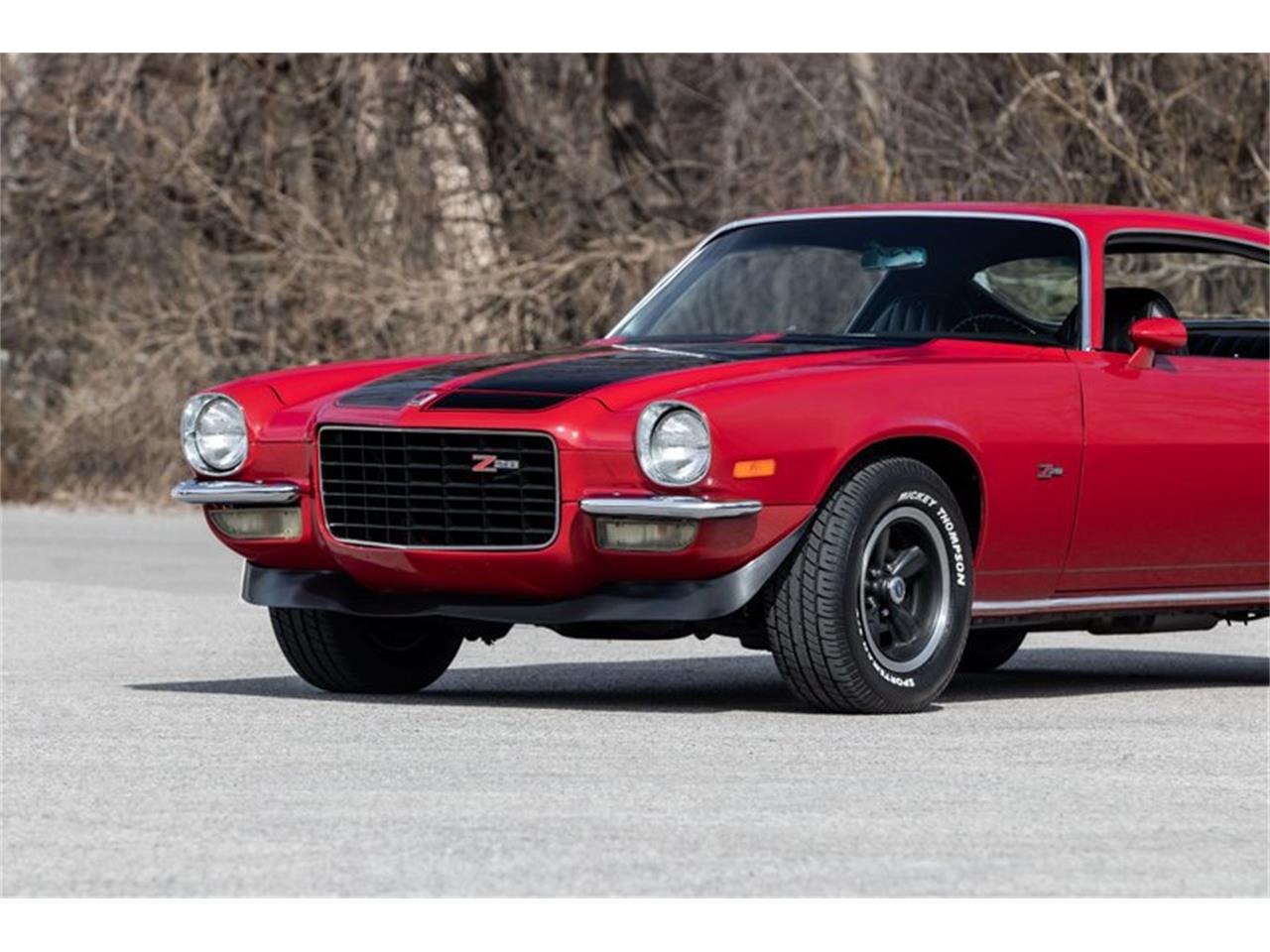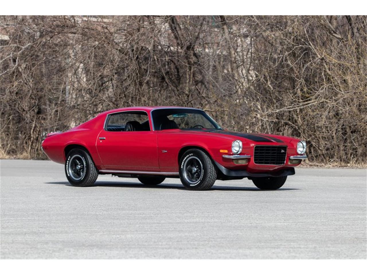 1972 Chevrolet Camaro Z/28 for sale with a 350c.i. Numbers Matching V8 w/ 4bbl Carb, Muncie 4 Speed Manual Transmission, 10 Bolt Rear w/ 3.08:1 Ratio, Red Exterior w/ Black Stripes, Black Bucket Seat Interior, Power Steering, Power Disc Brakes, Sport Mirror w/ Remote, AM/FM/Tape Stereo w/ Pioneer Speakers, Padded Dash, Day / Night Rear View Mirror, Front and Rear Seat Belts, Hurst Shifter, Front and Rear Spoilers, Detailed Engine Compartment and Undercarriage, 15" Z-28 Wheels w/ White Letter Radials. Excellent condition.