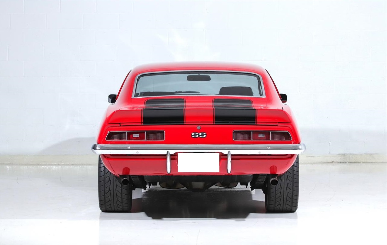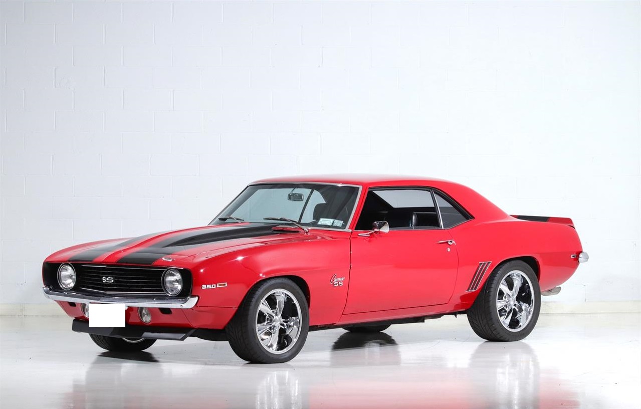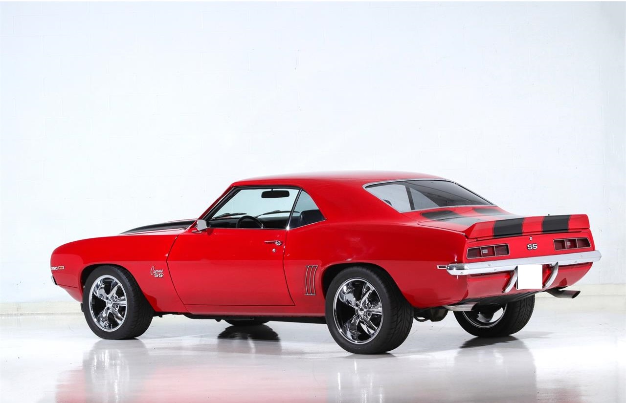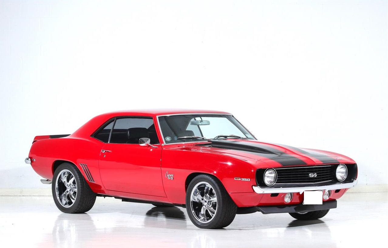 1969 Chevrolet Camaro SS featured in red with black interior. It is an older restoration on an SS with the 350CI 300HP V8 and 4 speed manual gearbox and 12 bolt rear. Features include sport bucket seats with console, power steering, power front disc brakes, MSD ignition, AM FM Cassette stereo, and 17 5 spoke Foose wheels. The red paint is smooth and deep, and accented by black stripes. Sporty dual exhausts sound great and the car is satisfying to drive with the vintage look and feel that make the 69 Camaro one of the most desirable cars of the period.