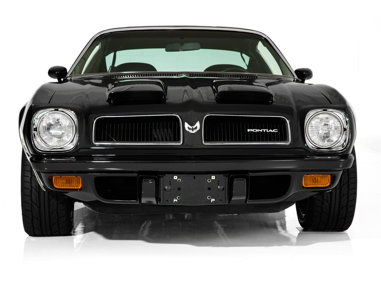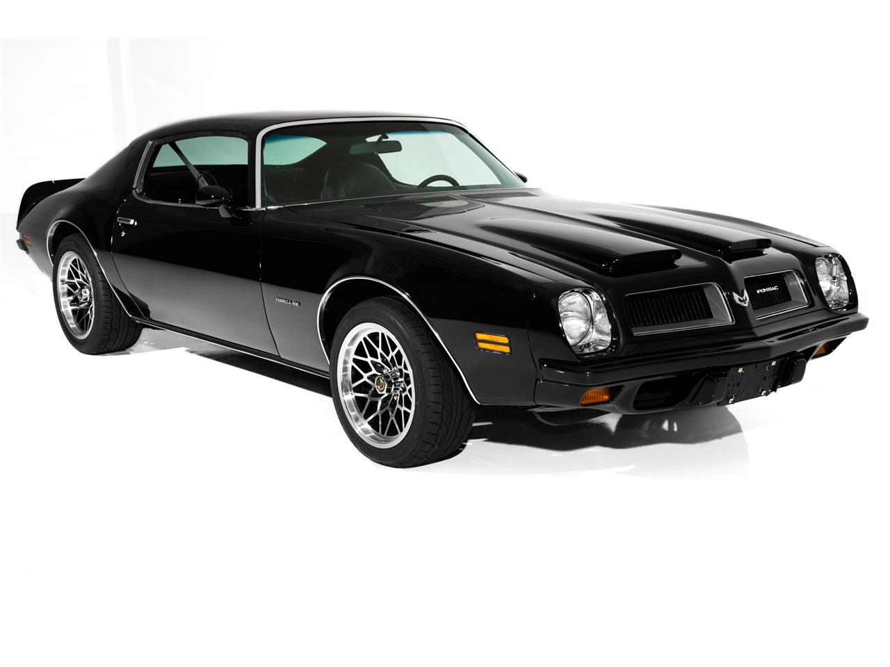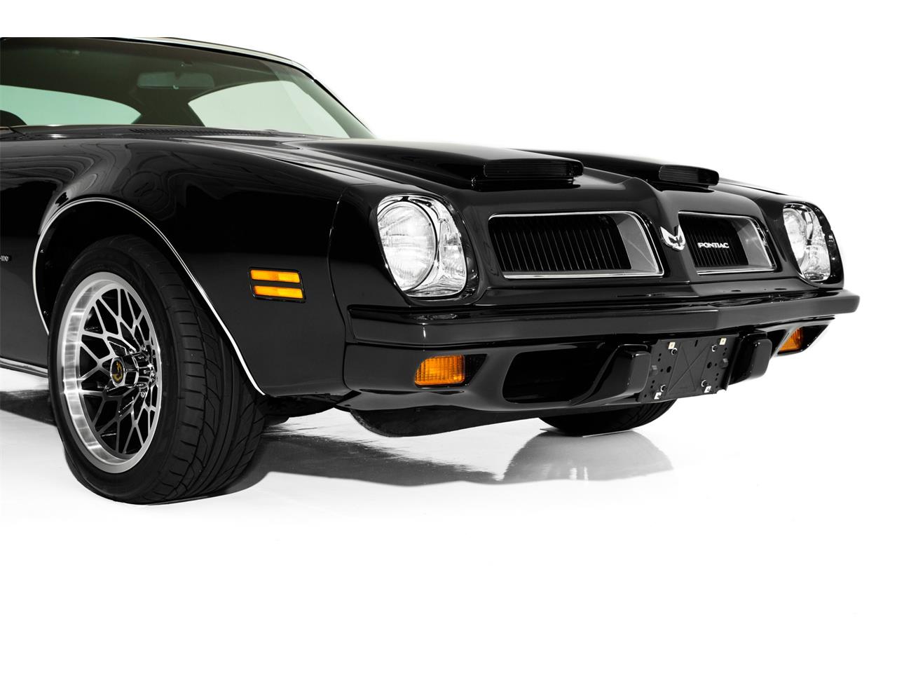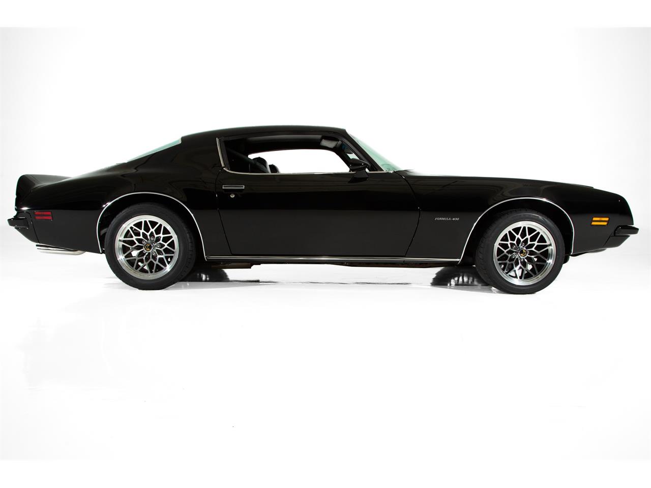 Stunning freshly painted Jet Black 1974 Pontiac Firebird Formula 400 with a rare factory 4 speed manual transmission. Fresh out of the body shop with all new 2 stage paint including door, hood and trunk jamb then cut and buffed to a deep shine. 51,000 actual miles with excellent metal structure,gaps and lines. The Formula hood, emblems and spoilers let you know this Firebird means business. This beautiful bird is heavily optioned with power front disc brakes, power steering, air conditioning, rear defrost, AM FM stereo and factory 8 track tape player. Very nice black factory bucket seats, center console, Hurst shifter, 160 mph speedometer, gauges and woodgrain trim makes the interior look amazing. Rolling on new 17 inch polished aluminum snowflake wheels from Year One and wrapped in new performance tires for a killer stance.