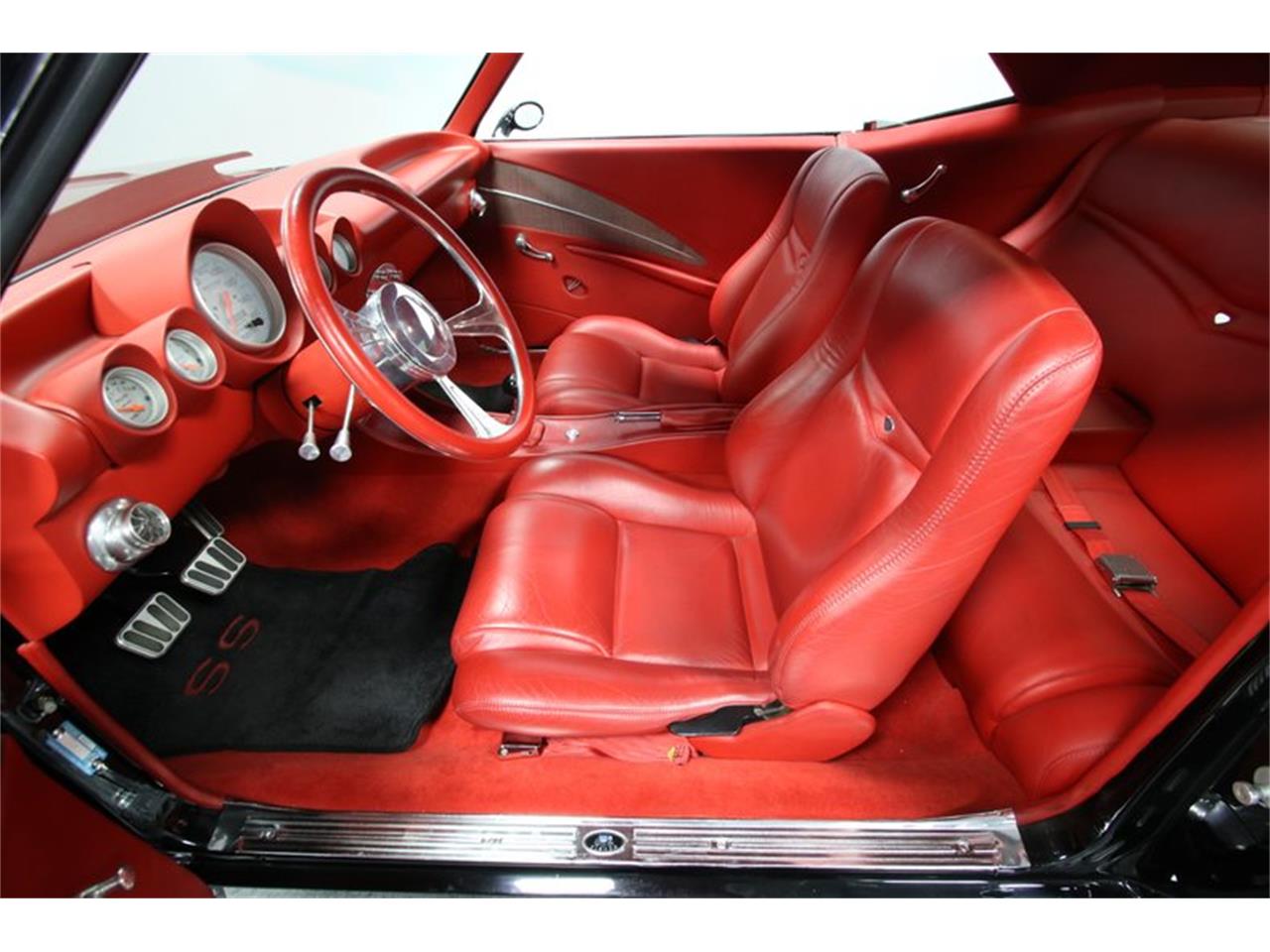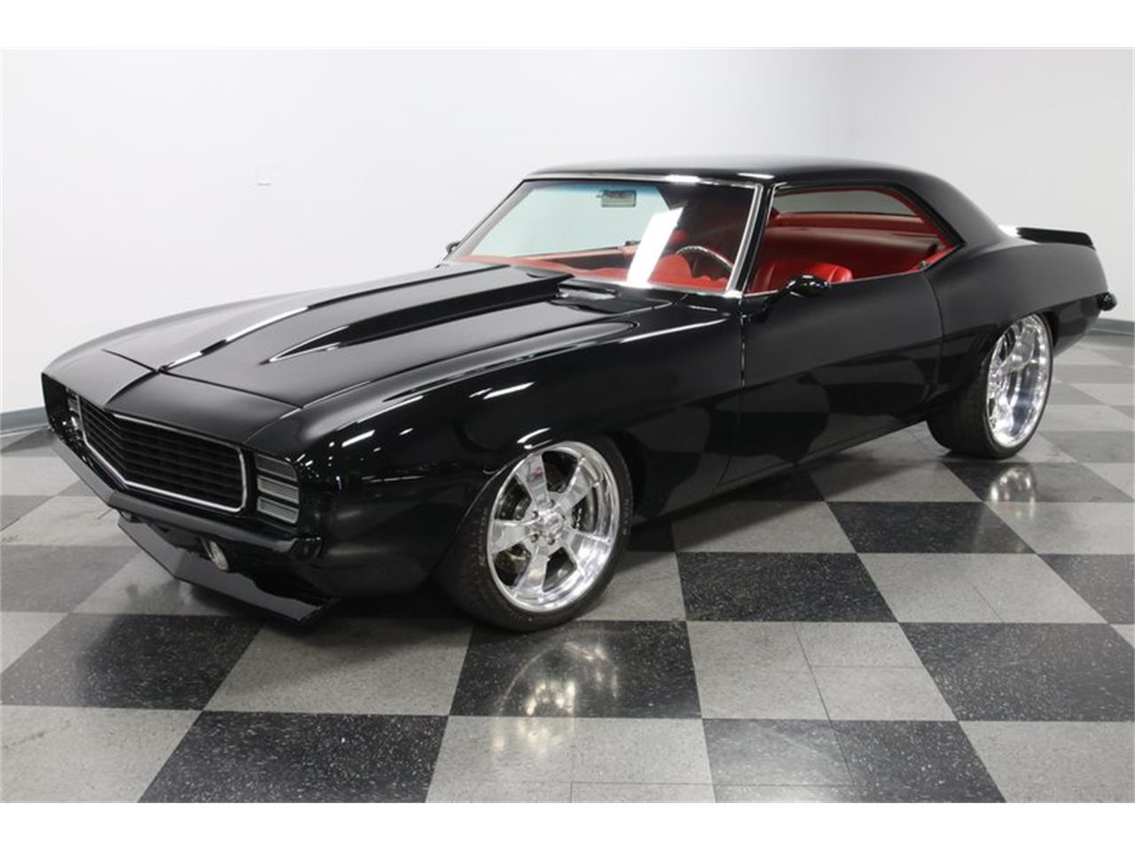 This 1969 Chevrolet Camaro . The hidden RS headlamps make the front end look like it wants to inhale the road ahead. The mean attitude is continued on the front air dam, rear spoiler, and the power bulge of the cowl hood. Those are all a nice investment in the classic pieces. But this one goes much further. The blackout treatment extends to the custom details, like the color matched bumpers, sport mirrors, and expertly deleted door handles. It helps heighten the slick and dark experience of this coupe to make it looks like it could slip through the midnight air. All this darkness is broken up by a terrific set of Intro billet wheels. With a lowered suspension and an aggressive 18 22 inch front rear stagger, this only added to the coupe s mean attitude. The full red interior makes this dark horse look like it s out for blood. The leather seats look awesome with terrific stitching and plenty of bolstering for comfort.