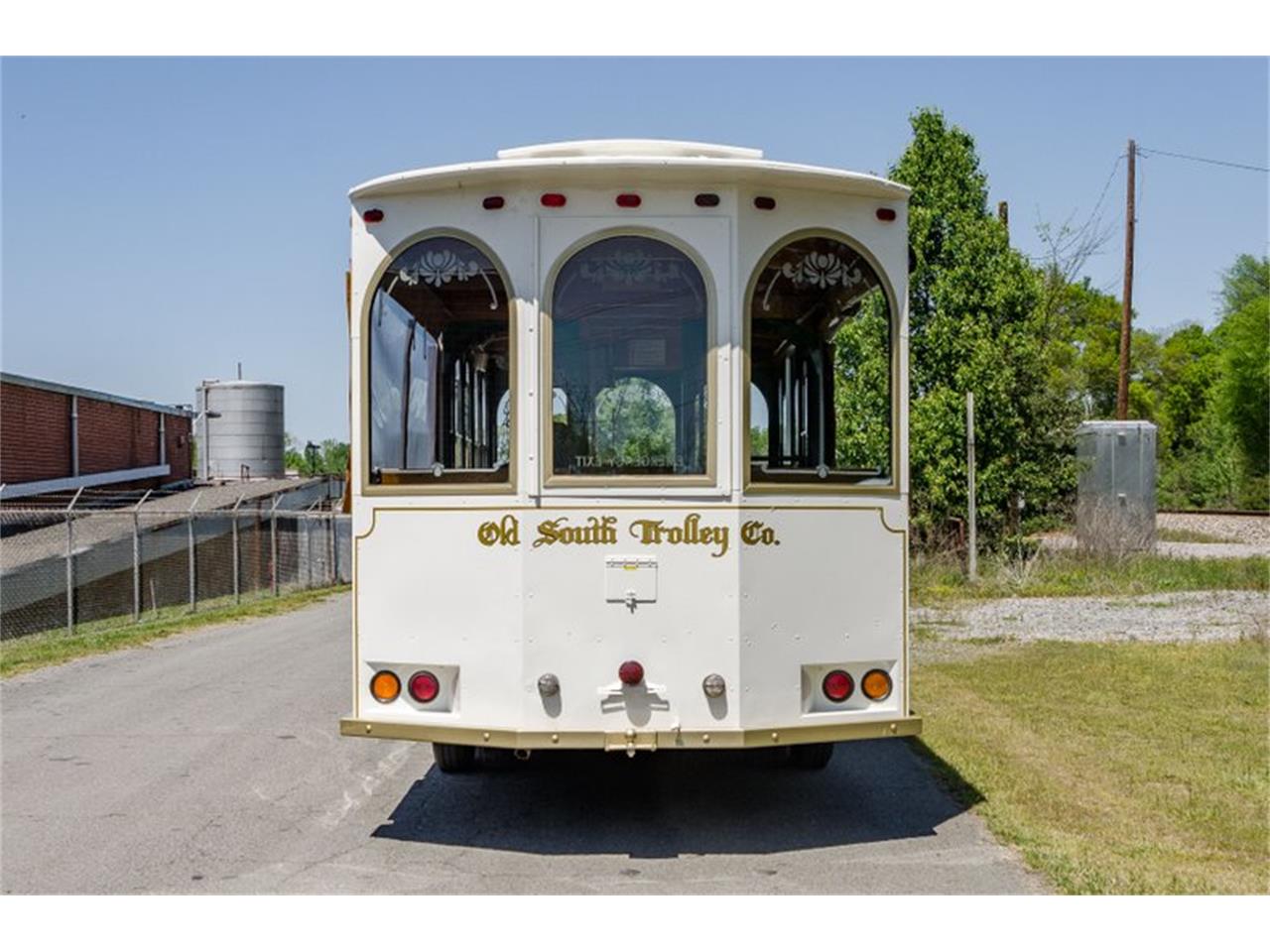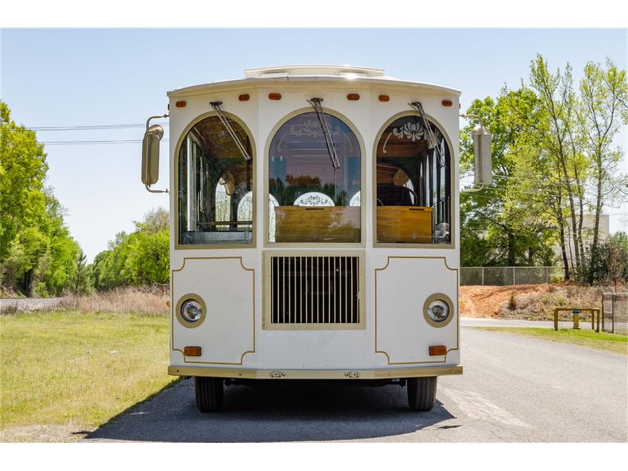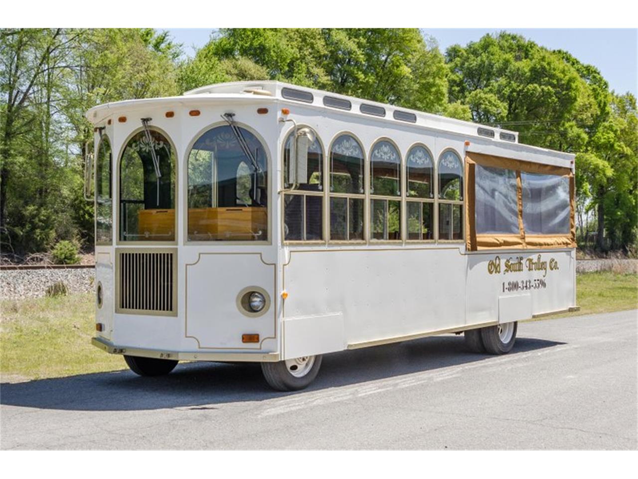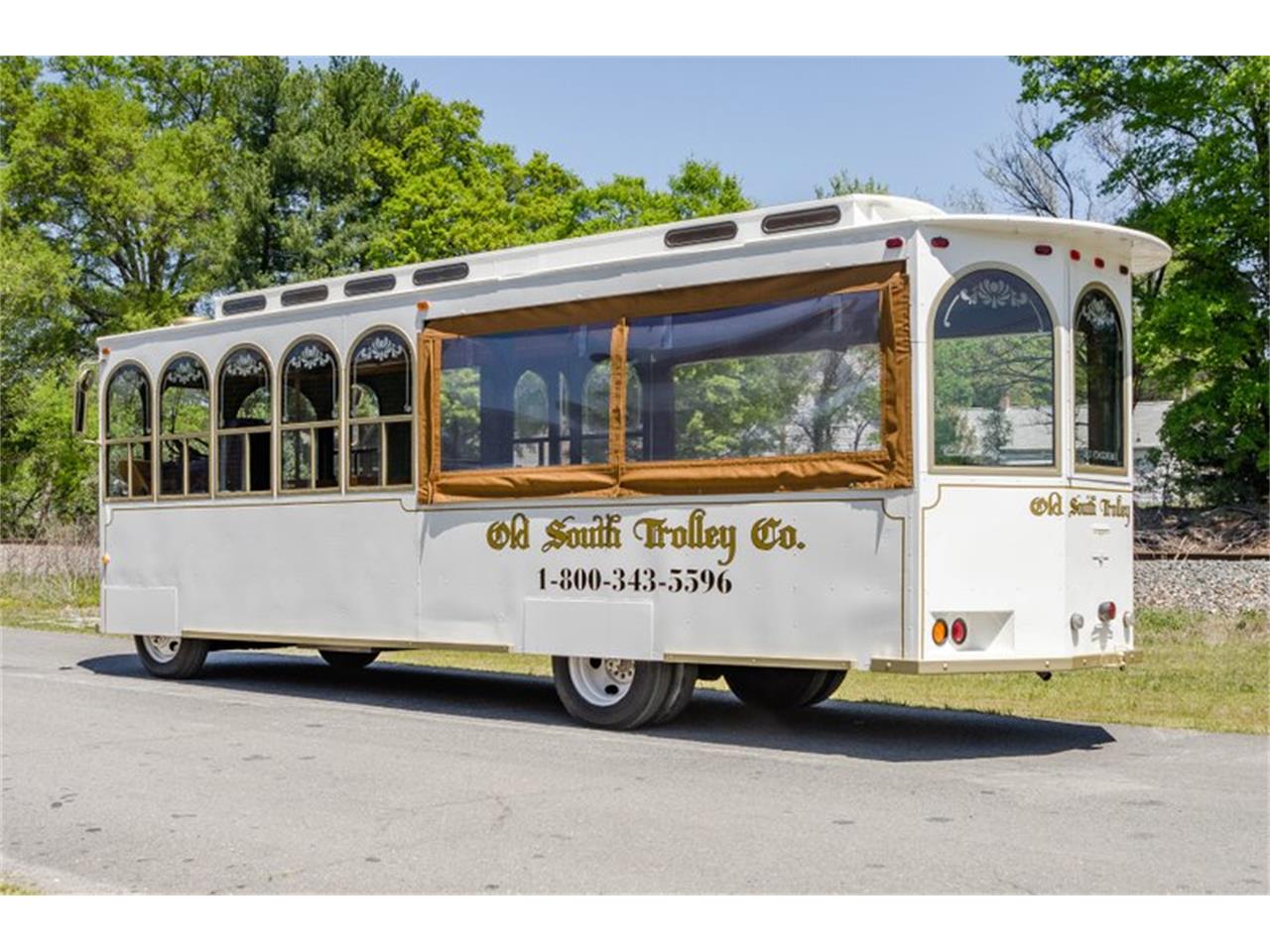 This 1987 Molly Trolley is a classic version of the motorized trolley concept. It will transport 30+ passengers. The trolley was designed so that front passengers sit in a traditional enclosed environment (sliding windows) and passengers in the rear sit in an open area with an unobstructed view. Roll up curtains are also included for the rear sitting area. The exterior was refinished in Classic White with gold trim. Features include wide natural oak seats w/vinyl cushions, power passenger door, roll-down curtains, front/rear heat, AM/FM stereo, PA system and a trolley bell. Seat cushions in dark vinyl and the wood is in very good condition. The custom Molly Trolley frame is equipped with a GM 454ci big-block and 3-speed automatic transmission. The chassis is fitted with factory steel wheels, power steering and power disc/drum brakes.