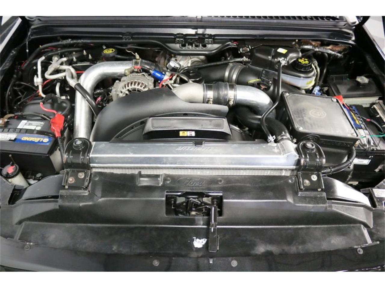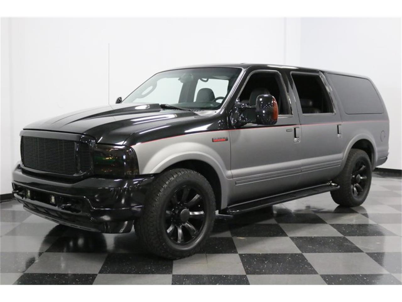 The Excursion was already an imposing truck from the factory, but this one's been turned up to 11. It was stripped to bare metal in 2017, and during the next 18 months it was redone in a combination of Tuxedo Black Gloss up top, matte silver with glass beads below, and splitup by a hand painted Ferrari Red pinstripe. But the fun did not stop there. An aggressive highflow hood was installed, the billet was powder coated, black stepbars were added, and the rear was debadged for a smooth look. All the windows are tinted jet black, as are the headlights and taillights, and LED fog lights help light up the night skies.