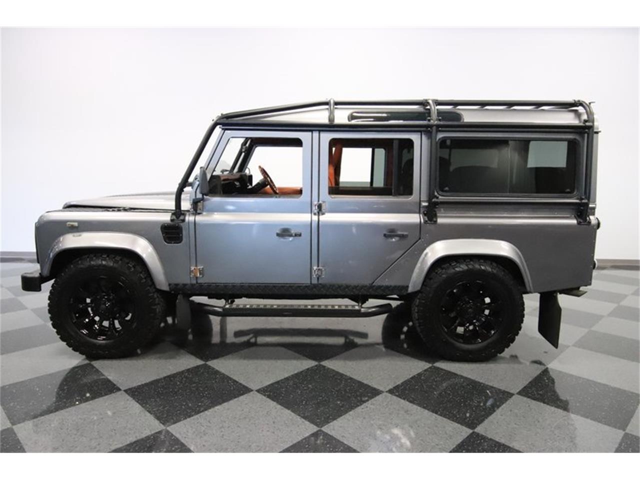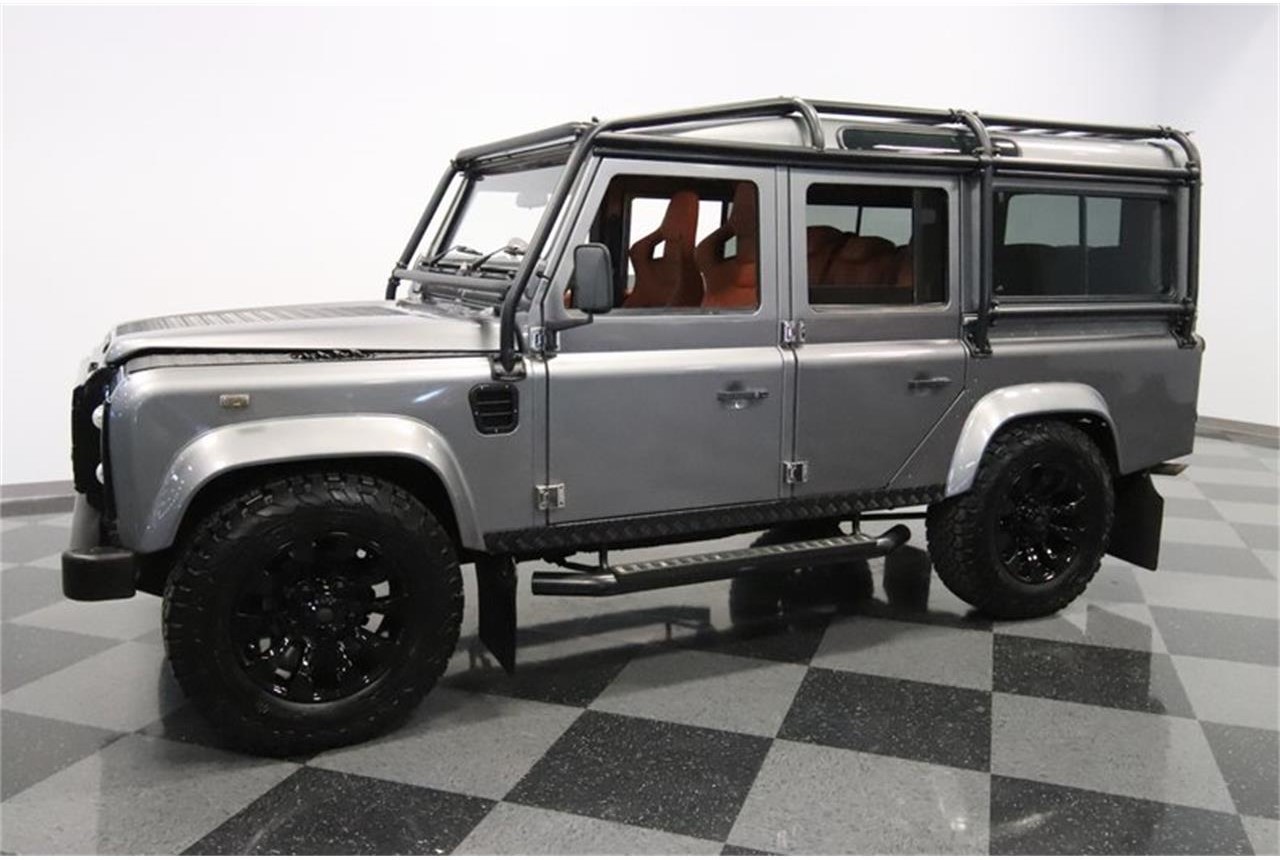 Premium, distinct, and tough as nails, this 1992 Land Rover Defender 110 perfectly combines the go anywhere 4 4 image of the brand. And it does it with great features like nine person seating, diesel power, and a luxury interior by the masters at Kahn Designs. So this one is ready to make a memorable entrance everywhere from the campsite to Main Street. It looks ready to take on the harshest terrain with the full exterior roll cage, tubular side steps, mud guards, and tubular rear bumper. Plus, you have steel plated fenders tops, hood insert, and rockers. All of this black looks great against a quality application of metallic silver.
