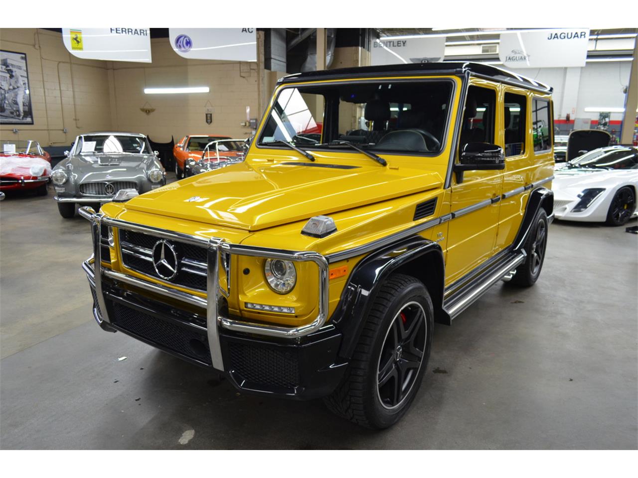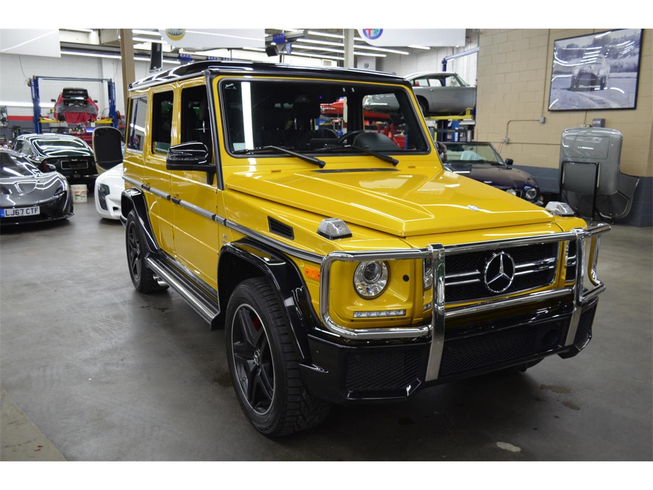 2017 MERCEDES BENZ G63 AMG. Solarbeam Yellow with Obsidian Black roof and fenders, Black Nappa designo leather interior, Yellow stitching, Carbon fiber trim, 5.5 Liter Biturbo V8 with 563bhp, 7G-Tronic 7-Speed Automatic transmission, 4Matic All-Wheel-Drive, 24,000 miles. Factory options include: CC5 AMG Performance Studio Package (includes designo leather package with AMG sport seats with diamond stitching), Solarbeam paint, Black exterior contrast trim, AMG Carbon fiber trim, 21 inch AMG twin-spoke wheels, Rear camera with parking sensors, Navigation, All-season floor mats, 4Matic All-Wheel-Drive. The power output is from a 5.5 liter Biturbo V8 engine producing 563 bhp and 561 lb. ft. of torque. Performance is 0-62 mph in 5.2 seconds with a top speed electronically limited to 155 mph.