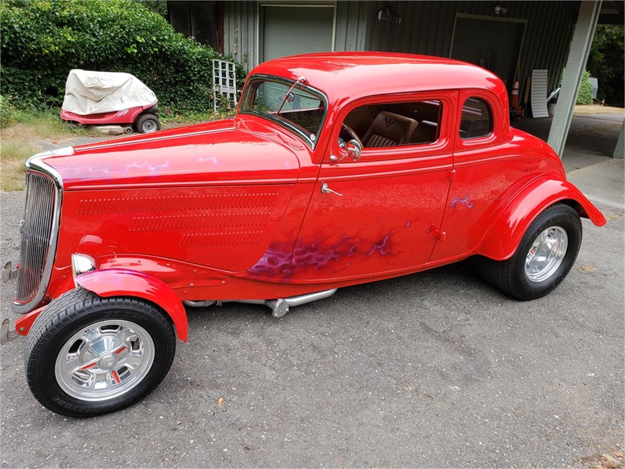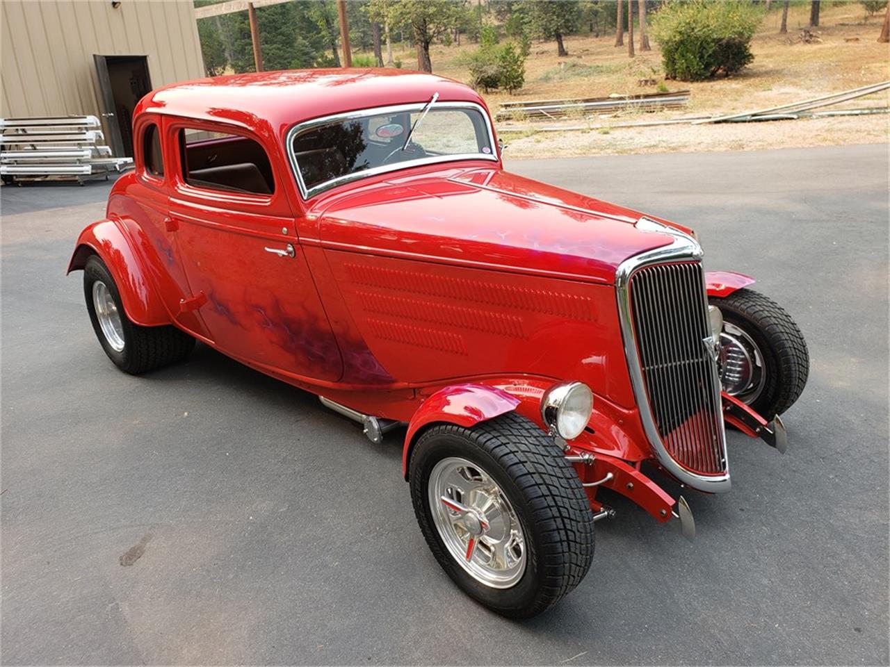 This original all-steel 1934 Ford 5-Window Coupe is finished in red over a tan leather interior and is powered by a 540ci Chevrolet V8 paired with a 3-speed automatic transmission