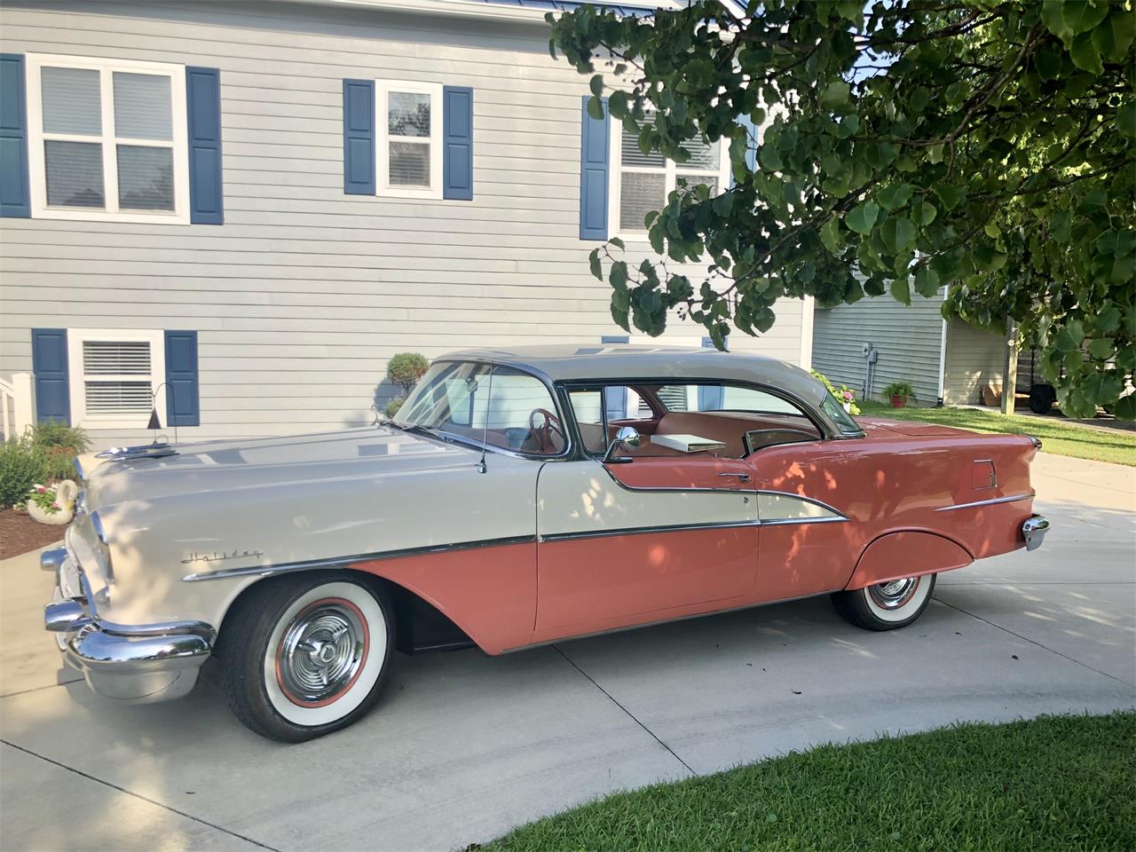 1955 Oldsmobile 98 - Stunning example of a 50's beauty! Show winner - 7/30/22 at the Jacksonville, NC Car Show! This is a very rare & hard to find model, full professional restoration a few years ago, always in climate controlled storage, lustrous salmon & white two-tone paint, beautiful chrome and stainless - all redone, fully rebuilt original 324 ci v8 engine, fully rebuilt automatic transmission, fully loaded 98 long wheelbase model, autotronic eye, power steering, power brakes, power seats, power windows, original radio, front and rear bumper guards, wide white wall tires, original spinner hubcaps - this is the top-of-the-line model Oldsmobile for 1955