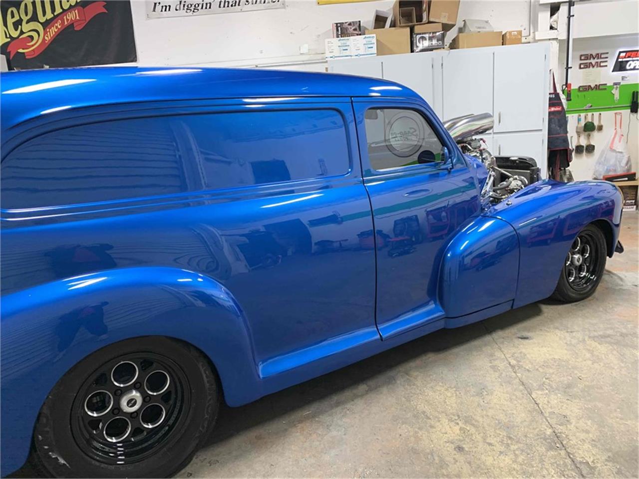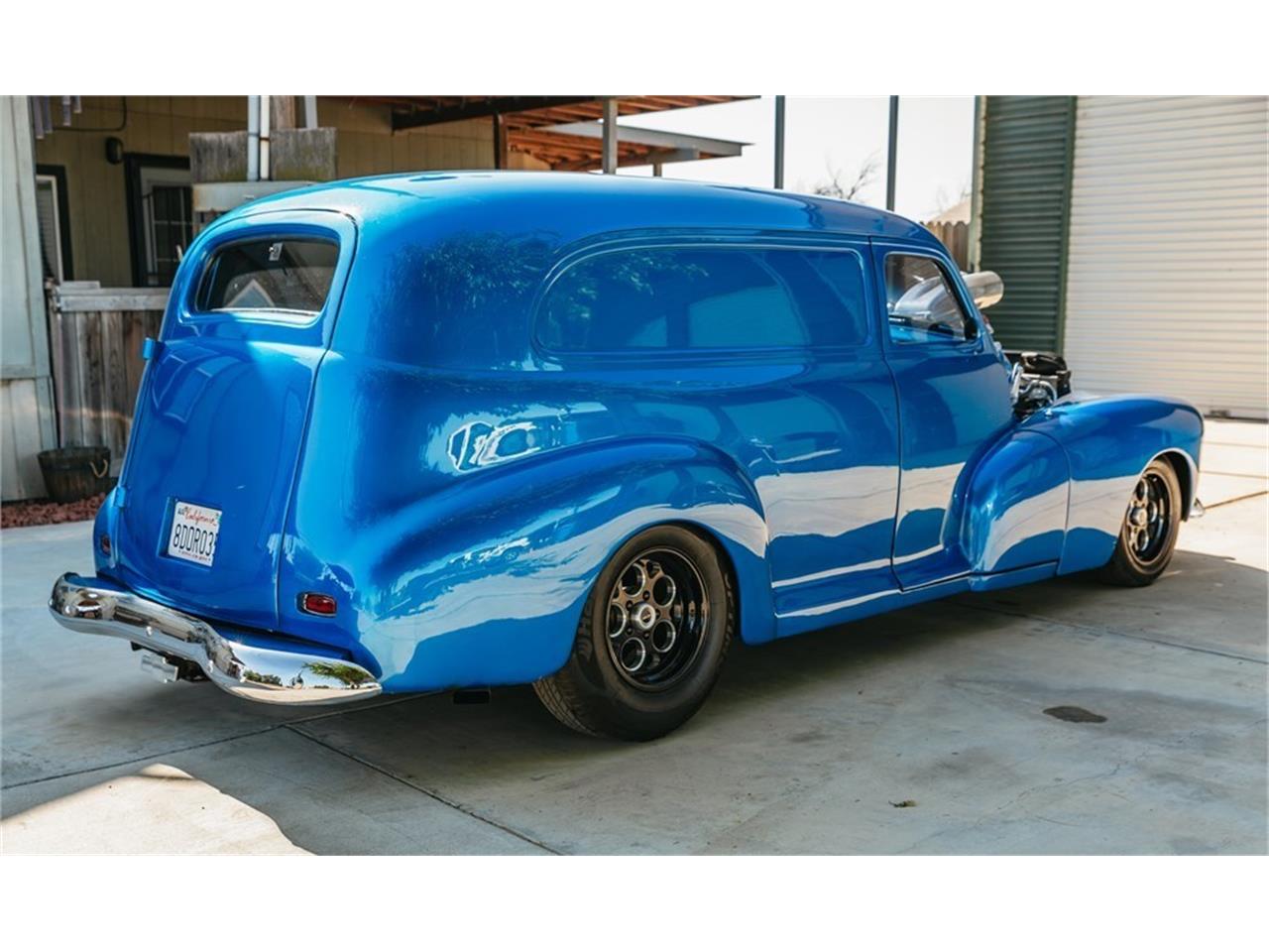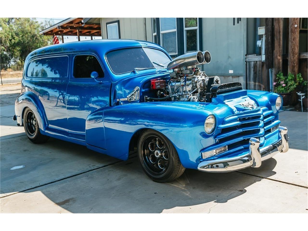 This 1947 Chevrolet Sedan Delivery has several rebuilt parts, including the 383ci stroker V8, Weiand 6-71 blower, dual Holley carburetors, and TH350 3-speed automatic transmission with Gear Vendors overdrive