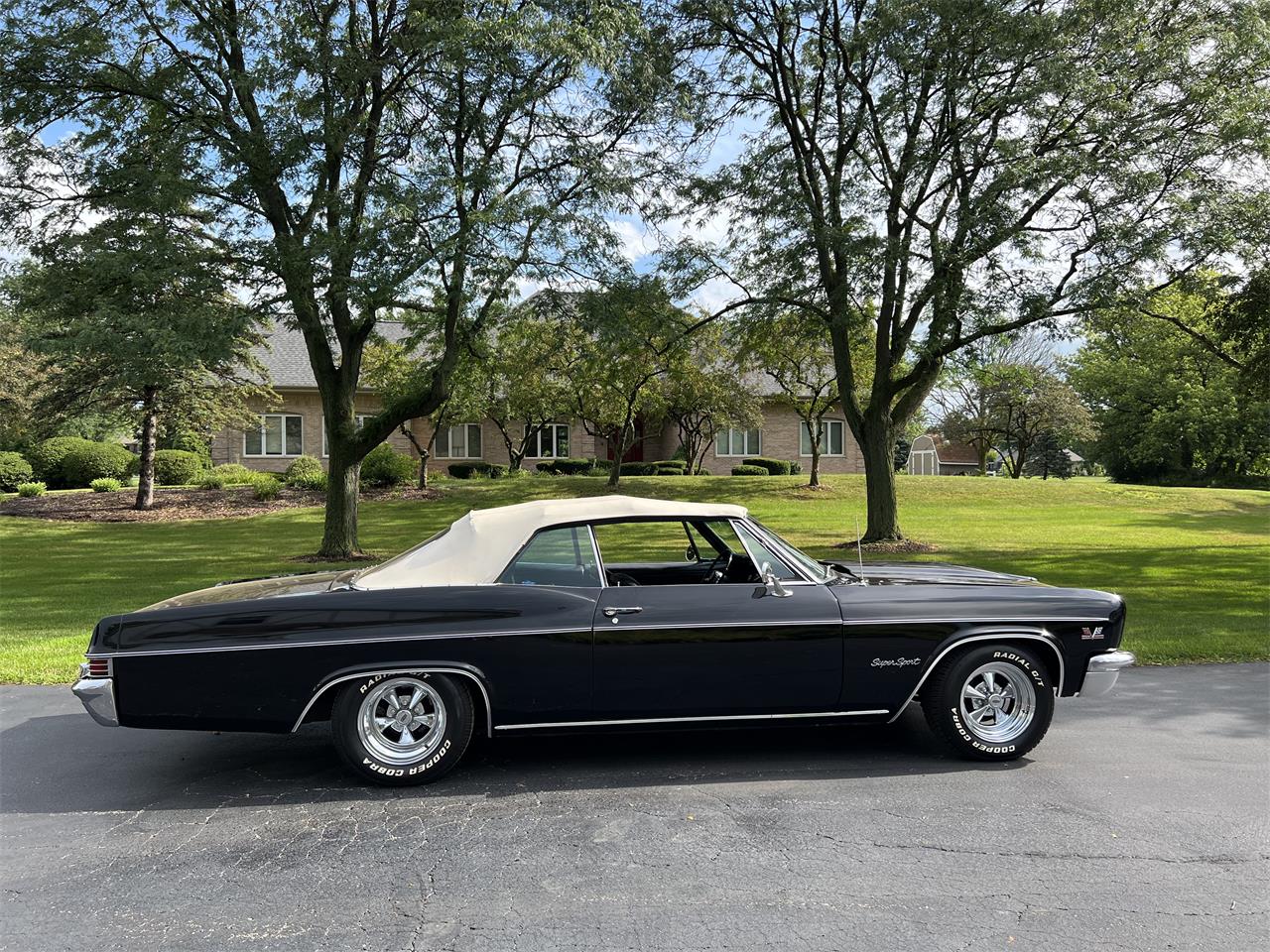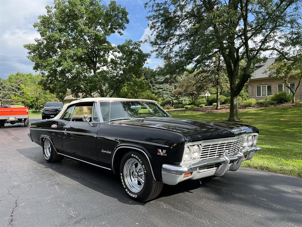 ‘66 Impala 427 SS Convertible black on black, 502 Ram Jet fuel Injected Chevy Crate engine, 700 R4 Overdrive auto trans, Ford 9” Rear End, adjustable air ride suspension, factory AC car, excellent driver, solid body and great black paint!
