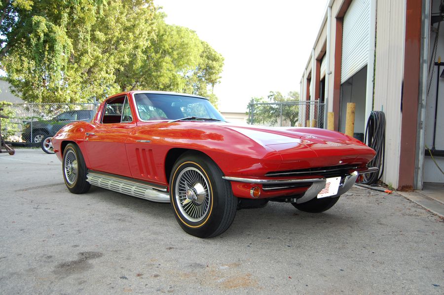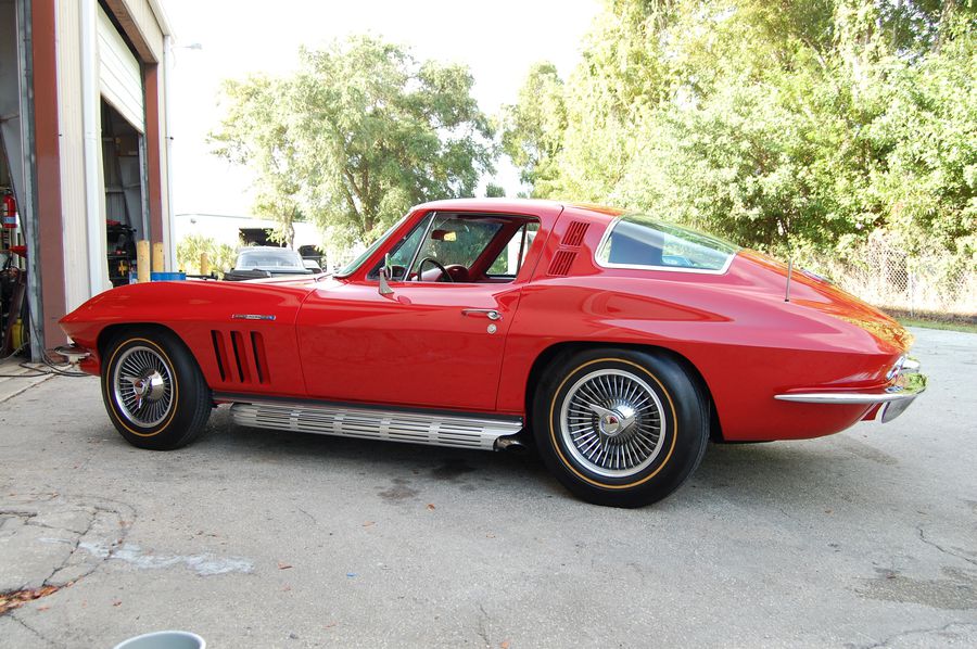 This 1965 Factory Fuelie Corvette has received a comprehensive mechanical and cosmetic restoration, complete with its proper UU Rally red and 407 Red Vinyl interior