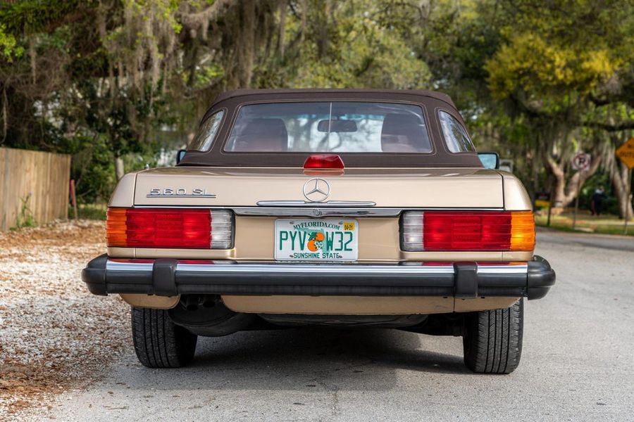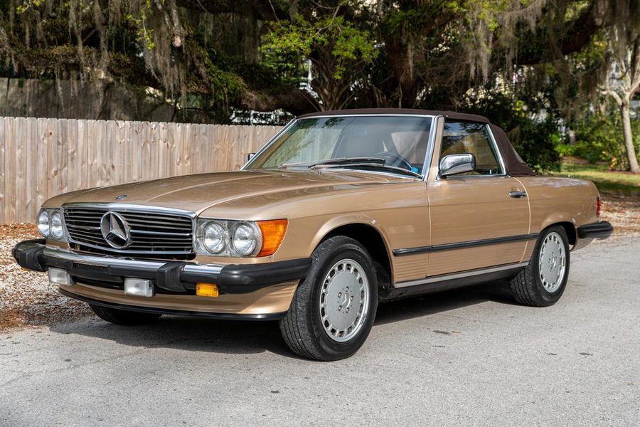 This 1986 Mercedes-Benz 560SL is finished in Champagne Metallic over tan leather and is powered by a 5