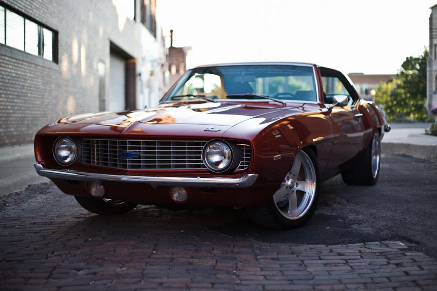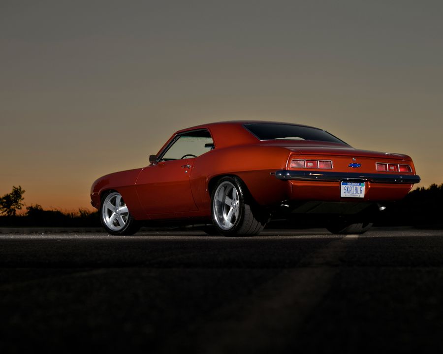 1969 Pro-Touring Camaro Trixster orange metallic paint by Keith Strong (formerly Ice Nine Customs) DSE Speed 1 front suspension installed by B and B Classics DSE Quadralink rear suspension installed by B and B Classics DSE mini tub and sub frame connectors installed by B and B Classics Hydratech Hyroboost brake system Baer Track brakes – rotors drilled and slotted Boze Flyte forged wheels – 18x12