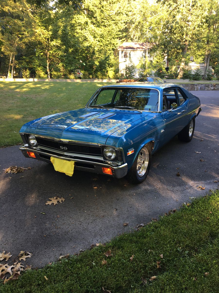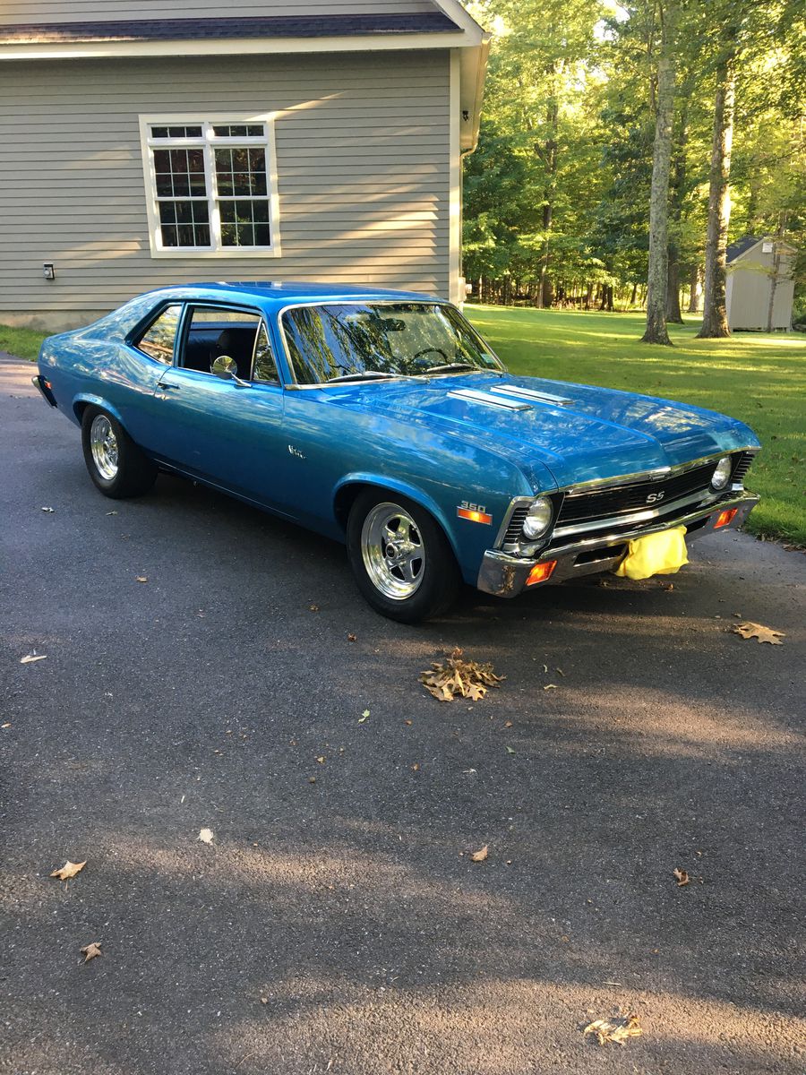 1972 Nova SS, Marina blue w/black buckets. 1969 corvette l-46 motor built to Lt-1 specs. new Auto Gear M-22 wide ratio transmission w/Hurst super shifter.