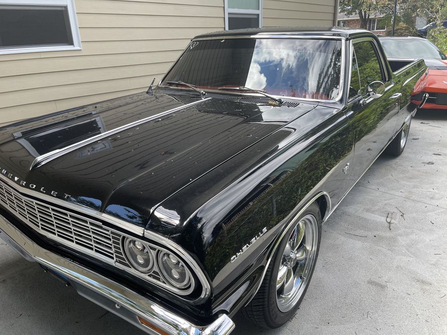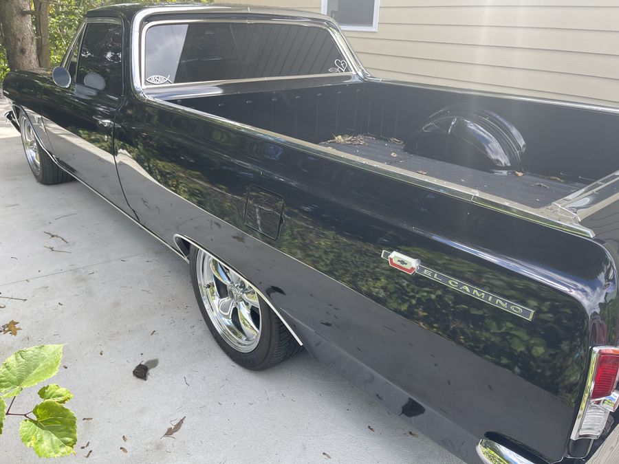 A completely redone 1964 Chevrolet El Camino Chevelle Completely rebuilt 327 V8 engine with upgraded auto transmission AC was recently added New carpet door panel roof panels recently added New red vinyl seat was recently added with center console ans radio with Bluetooth and back up camera has been added