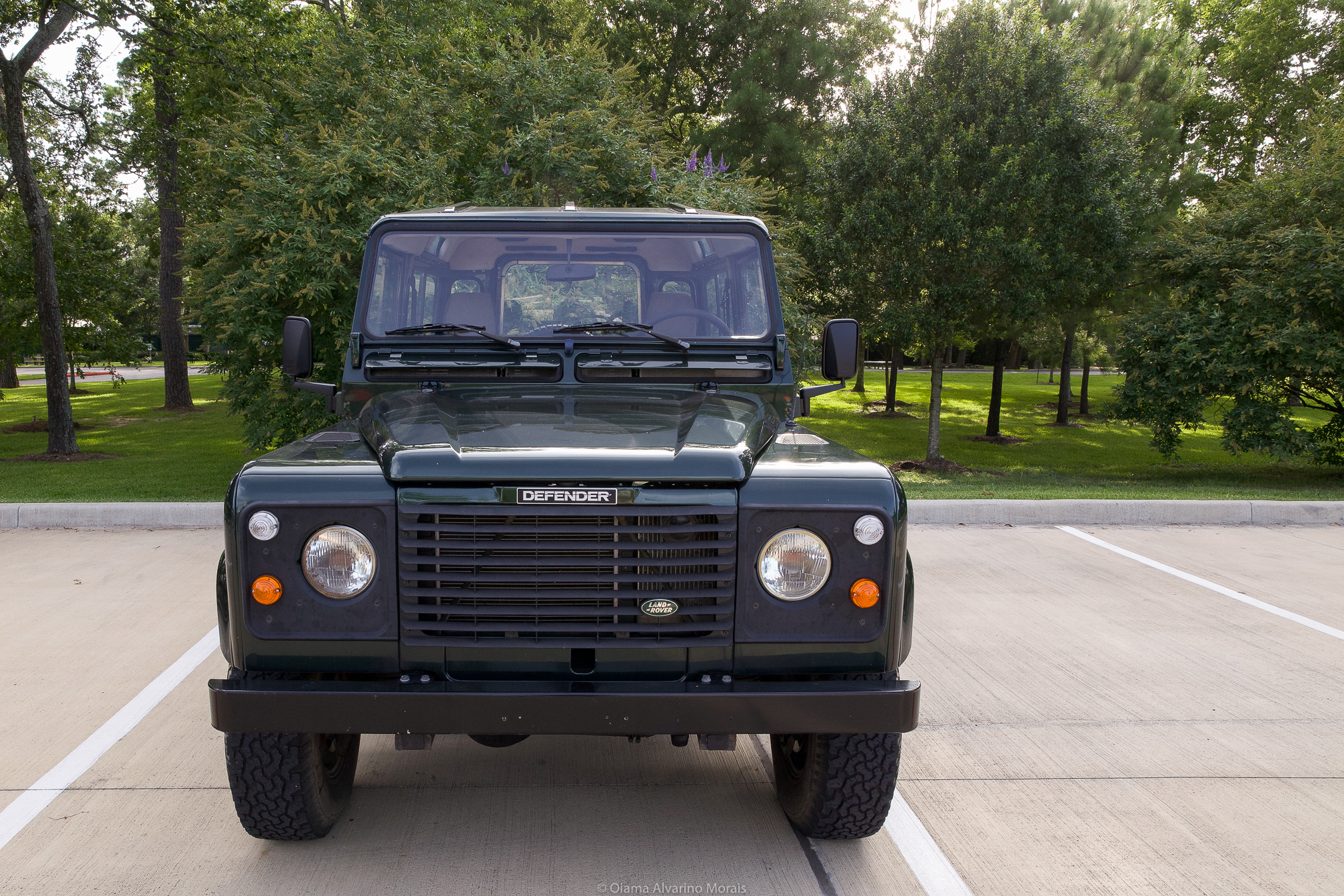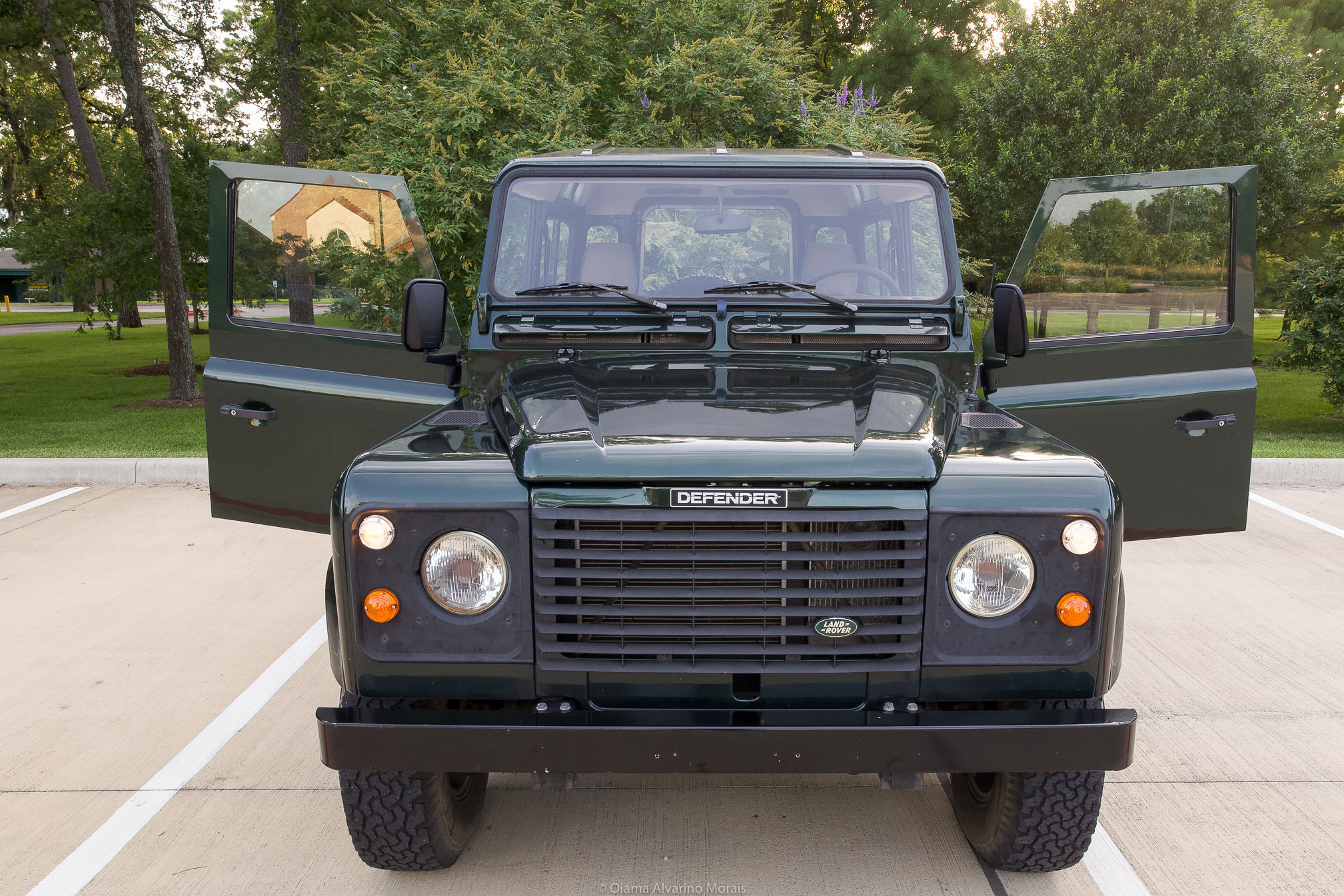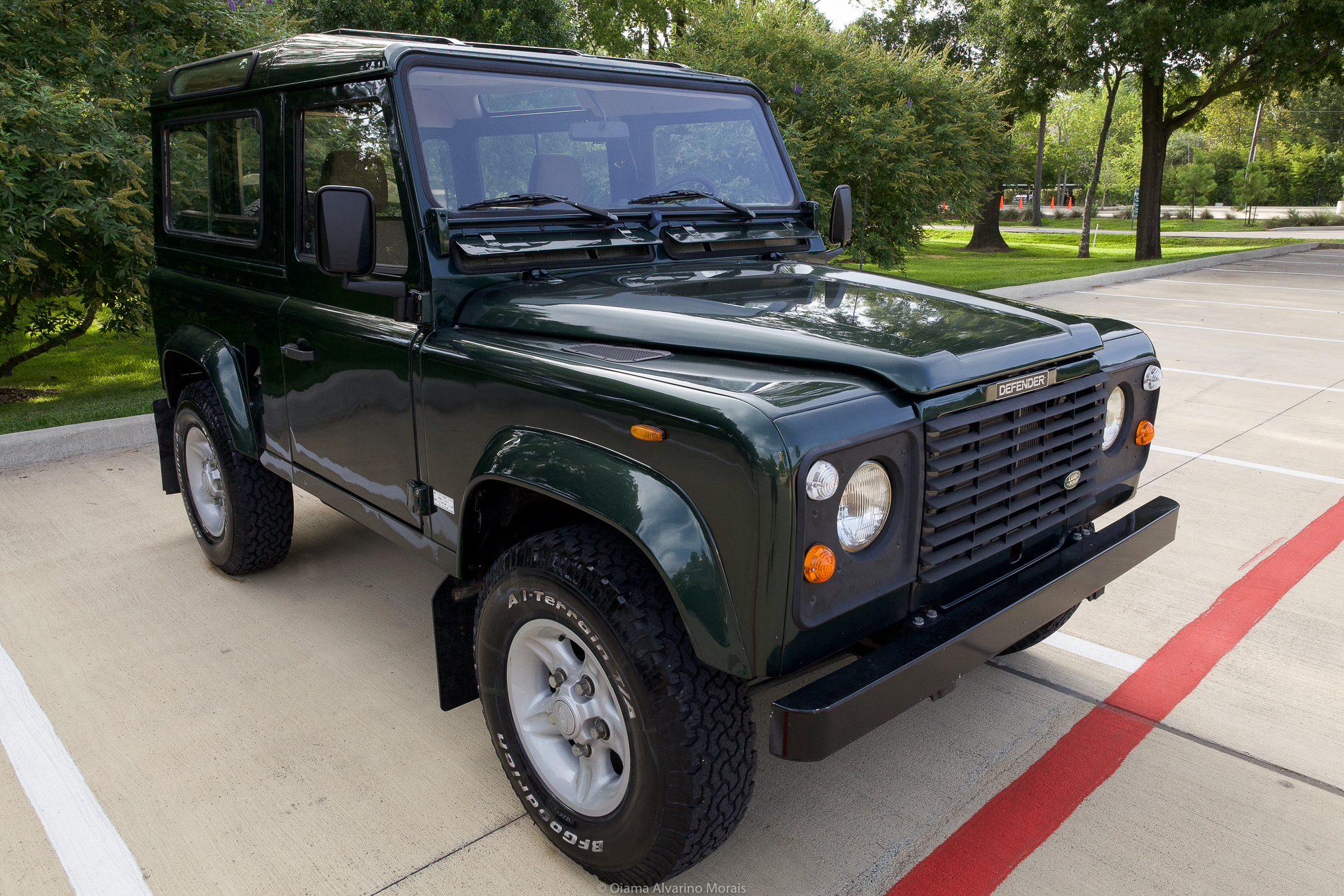 Five-spoke 16″ alloy wheels from a later Land Rover are shod with BFGoodrich All-Terrain T/A KO tires, and a spare wheel with a Michelin tire is mounted to the tailgate. A Defender 90 script has been added above the right taillight, and a French commercial vehicle data tag is affixed to the right fender.