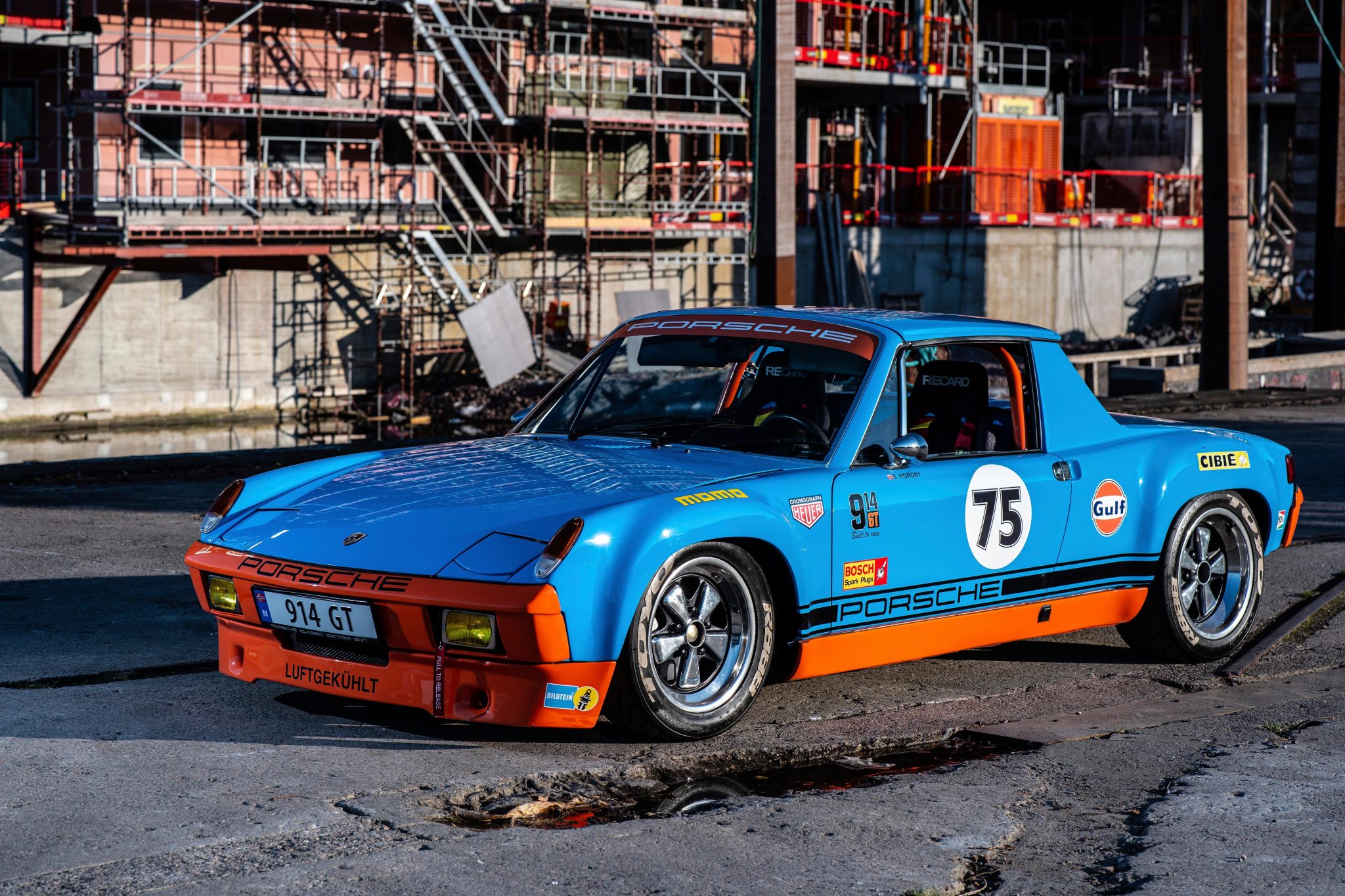 Staggered-width 16” Fuchs alloy wheels feature polished lips and spokes and are wrapped in white-letter Toyo Proxes R888 tires sized 205/55 up front and 245/45 out back. Stopping power is provided by four-wheel discs with front calipers reportedly sourced from a Porsche 911SC. An upgraded master cylinder has been installed, and additional suspension and chassis modifications include the following: