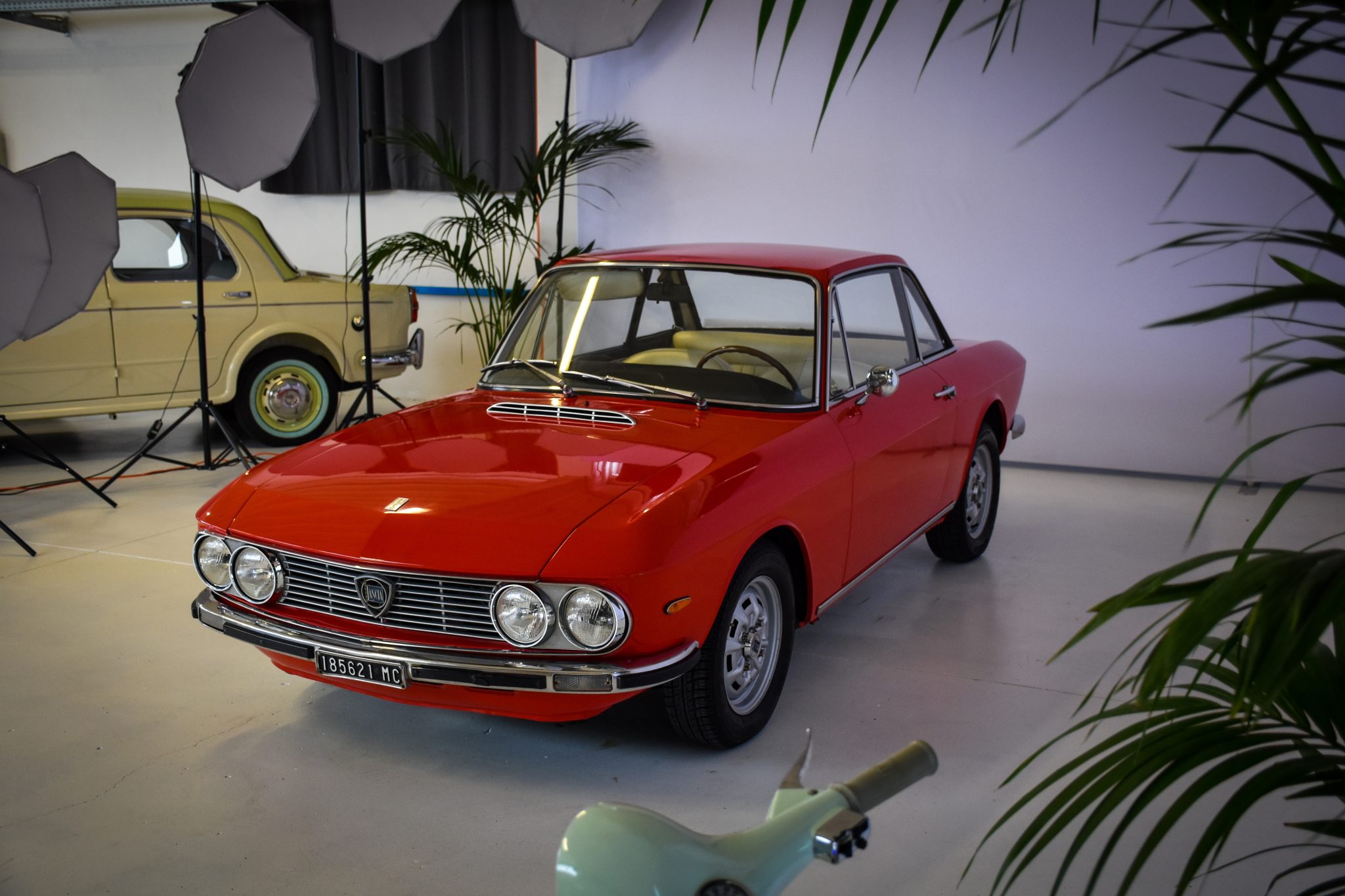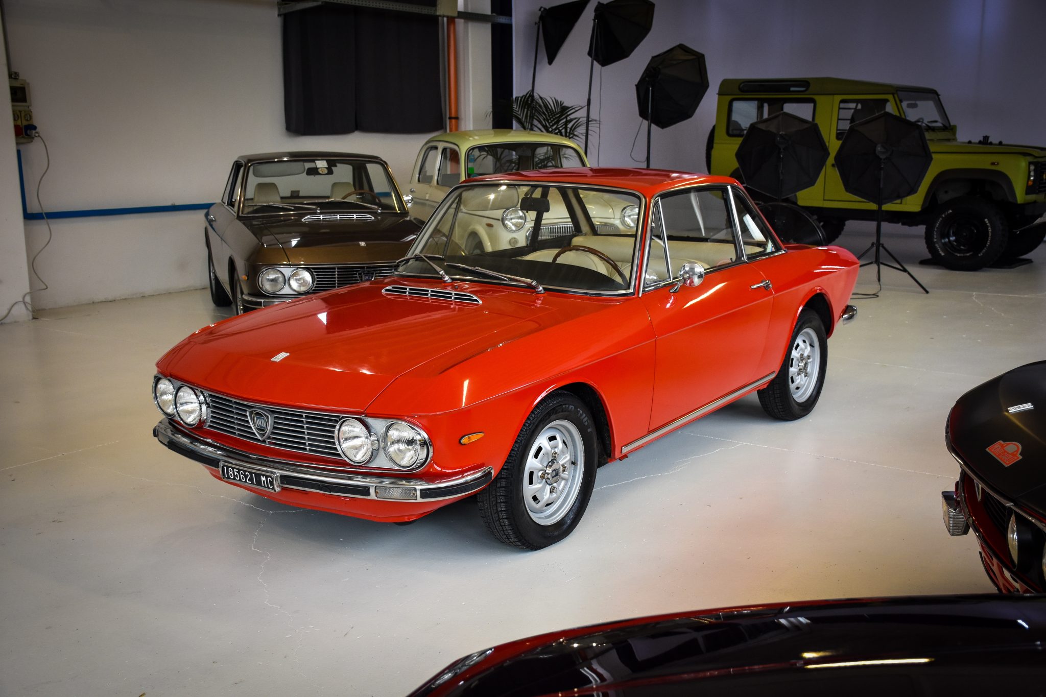 Silver-painted 14″ steel wheels are fitted at each corner and wear Lancia center caps. A spare is mounted in the trunk.
