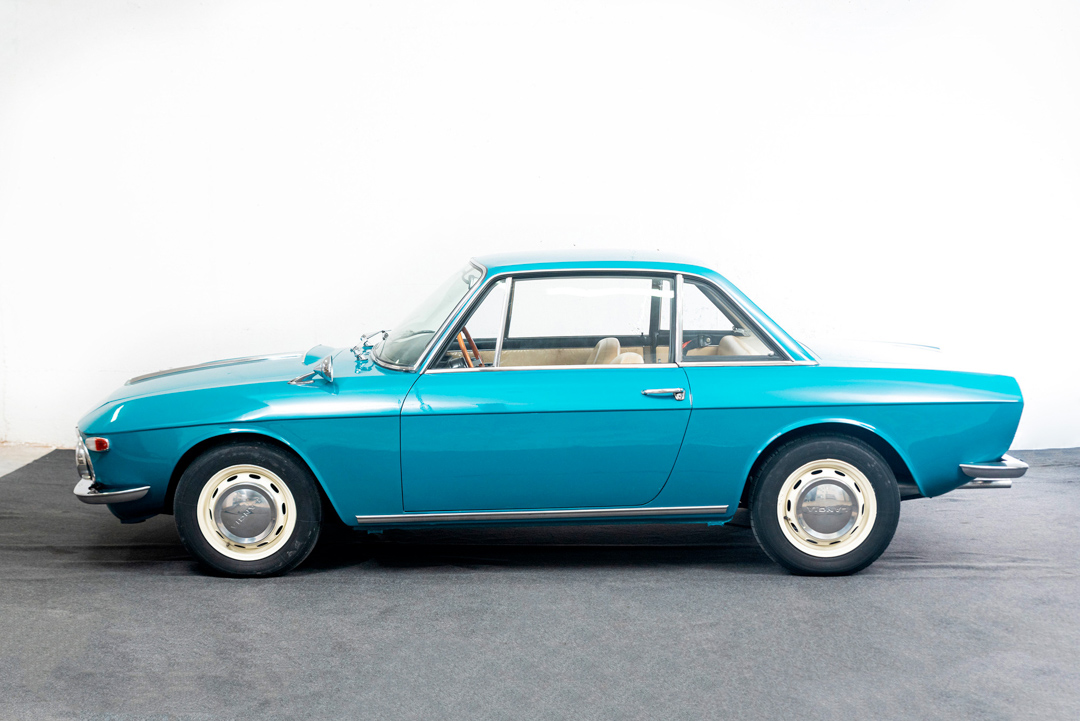 Cream-colored 14″ steel wheels with polished Lancia hubcaps are wrapped in 145-series Michelin tires. The suspension bushings were replaced and the steering box was refurbished in early 2021.
