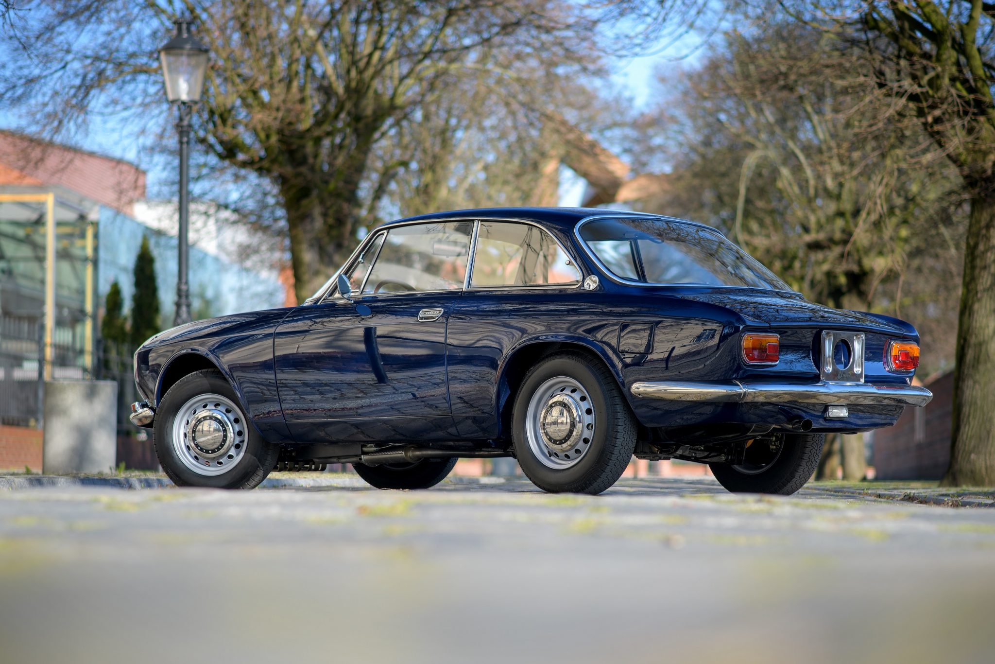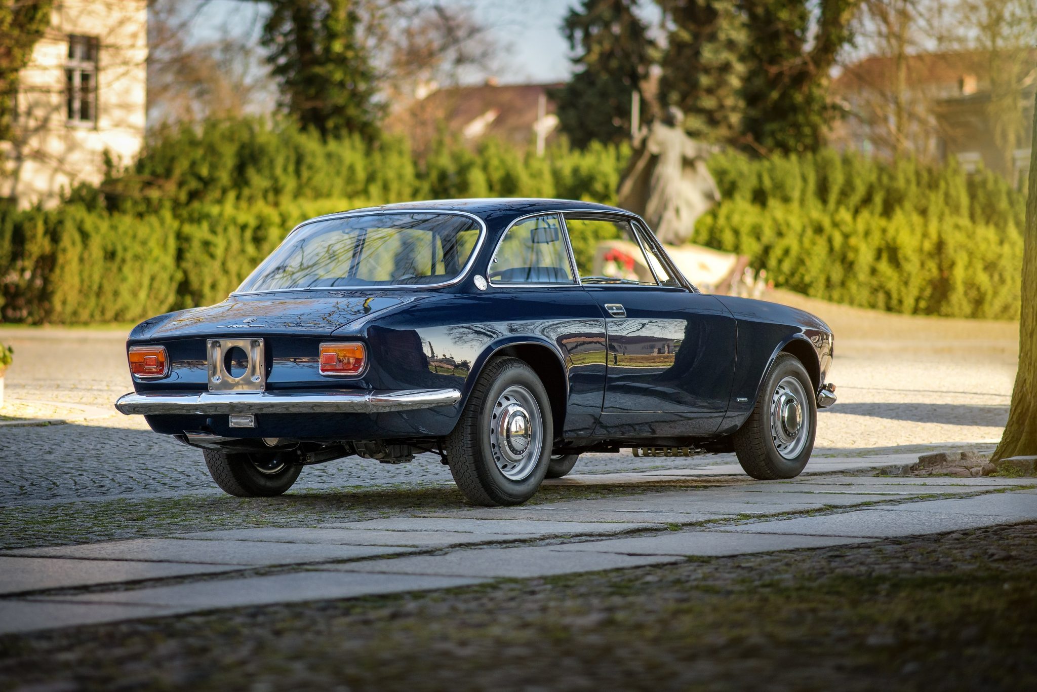 Silver CMR 14″ steel wheels are secured via brass lug nuts and wear chrome Alfa Romeo hub caps and 165-width Pirelli Cinturato tires. A matching full-size spare, a tool roll, and a refurbished Battaini jack are located in the trunk. Braking is handled by servo-assisted four-wheel discs.