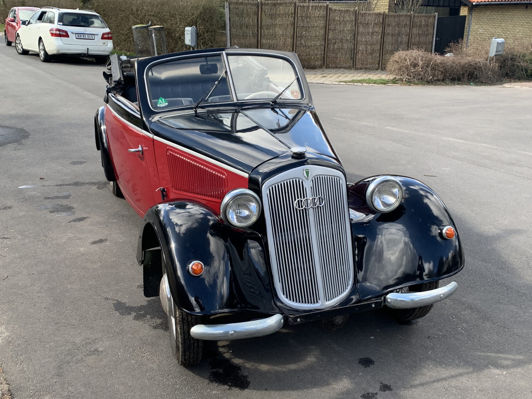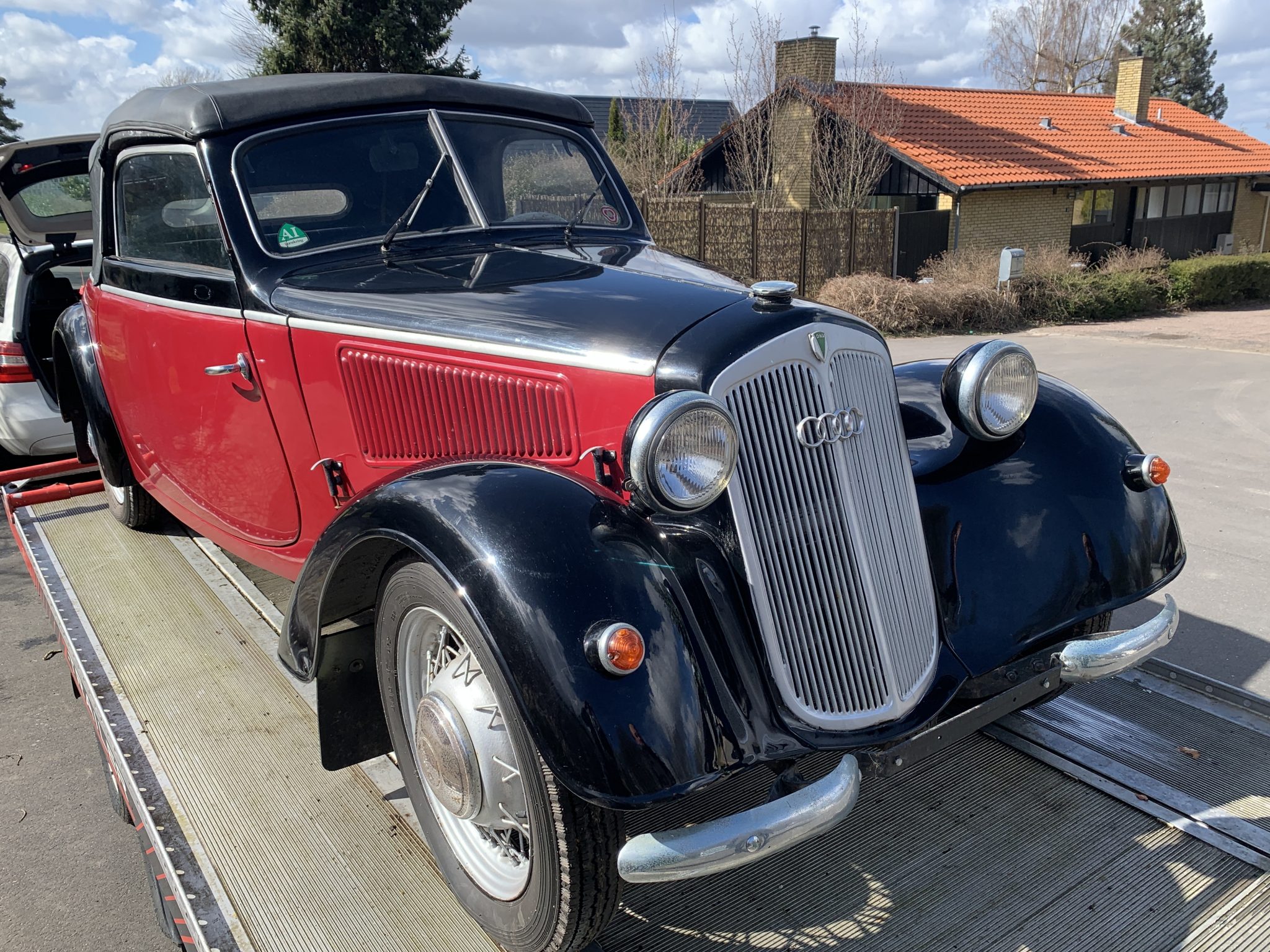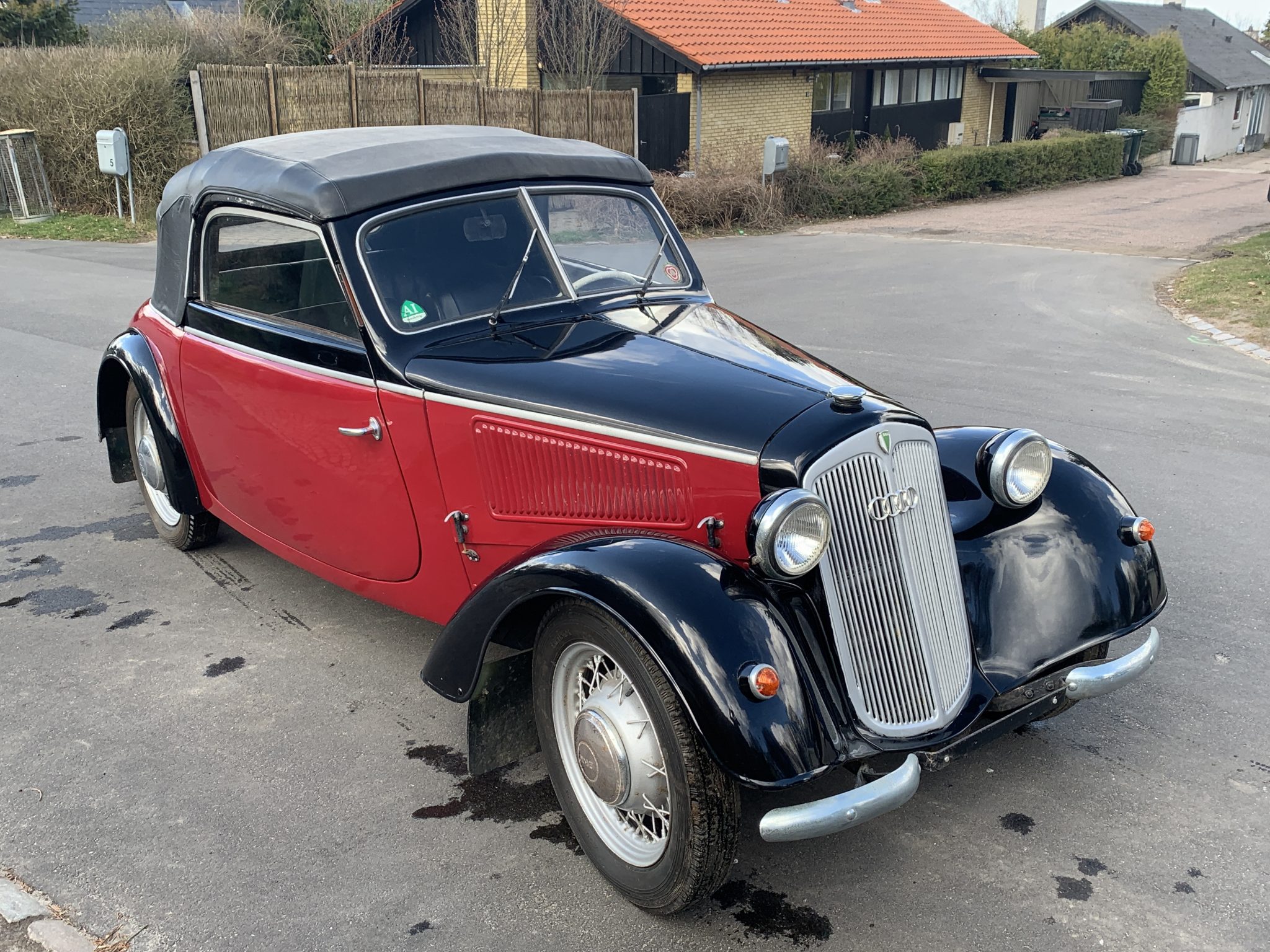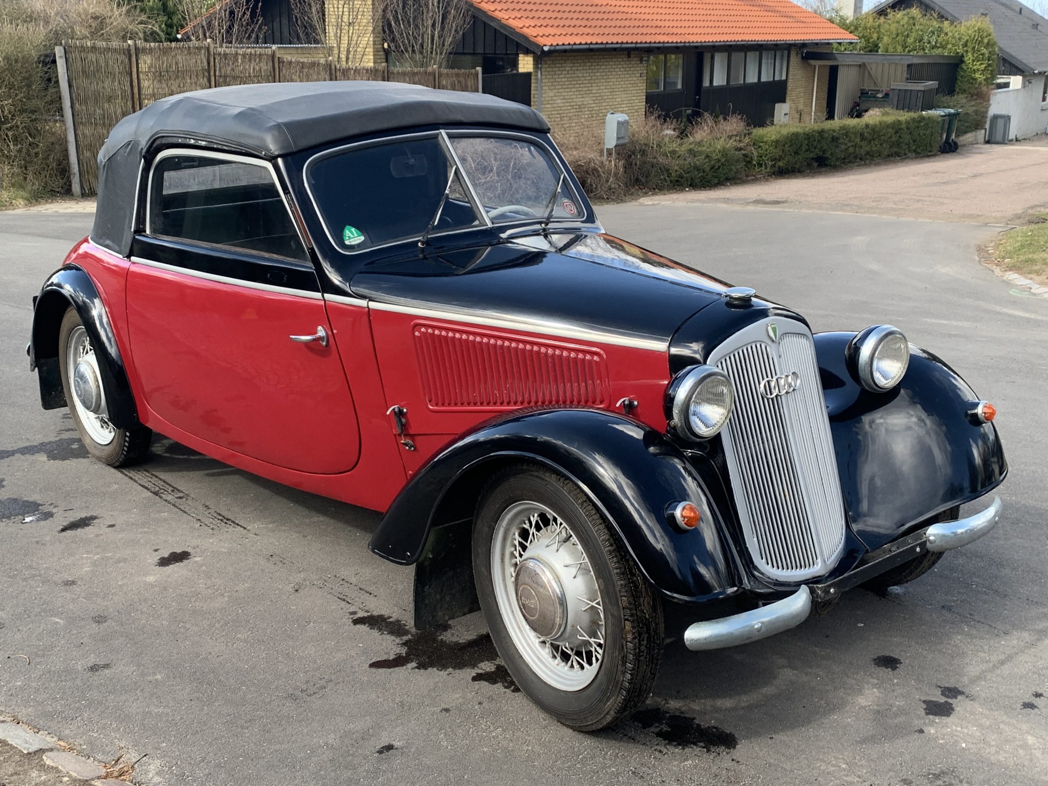 17” wire wheels wear DKW-branded hubcaps and are fitted with Excelsior tires. A matching spare is mounted to the rear of the car. A tear is noted in the soft top above the rear window.