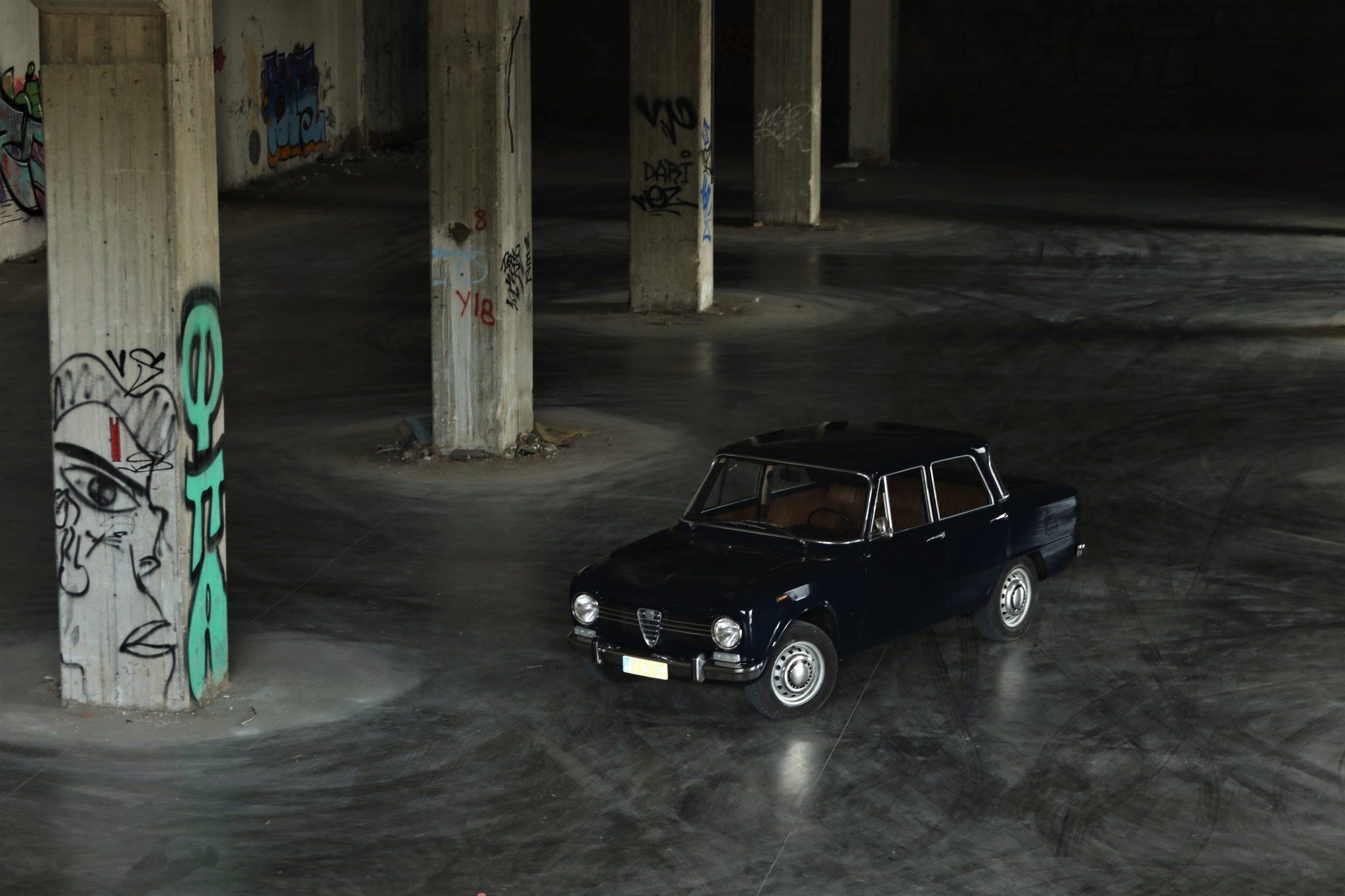 Painted 14″ steel wheels wear polished Alfa Romeo hubcaps and are wrapped in 185/70 Kingstar Radial H714 tires. A spare is housed in the trunk, and braking is handled by four-wheel disc brakes.