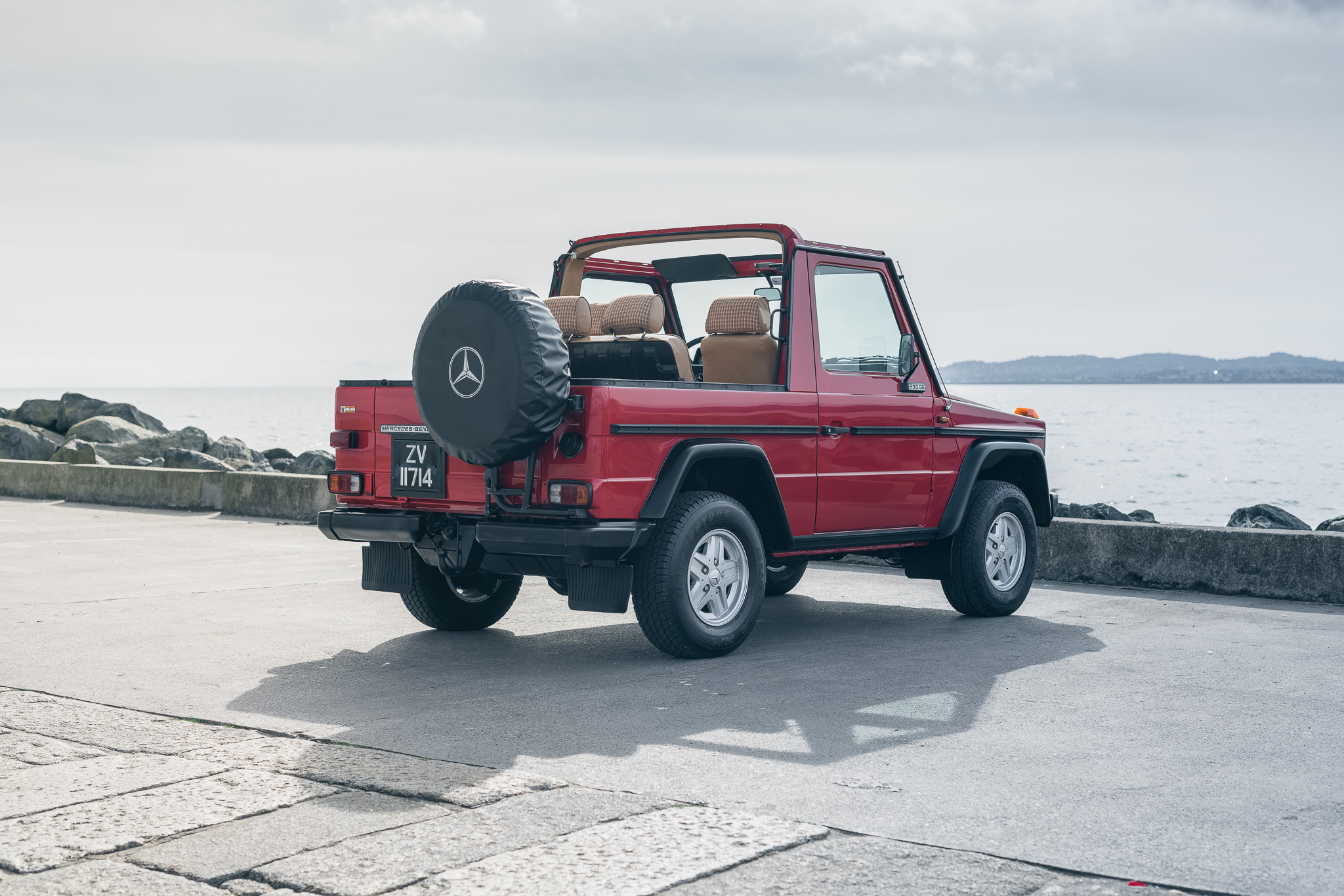Five-spoke 15” wheels wear Mercedes-Benz center caps and are mounted with 235/75 Bridgestone Dueler H/T tires. A spare wheel and tire are mounted to a swing out rear carrier, and stopping power is provided by front discs and rear drums.
