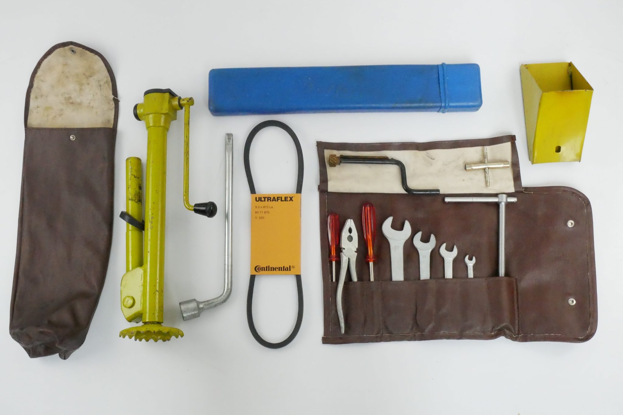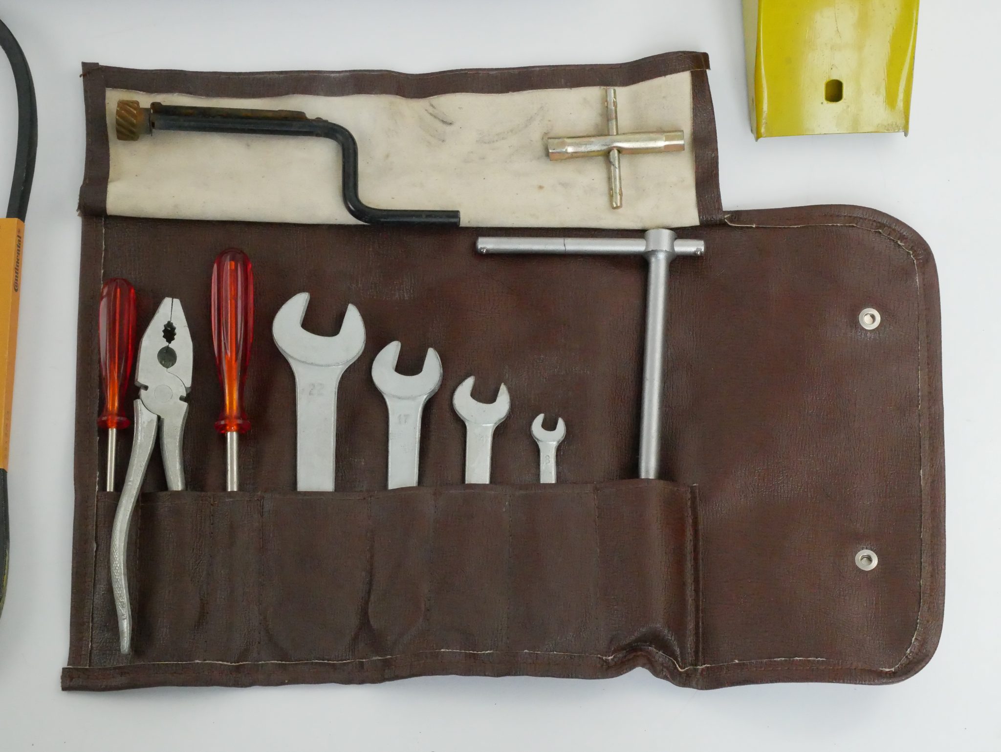 Four double open-end wrenches ranging in size from 8 to 22mm are included in the kit, along with a pair of 190mm pliers, two orange-handle screwdrivers, a lug wrench, and an emergency window crank.
