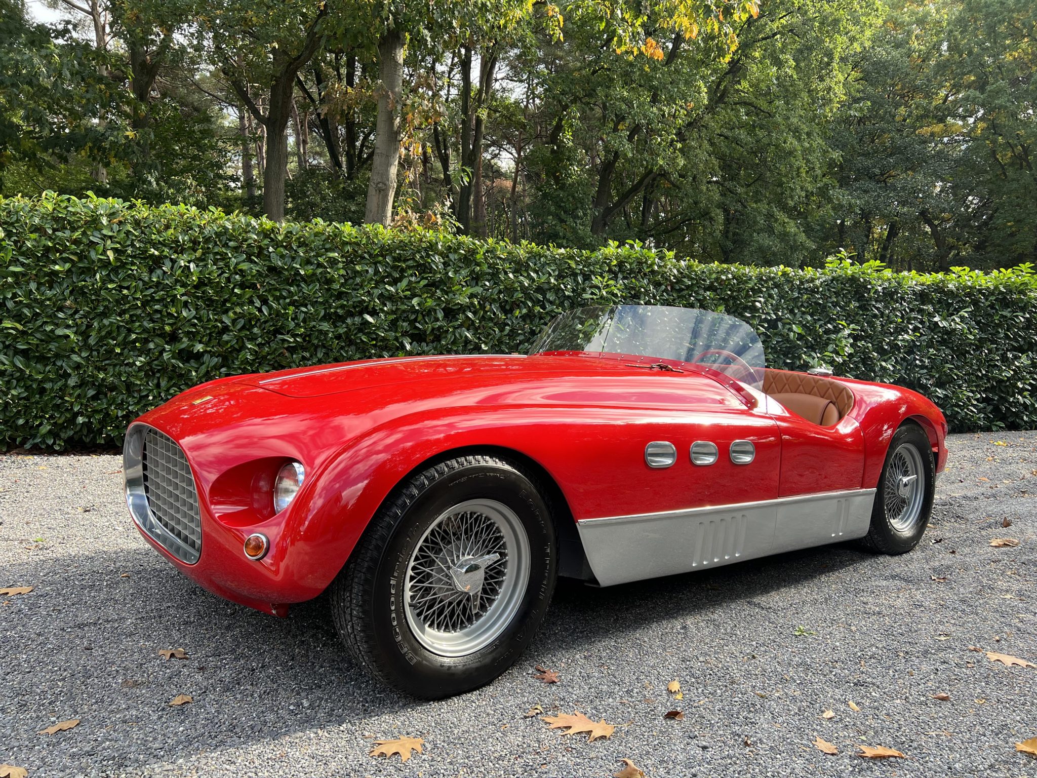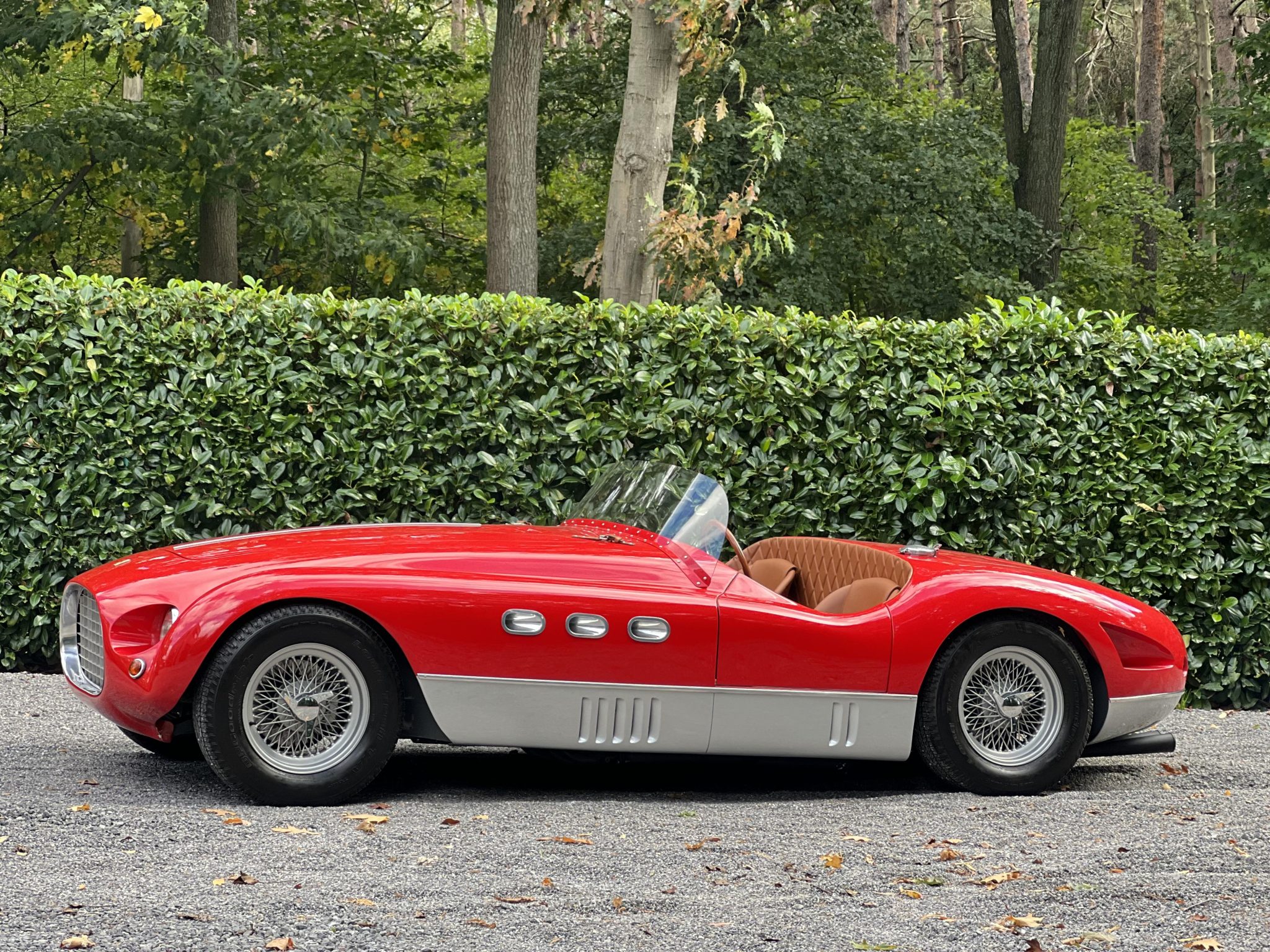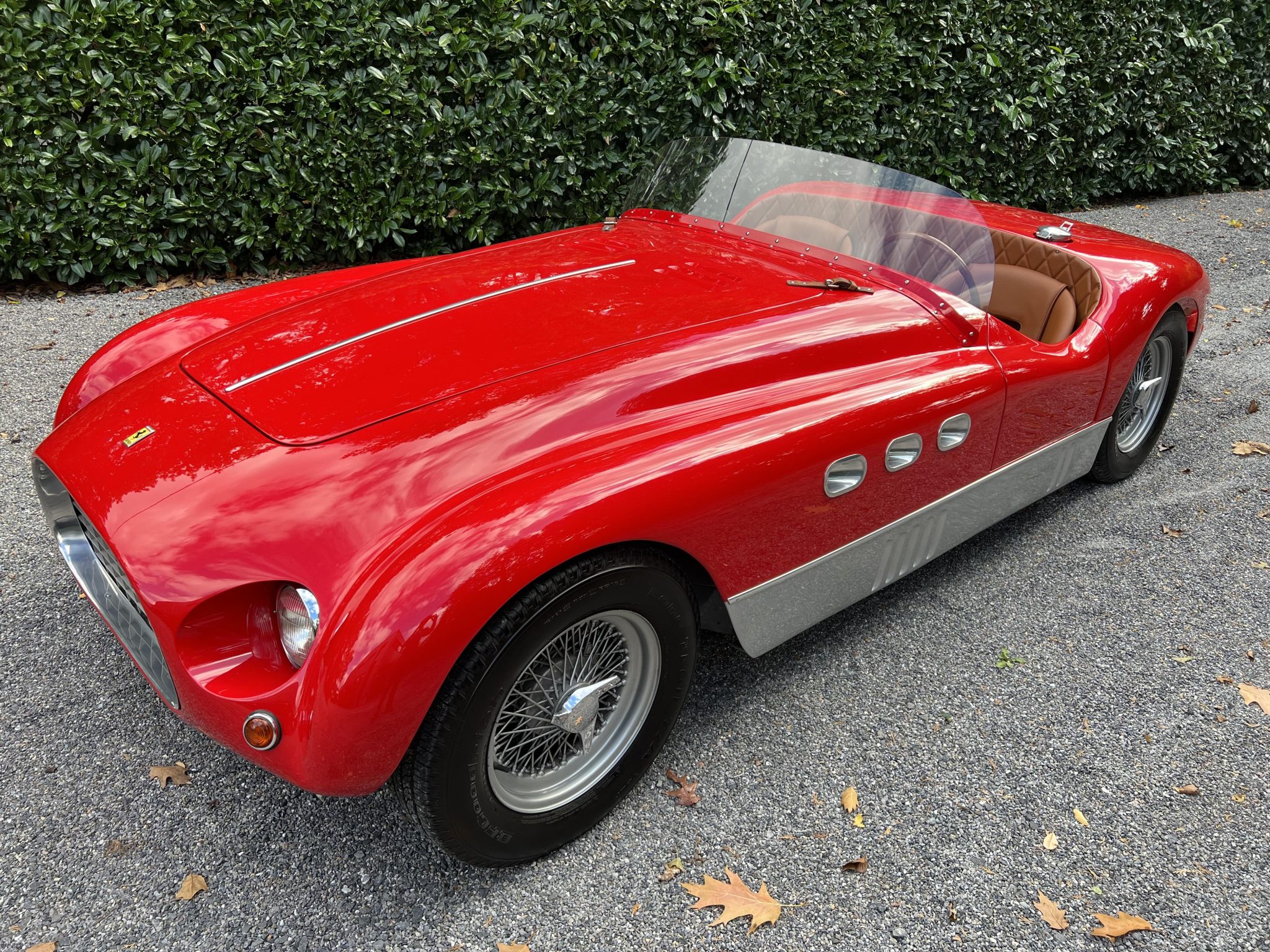 This re-creation’s aluminum body was fabricated by MC Auto Creations in the style of a Vignale spider and is finished in red with gray rocker panels. Design features include triple oval portholes in each fender, triangular ducts behind each rear wheel, a forward-hinged hood panel with louvers and leather hold-down straps, recessed headlights, a single-piece windshield, and a Monza-style fuel filler cap.