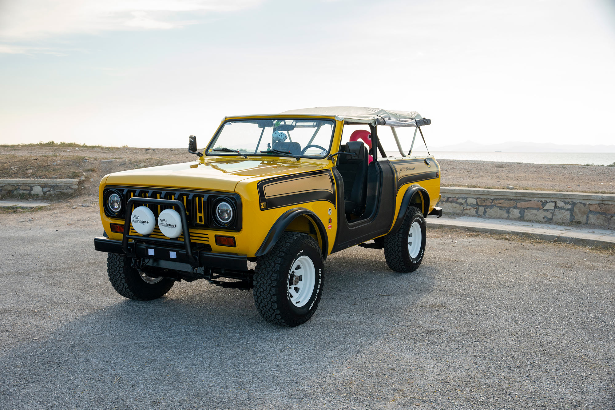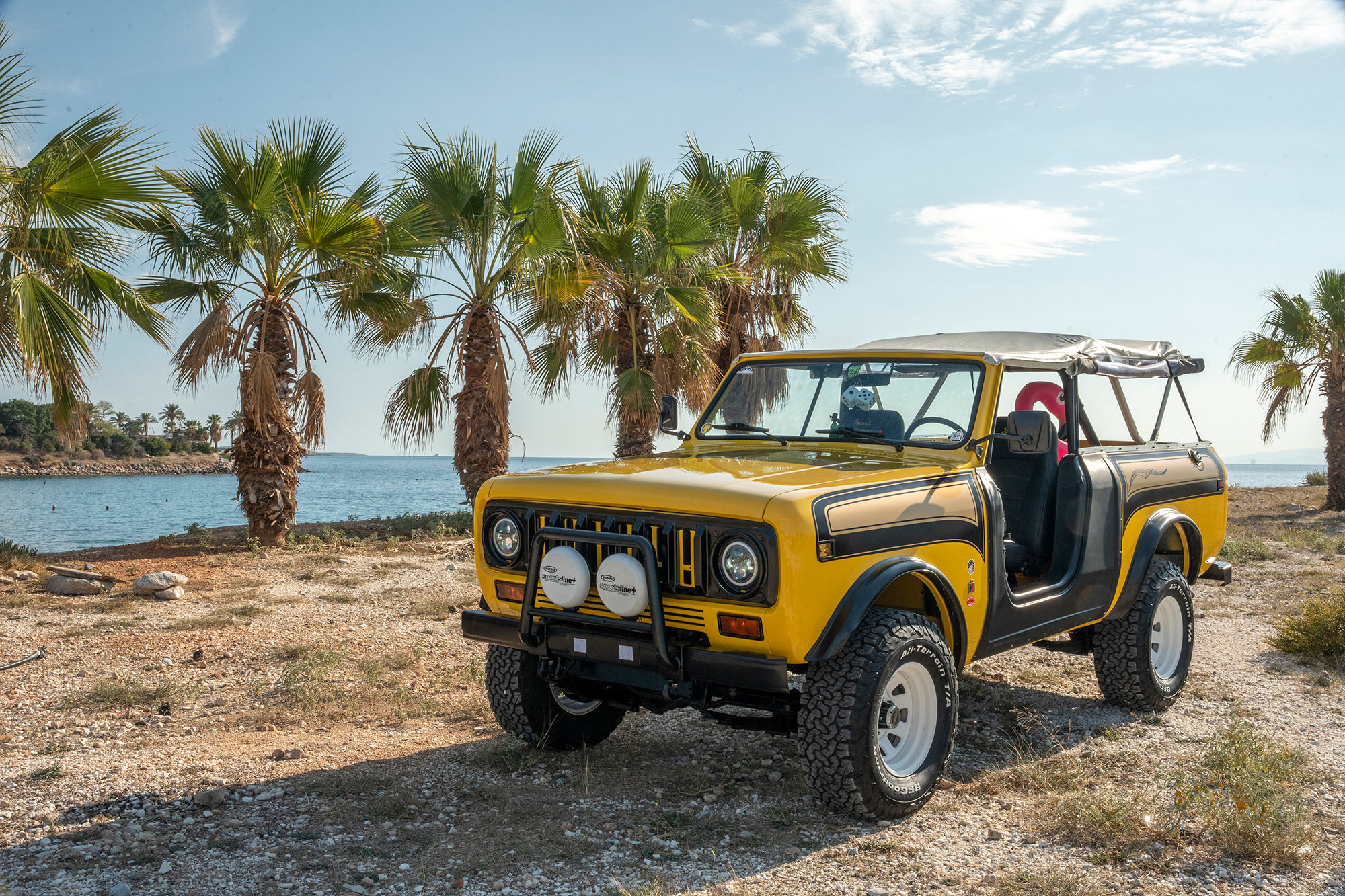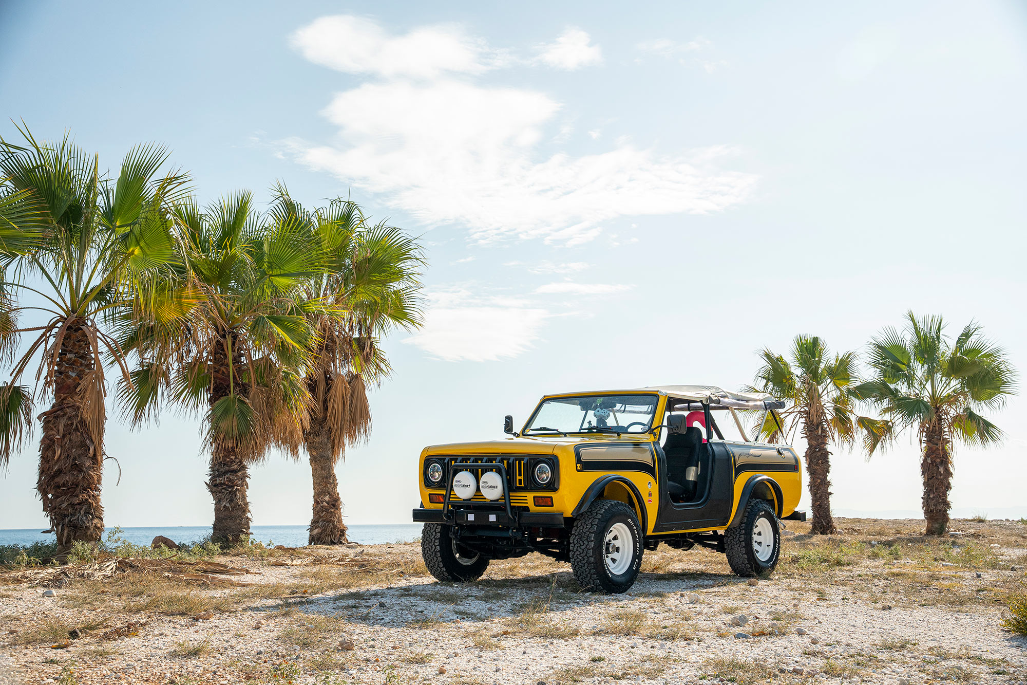 This Scout is equipped with a 3″ lift and Bilstein front dampers. White-painted 15″ wheels are mounted over manually locking front hubs and are fitted with 31×10.5″ BFGoodrich All-Terrain T/A K02 tires.