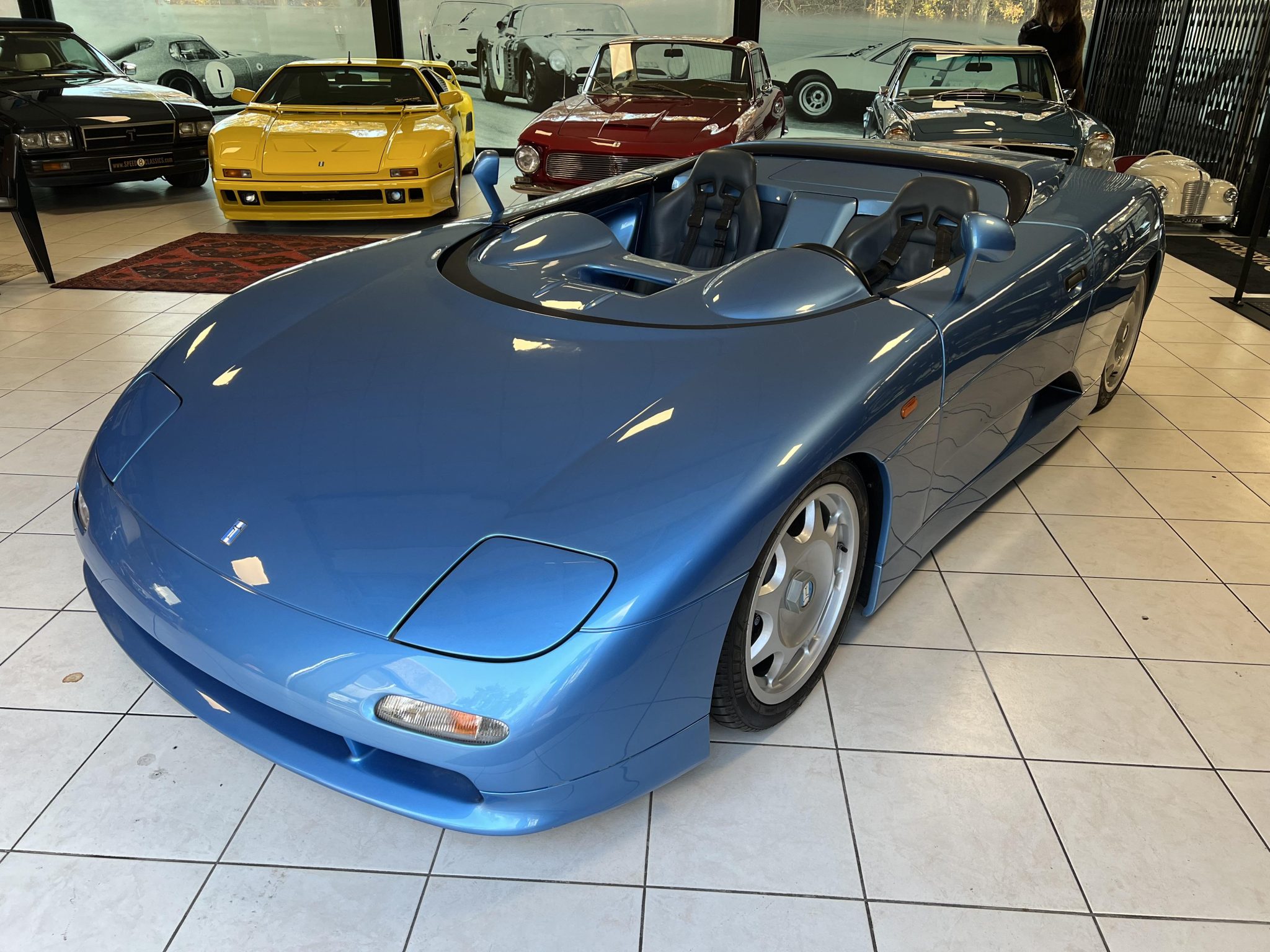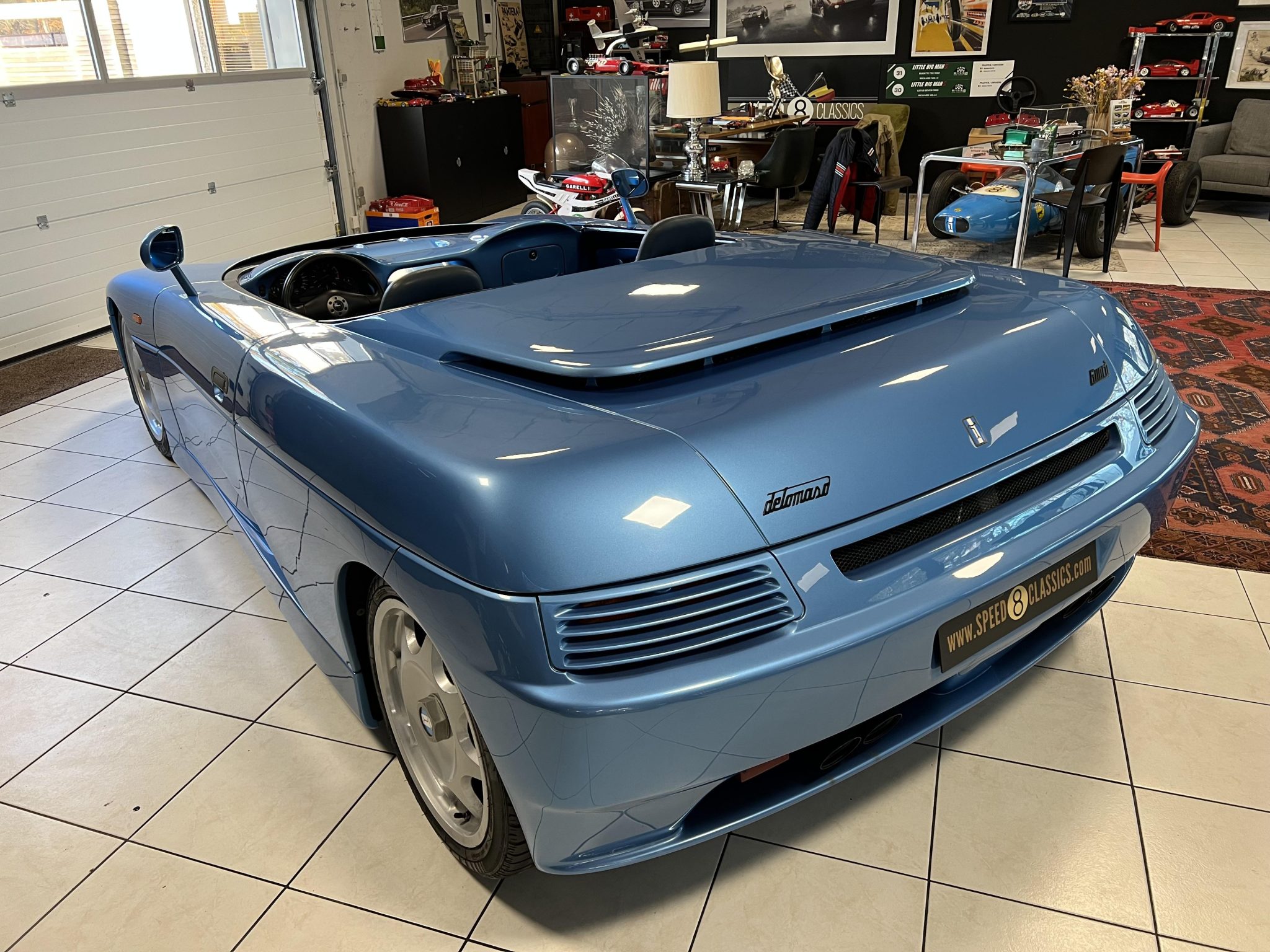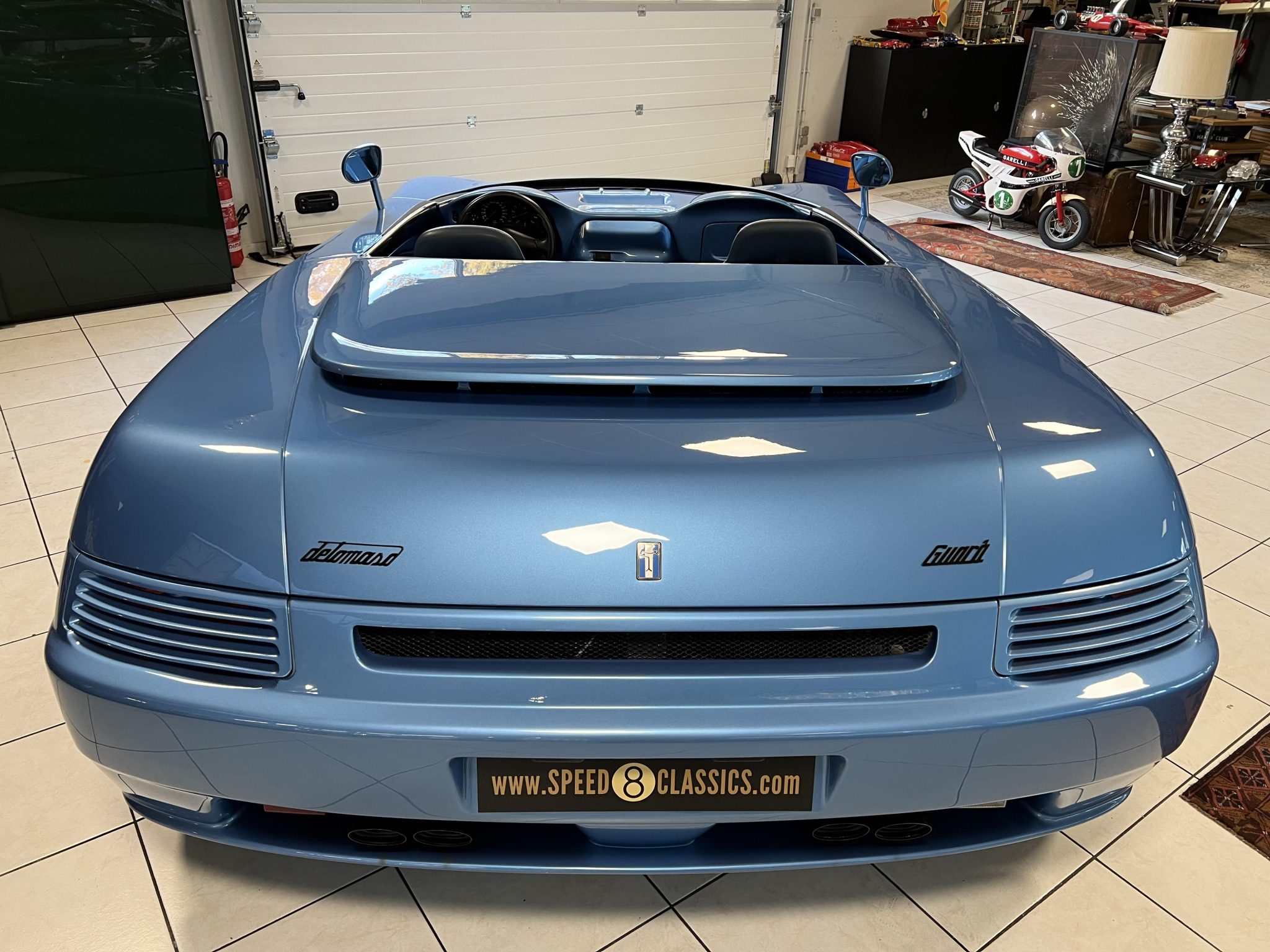 This example was delivered from the factory in Azzurro Metallizzato De Tomaso and features pop-up headlights, side marker lamps, dual door-mounted mirrors, a locking fuel door, and louvered taillights. The car is not equipped with a windshield or top.