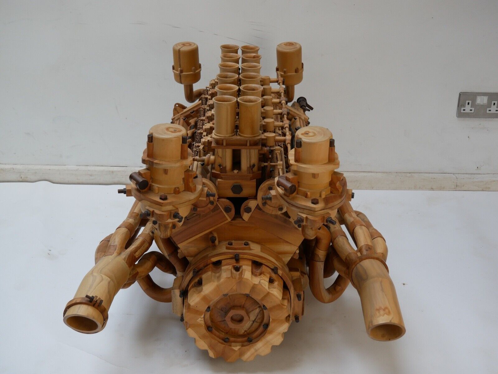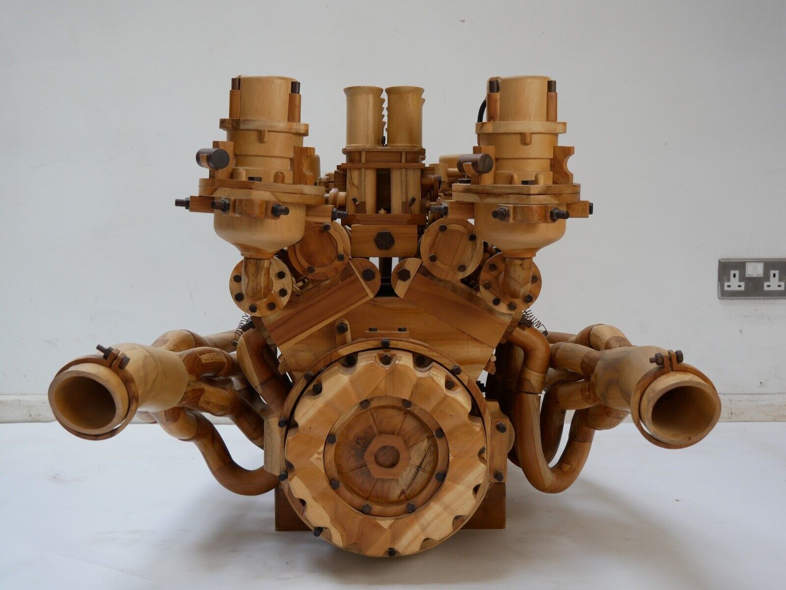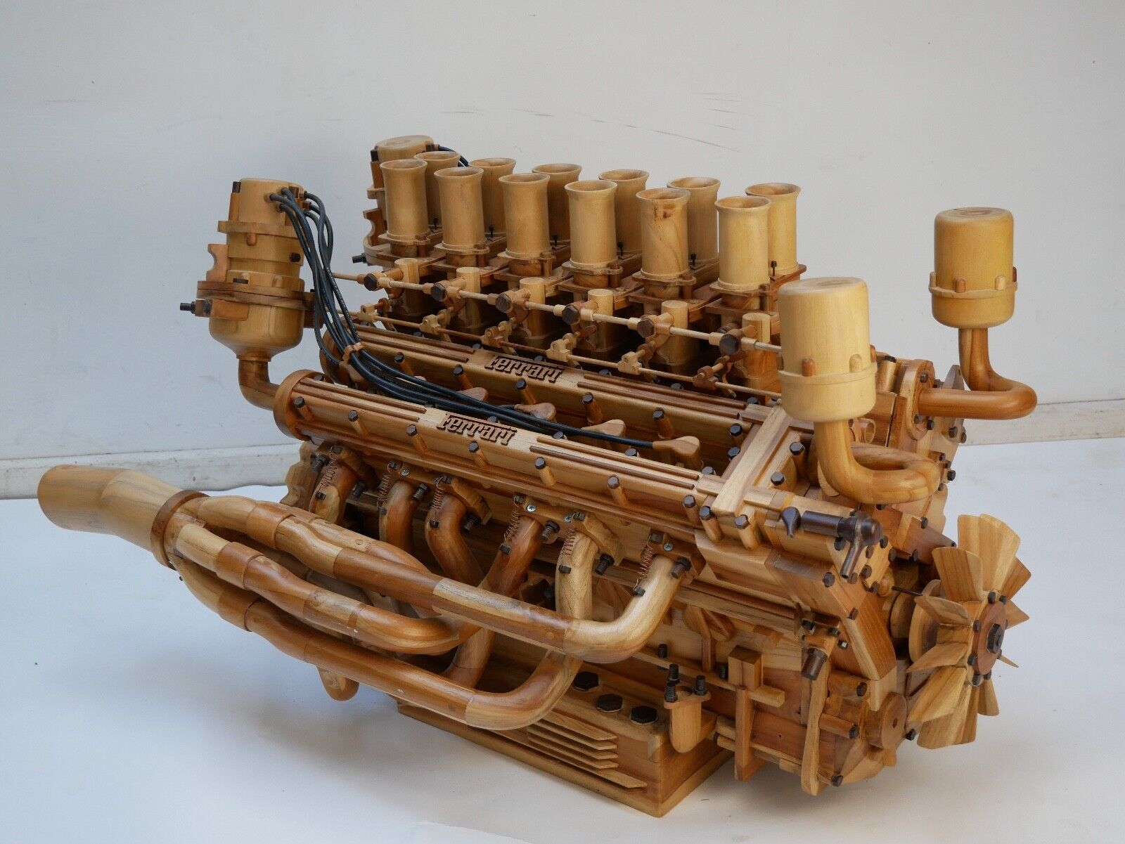 The model is topped with six sculpted carburetors along with velocity stacks and throttle linkages with coiled copper wire forming the return springs. Rubber-clad cables stand in for ignition wires connecting the spark plug terminals to a pair of faux distributors.